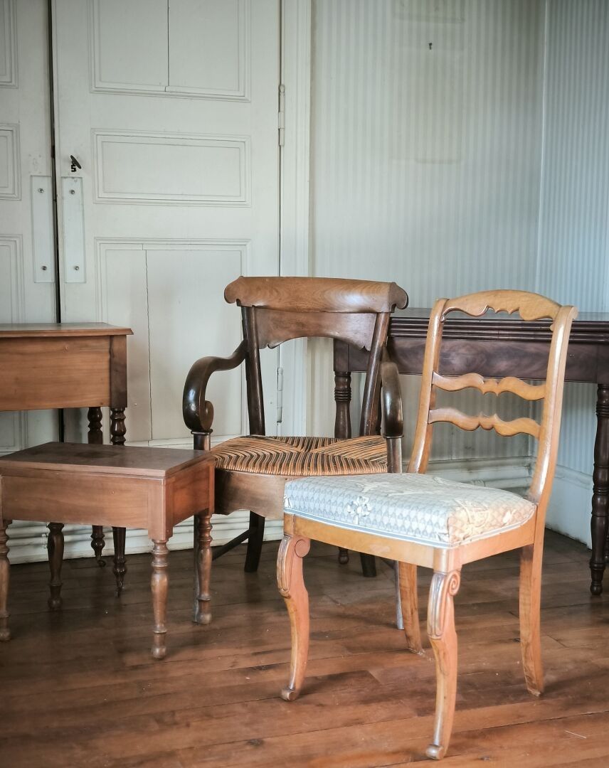 Lot (small accidents and missing pieces): a writing table, a straw armchair, a chair, a mahogany game table, an occasional table. Height from 43 to 84 cm)