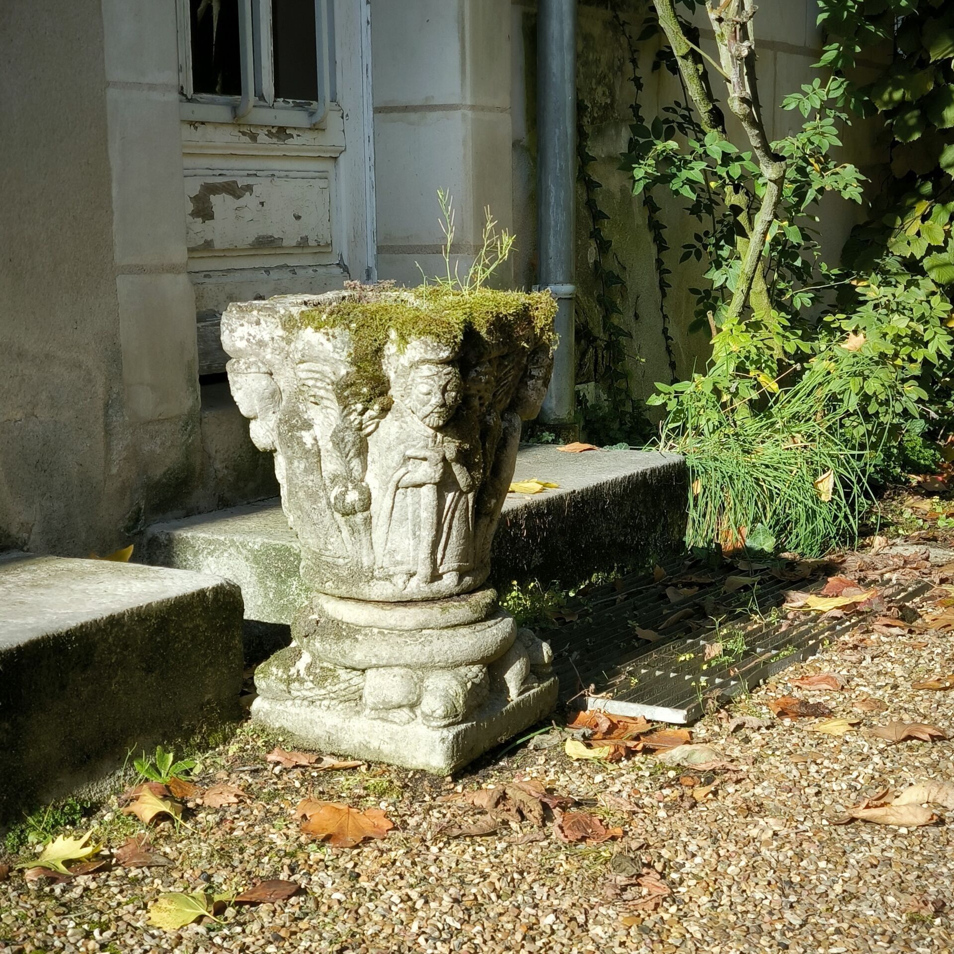A cement pot simulating capitals, decorated with figures.