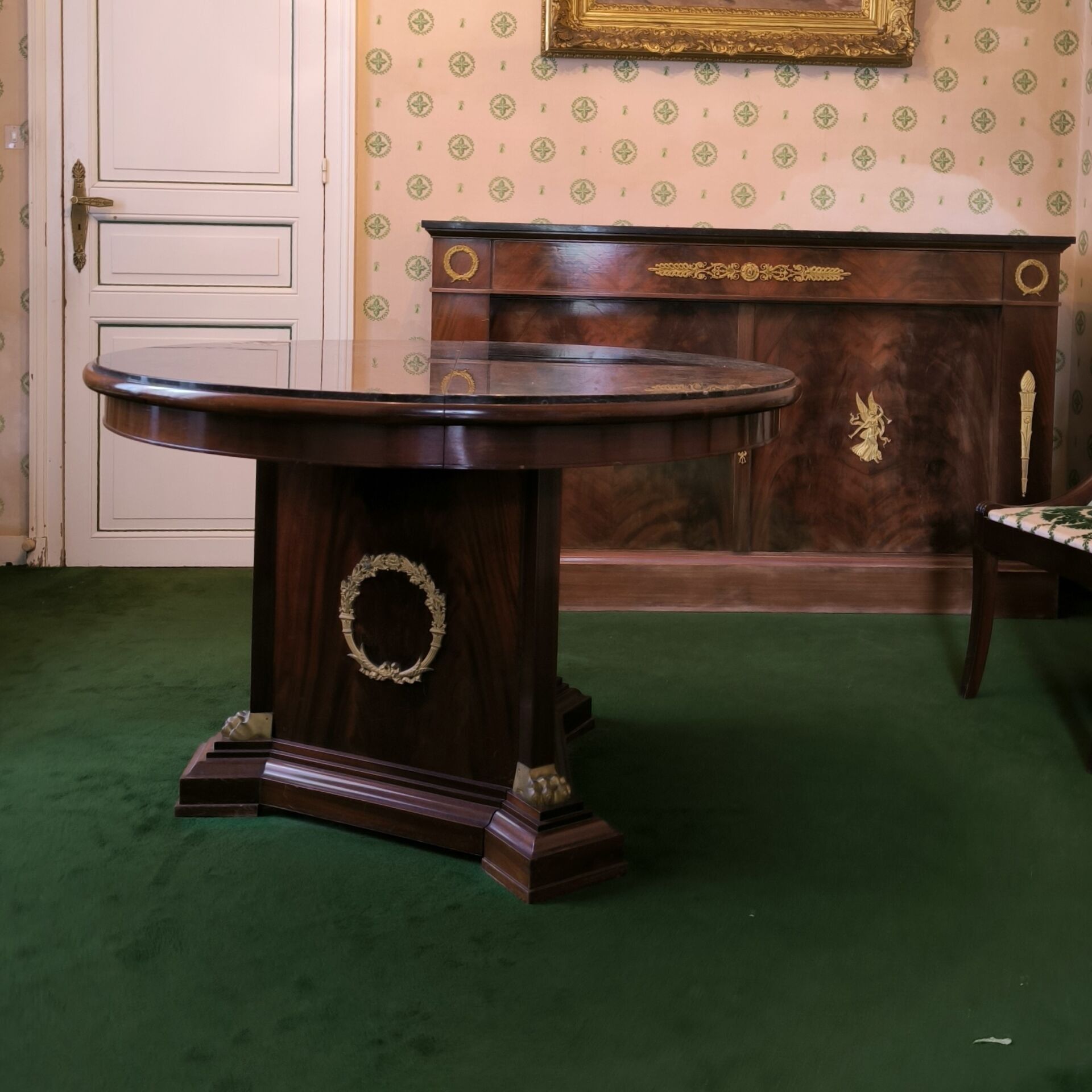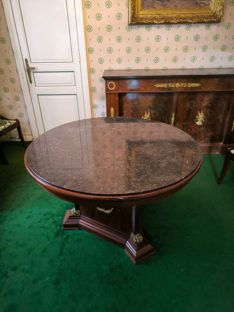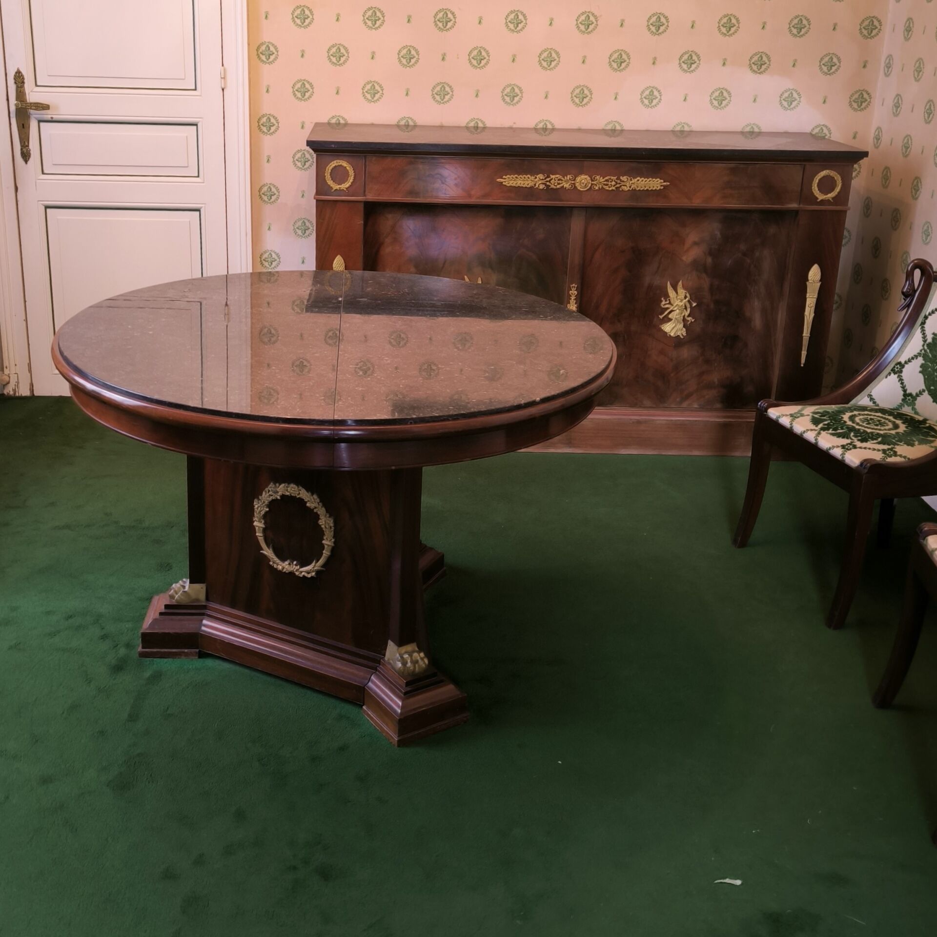 . A mahogany and mahogany veneered tripod dining table with bronze ornaments and marble top, Empire style (small accidents). Height 77 cm, diameter 120 cm. Extensions included.