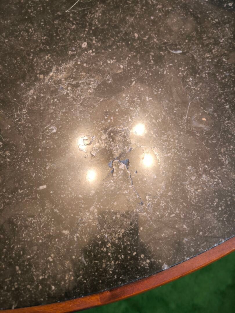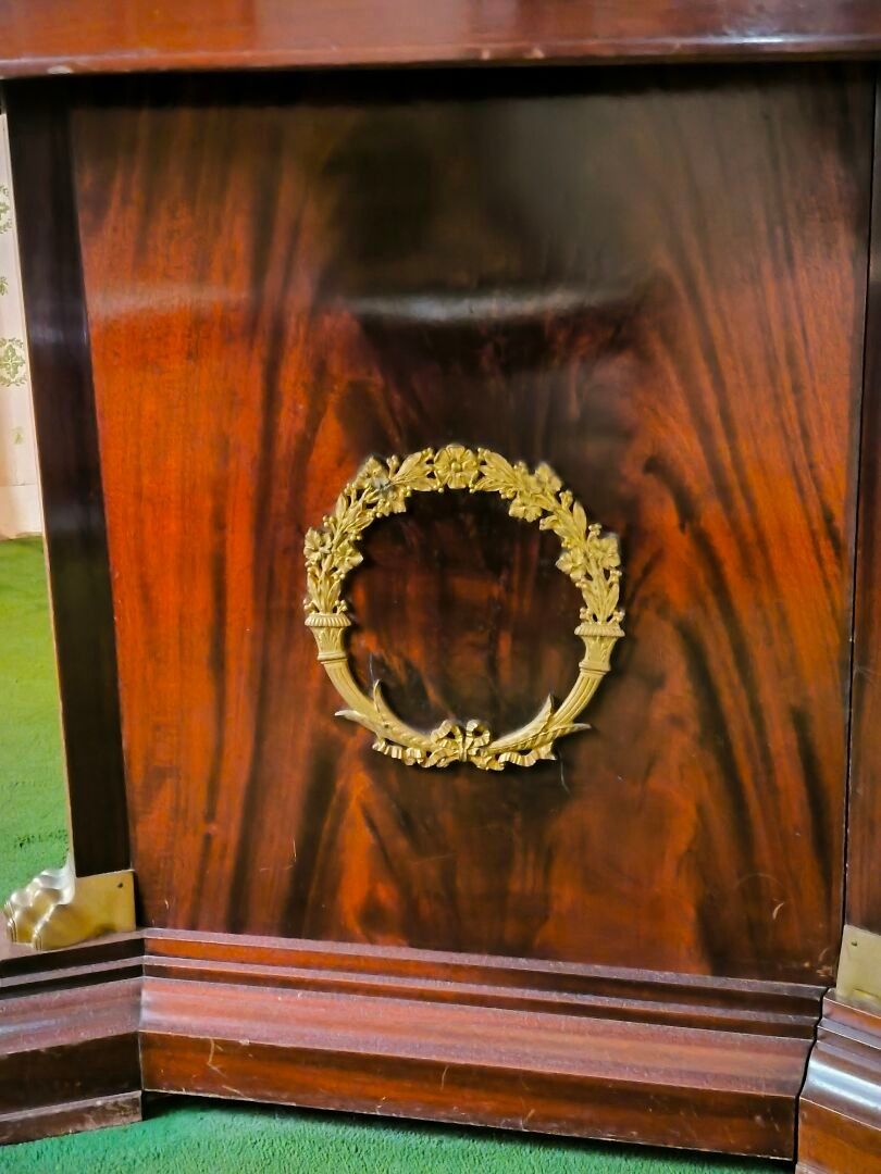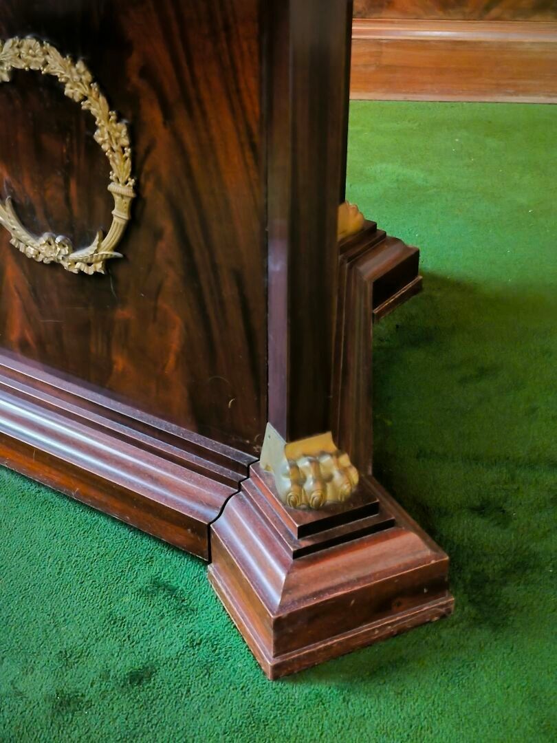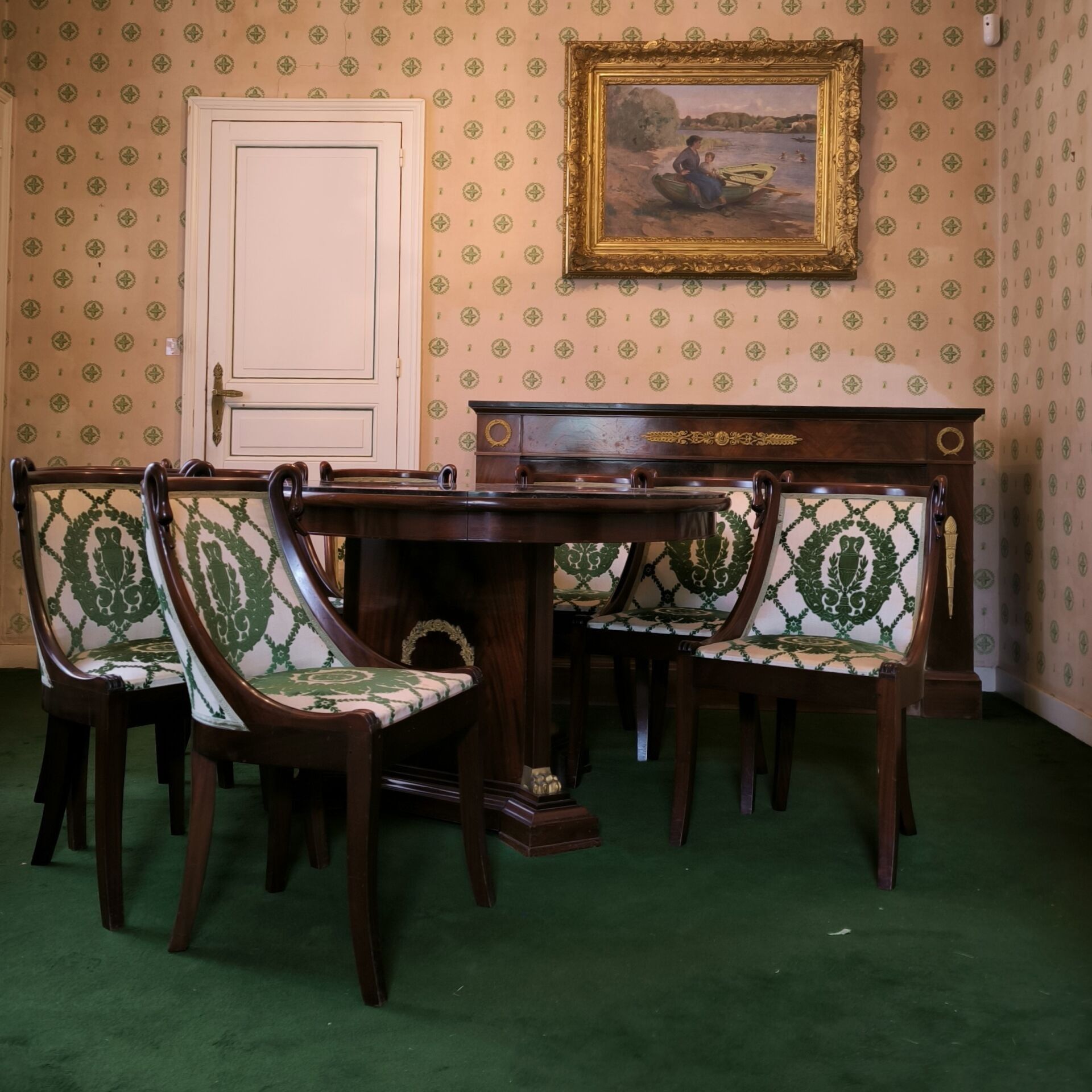 . A mahogany and mahogany veneered tripod dining table with bronze ornaments and marble top, Empire style (small accidents). Height 77 cm, diameter 120 cm. Extensions included.