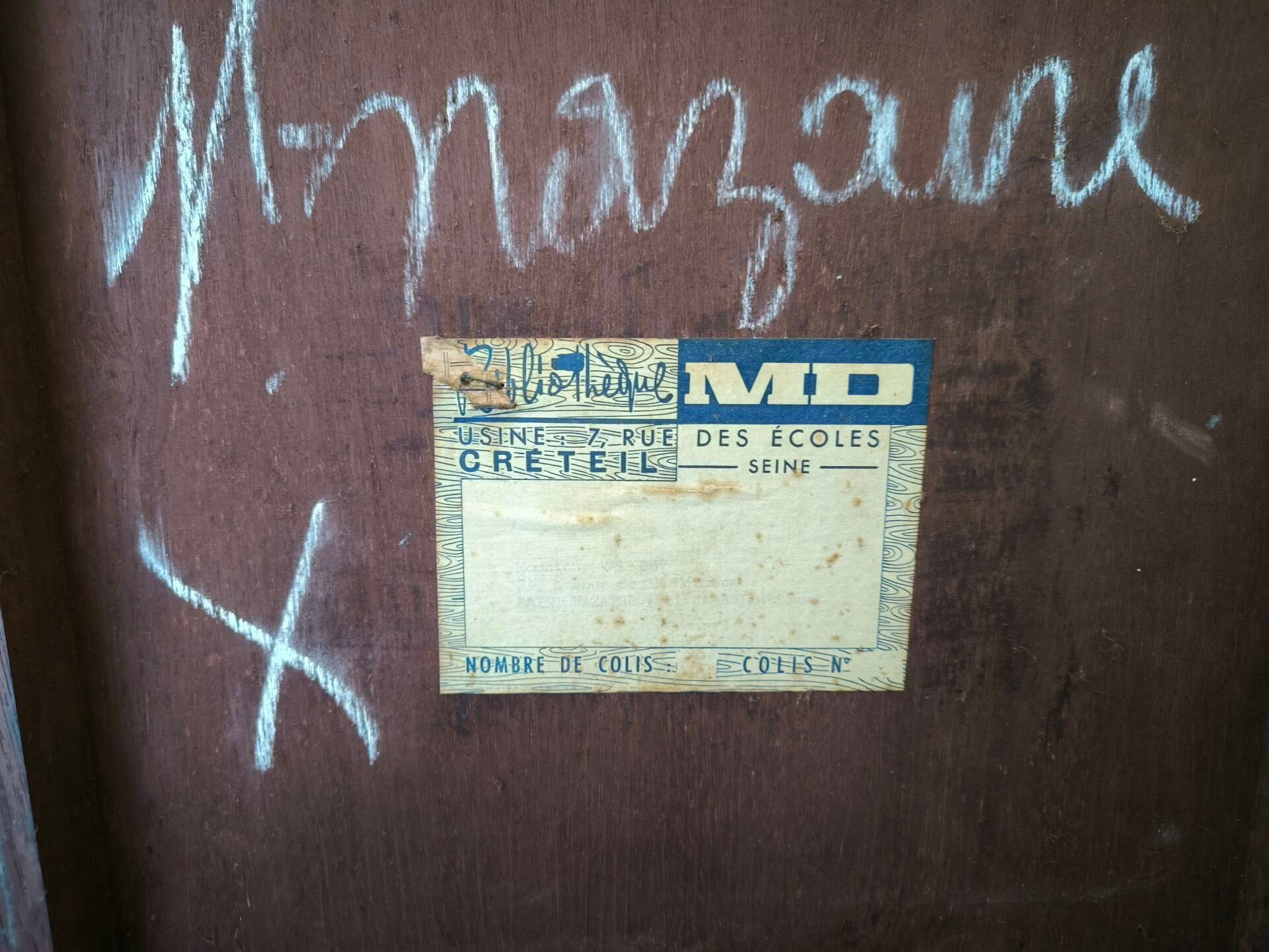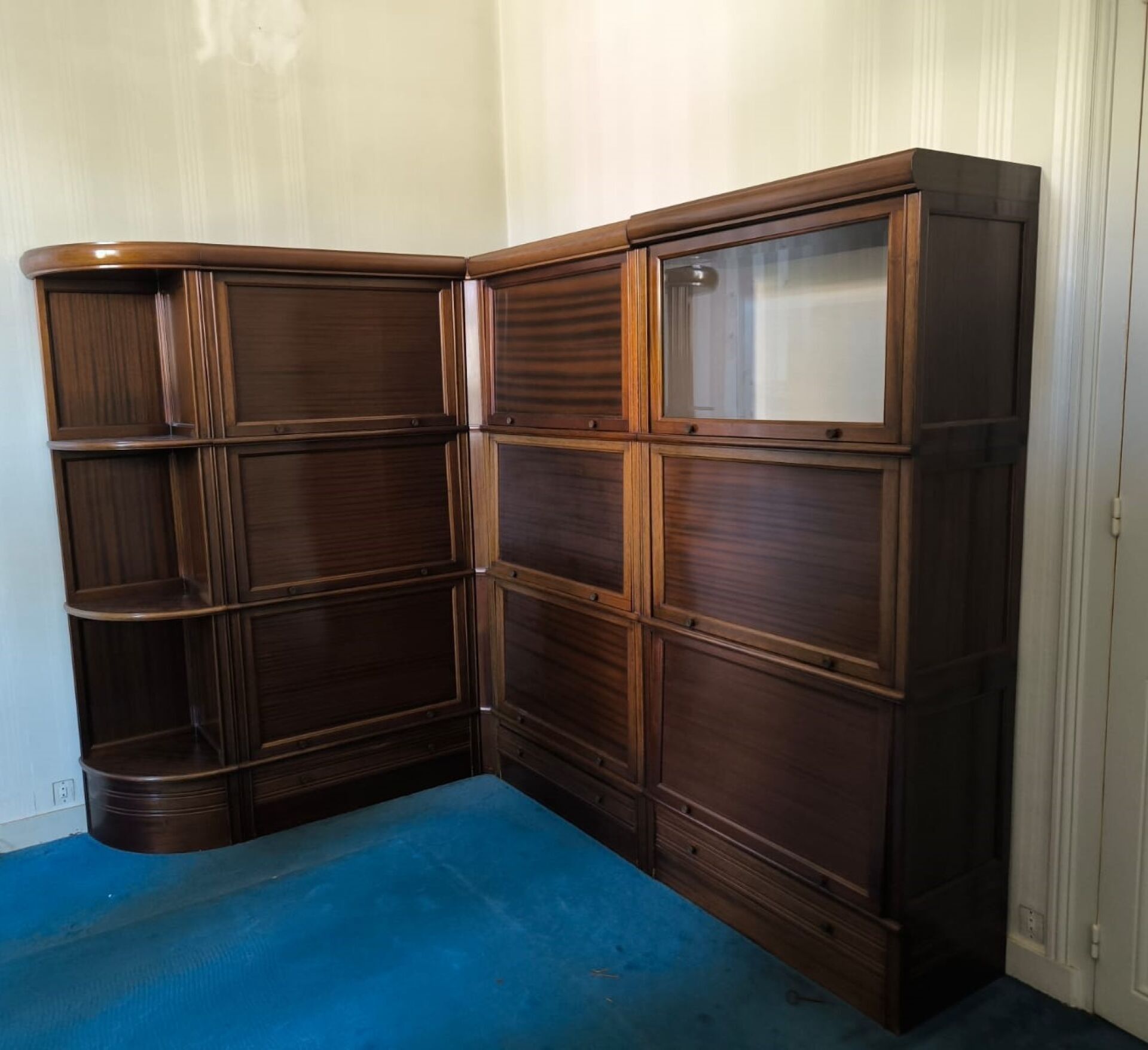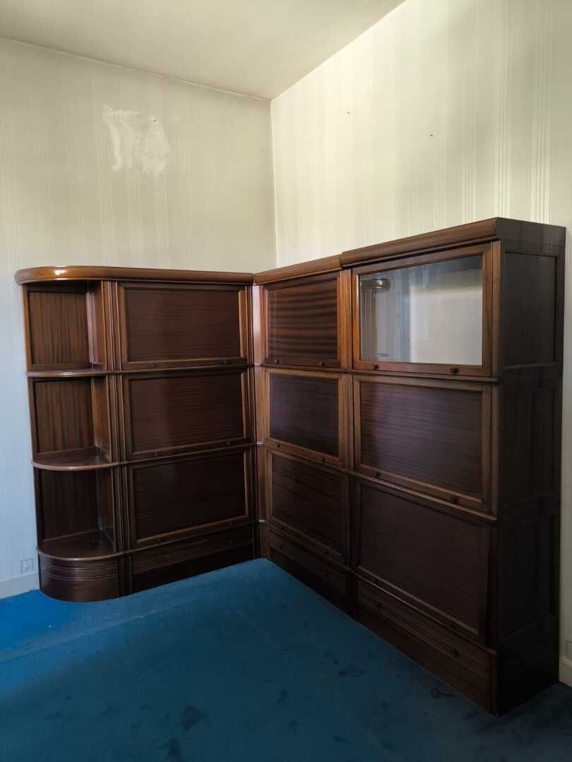 . MD modular bookcase, opening with 7 doors, 1 glass door and 3 drawers. Height 170 cm, length 160 and 202 cm, depth 37 cm.