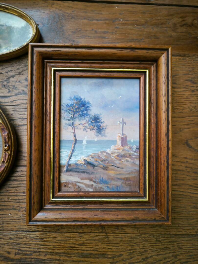 - Marthe DANARD PUIG (XIX-XXth century). Cross facing the sea. Oil on panel, signed lower left. 11,5 x 8 cm (on view). Frame