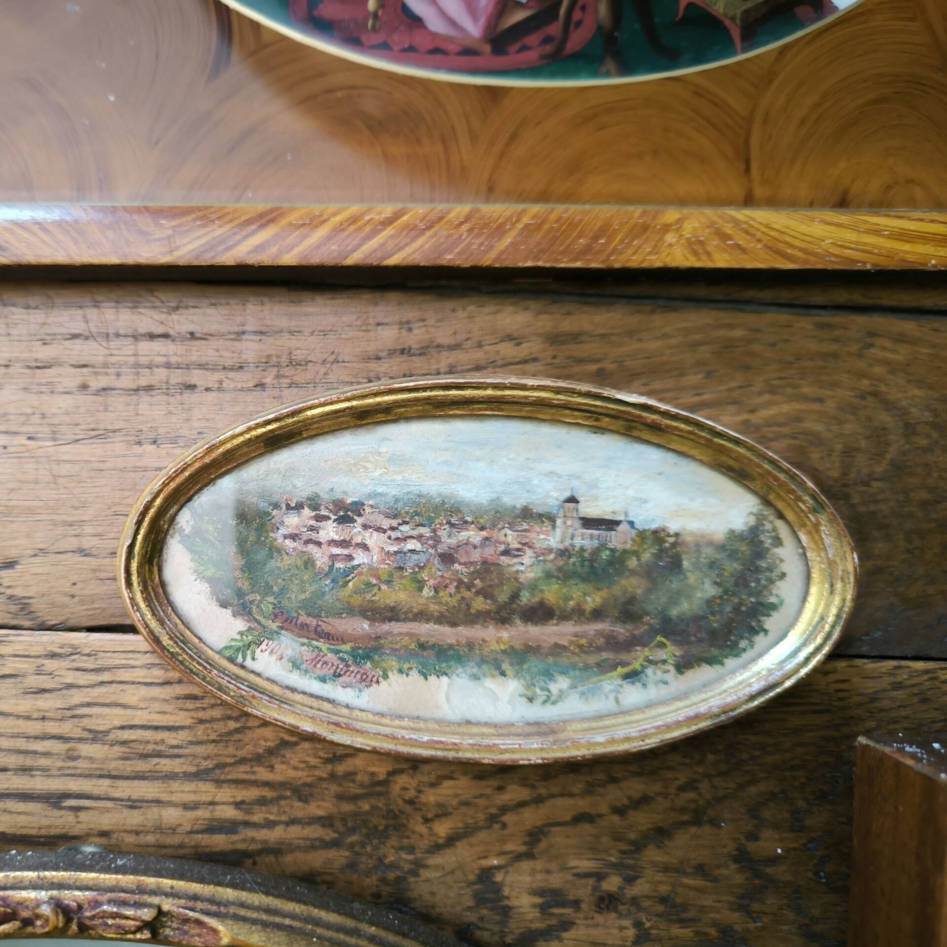 - Montaigu. Painting, signed lower left, titled and dated 1908 (?). 5 x 11 cm (on view). Frame