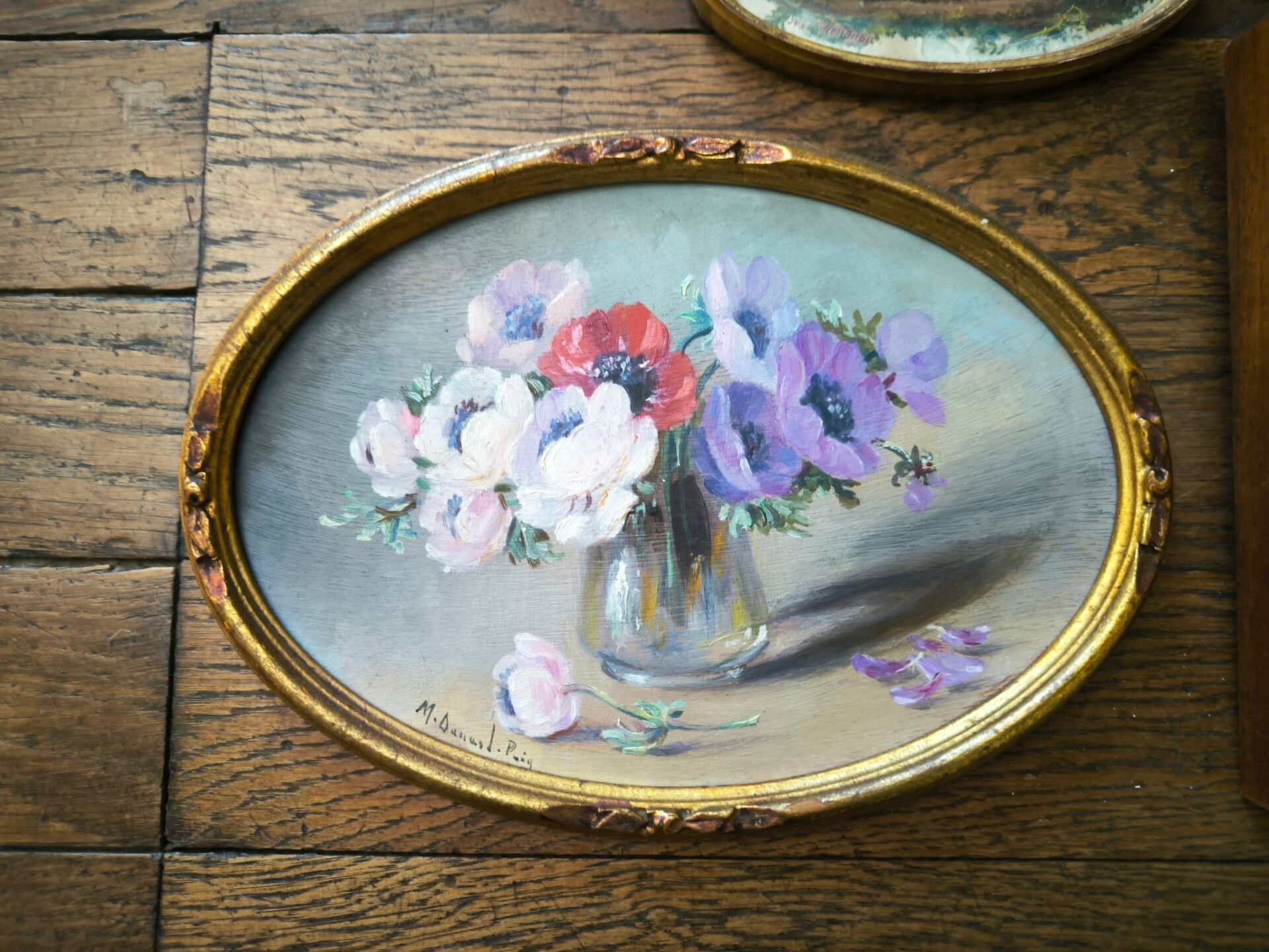 - Marthe DANARD PUIG (XIX-XXth). Bouquet of anemones. Oil on panel, signed lower left. 14.5 x 20.8 cm (view). Frame