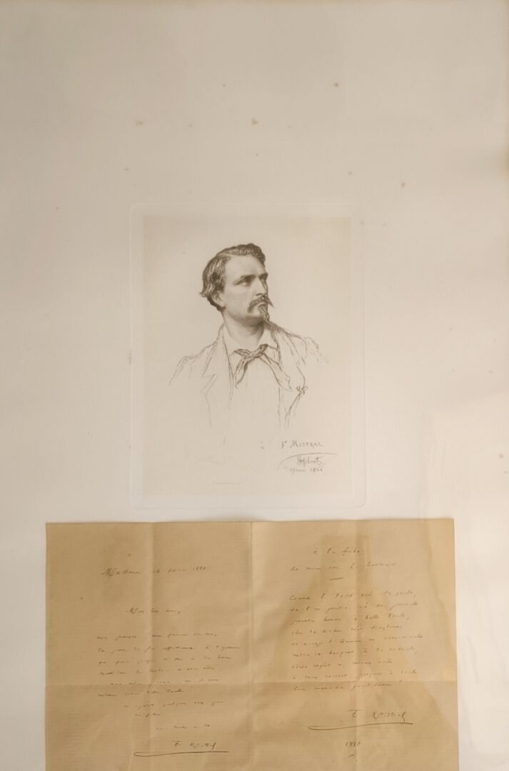 - Ernest Antoine HÉBERT (1817-1908), after. Portrait of Frédéric Mistral. Engraving signed and dated 25 mars 1864 in the plate. 51,5 x 35 cm (à vue). (stains and foxing). Framed. A letter from Frédéric Mistral dated 1880 is enclosed.