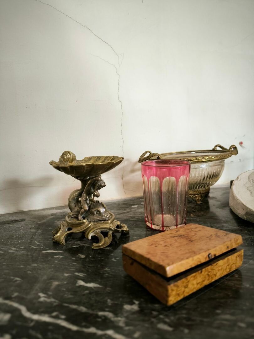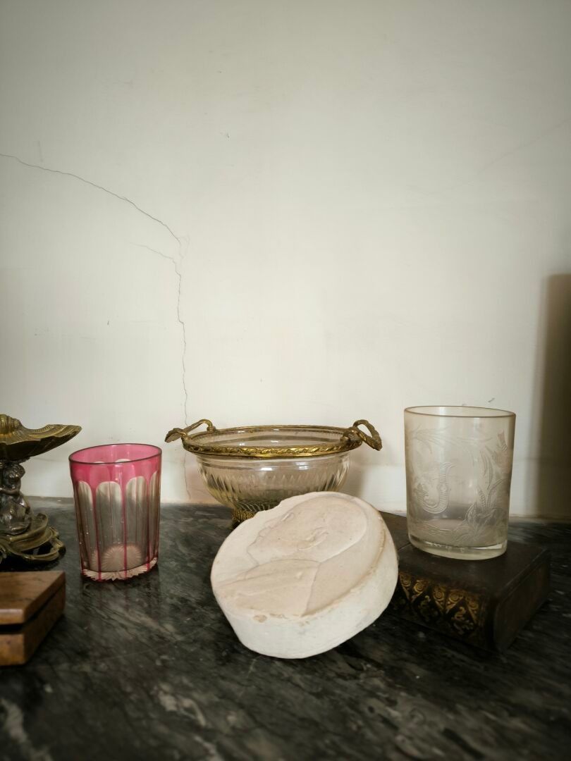 . Lot: a crystal and gilt bronze cup, a book - Officium beatae maria virginis - in its case, a plaster medallion - Edouard FRAISSE, an overlay glass, an engraved glass, a box and miscellaneous.