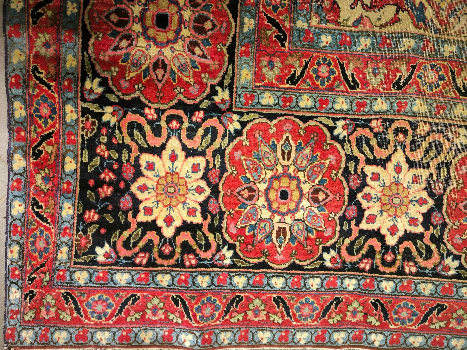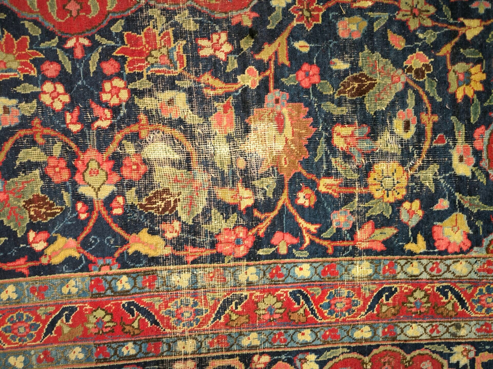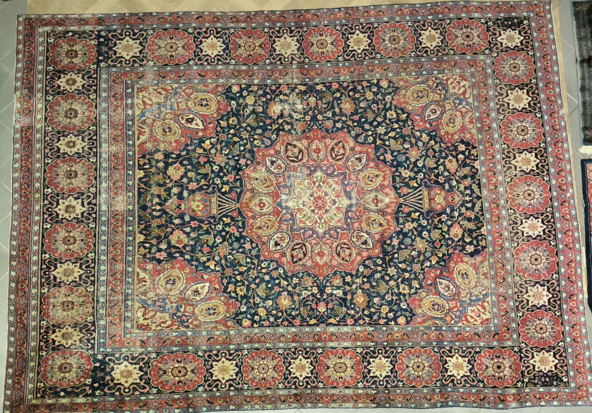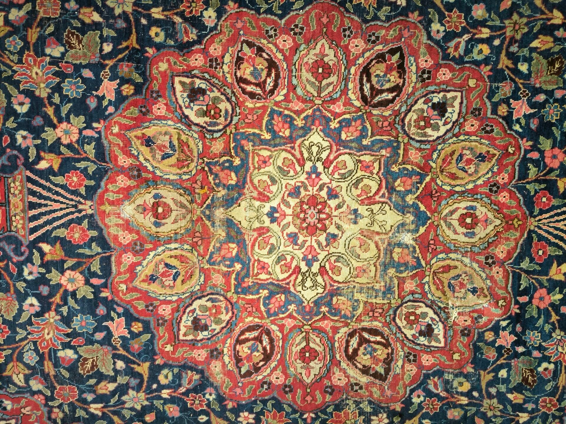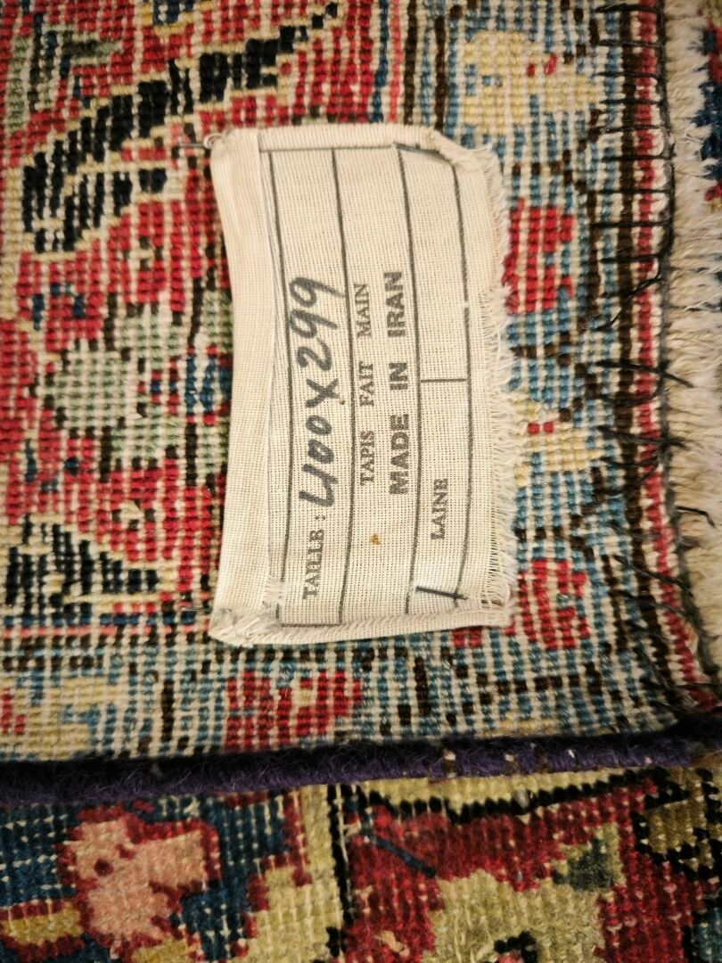 Large Iranian carpet with medallion, red background, wear. 400 x 299 cm. Certificate from Mauvoisin in Angers