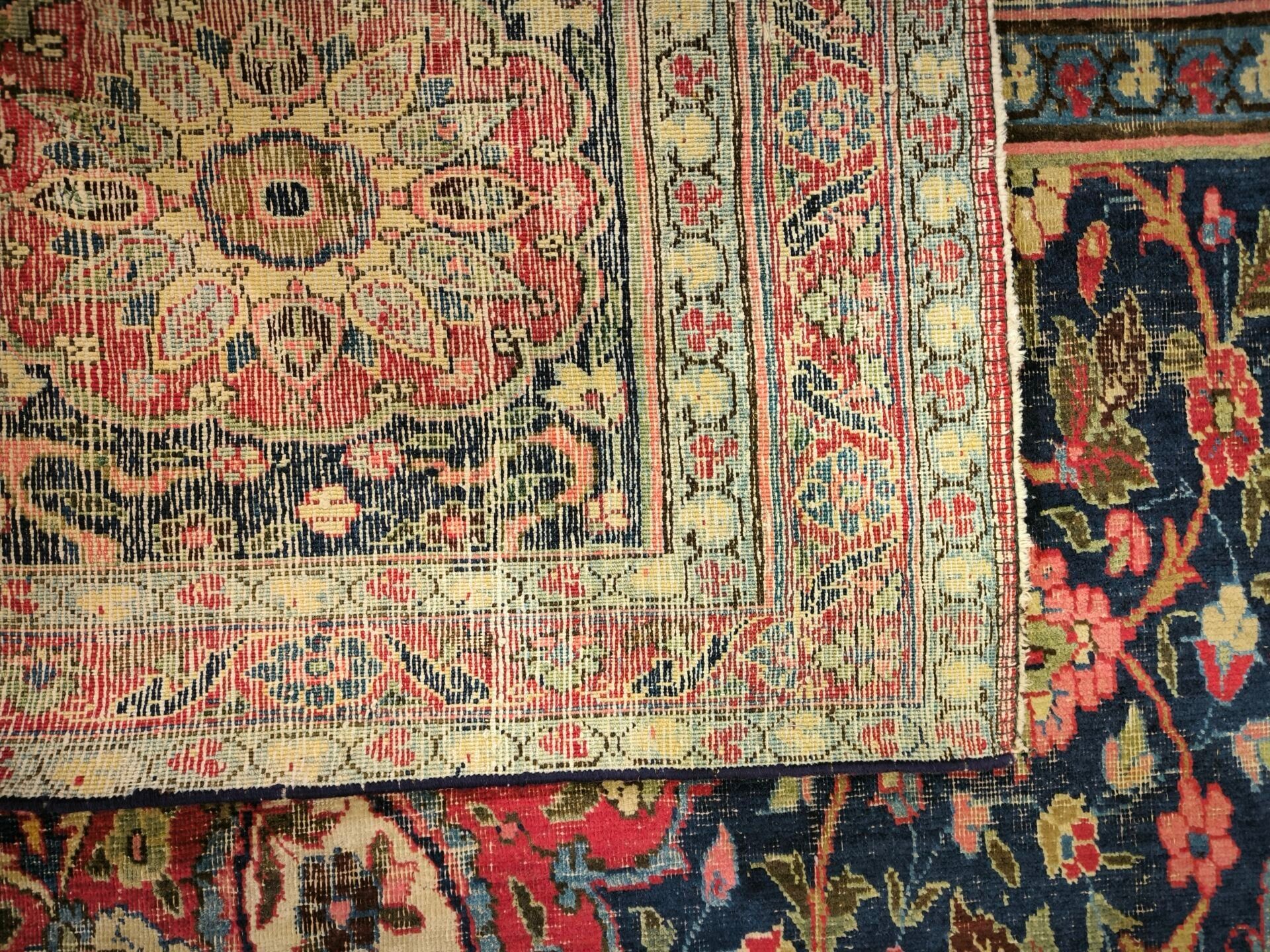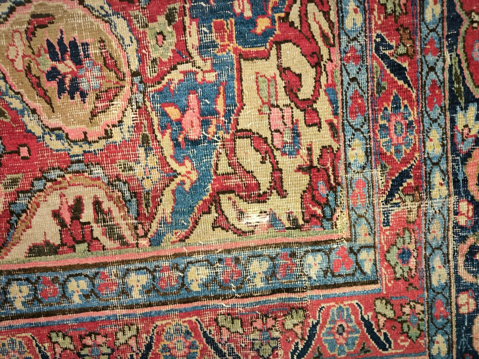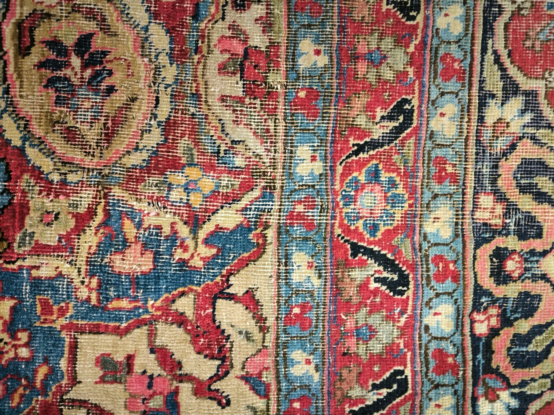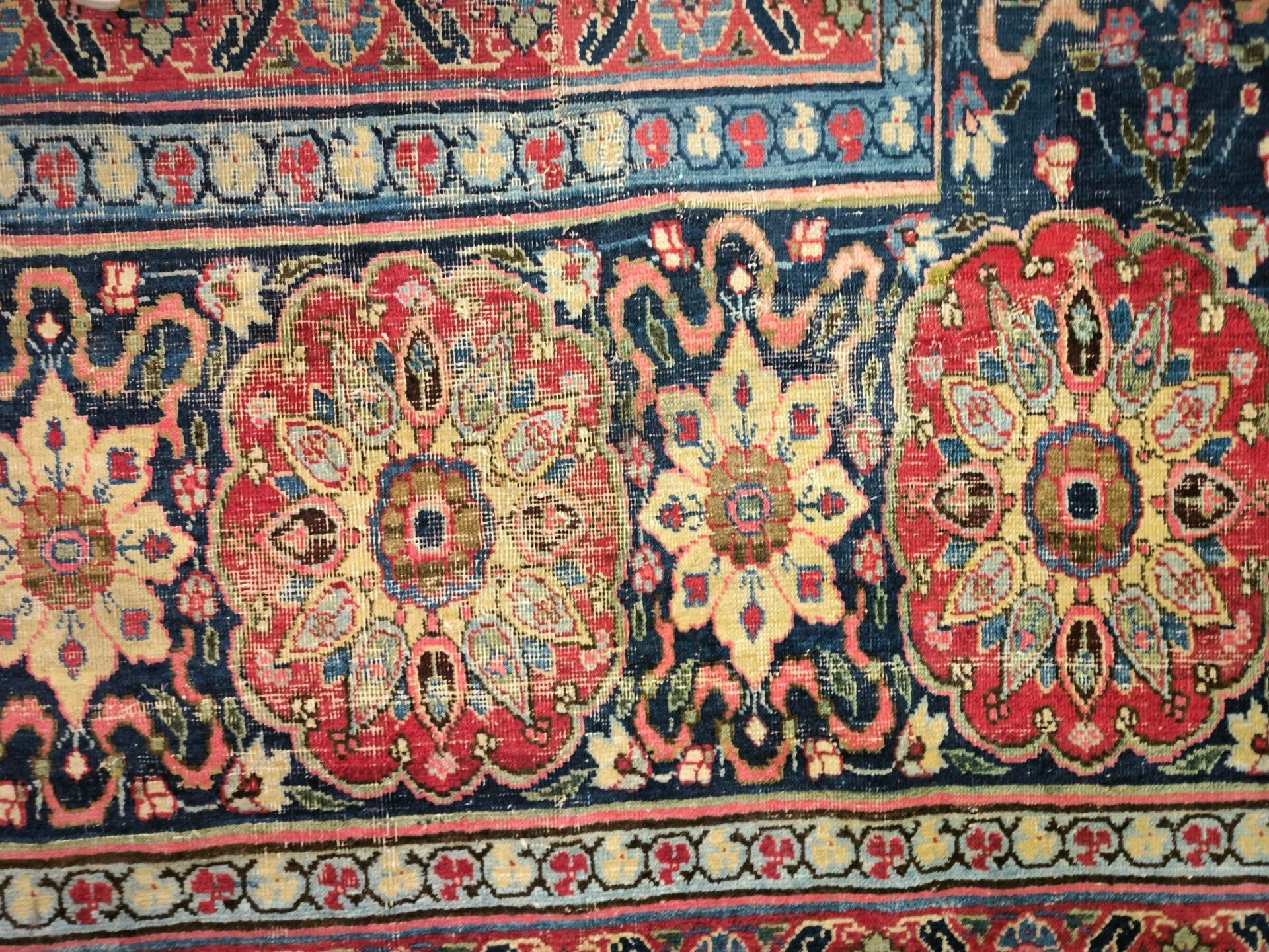 Large Iranian carpet with medallion, red background, wear.
