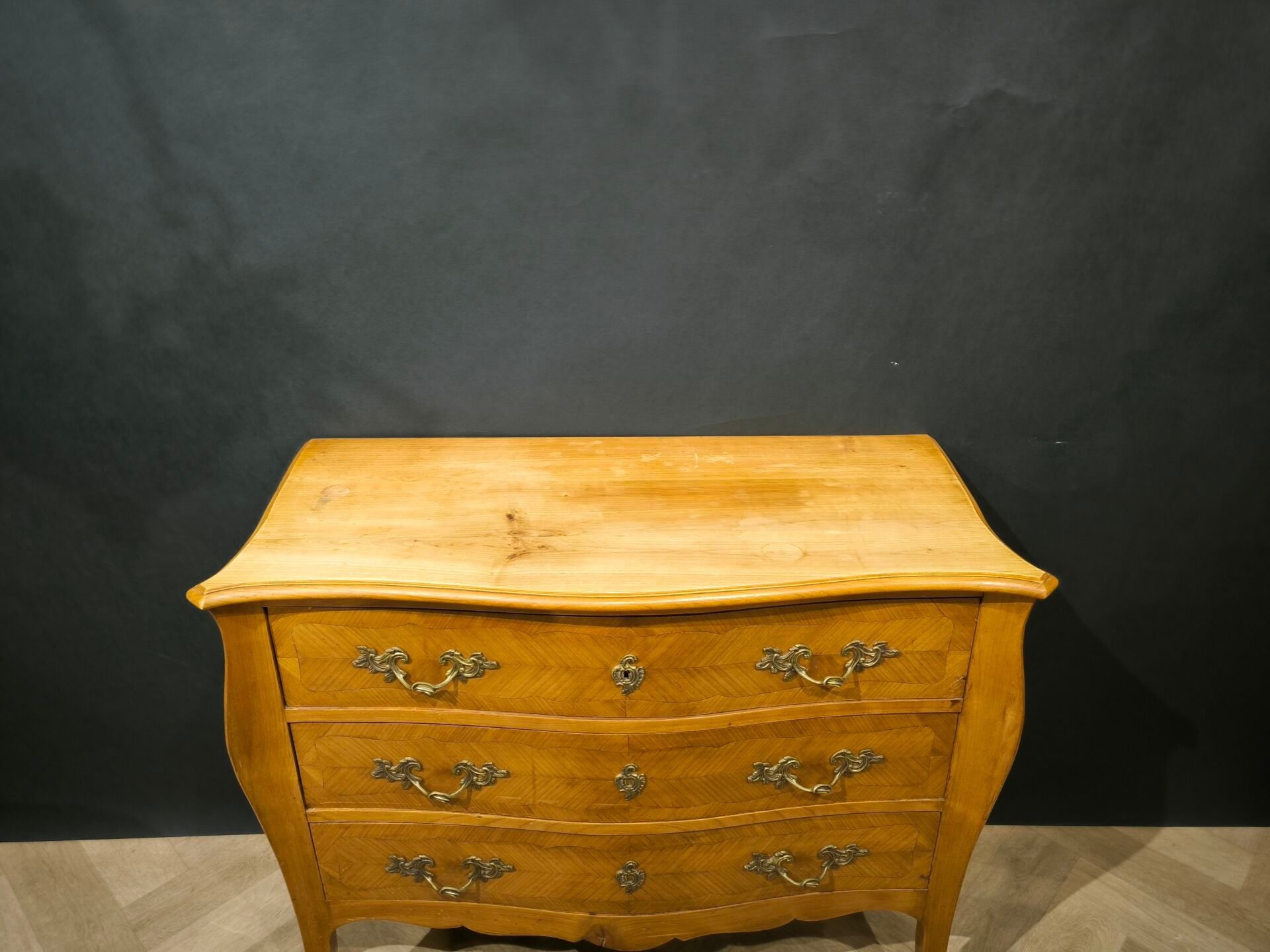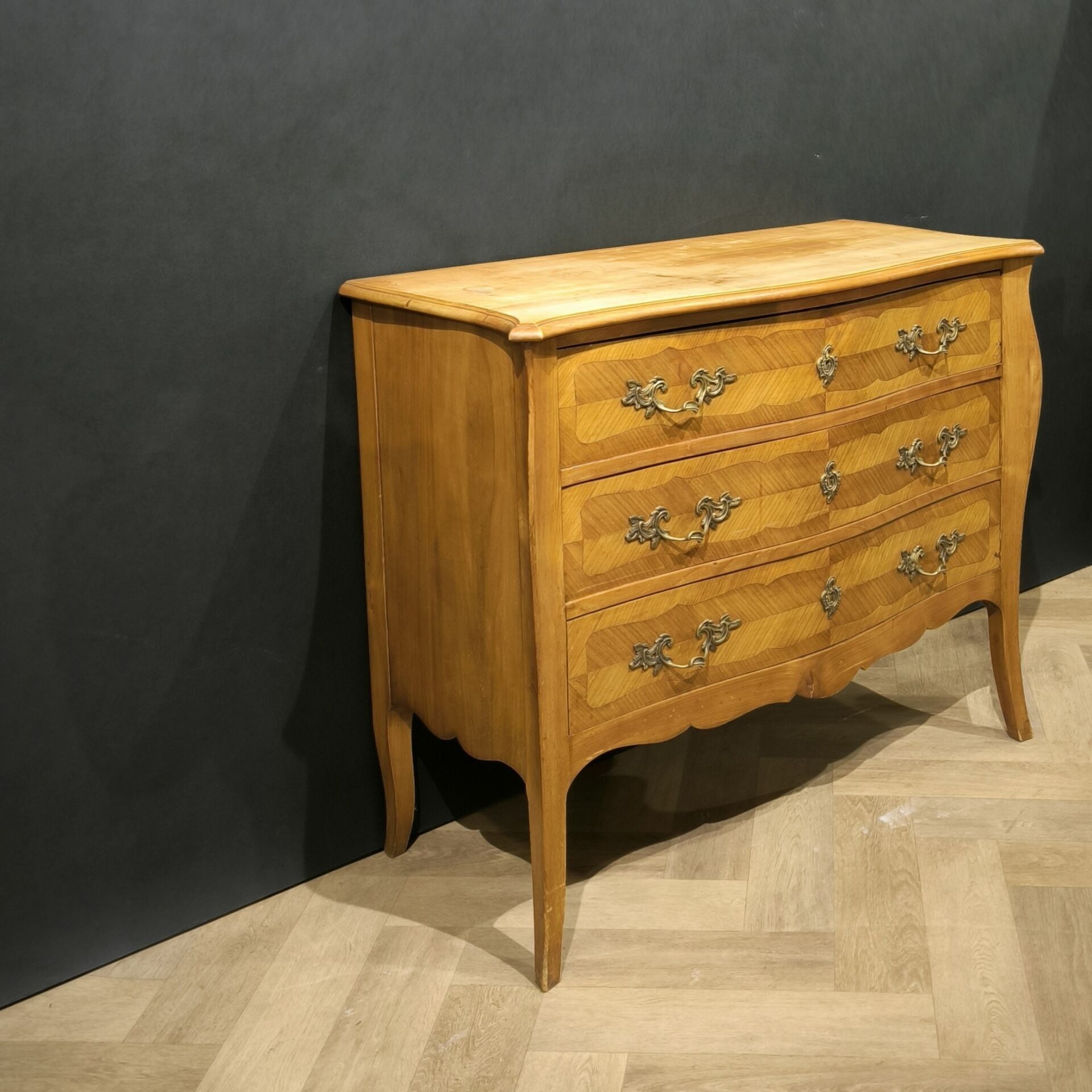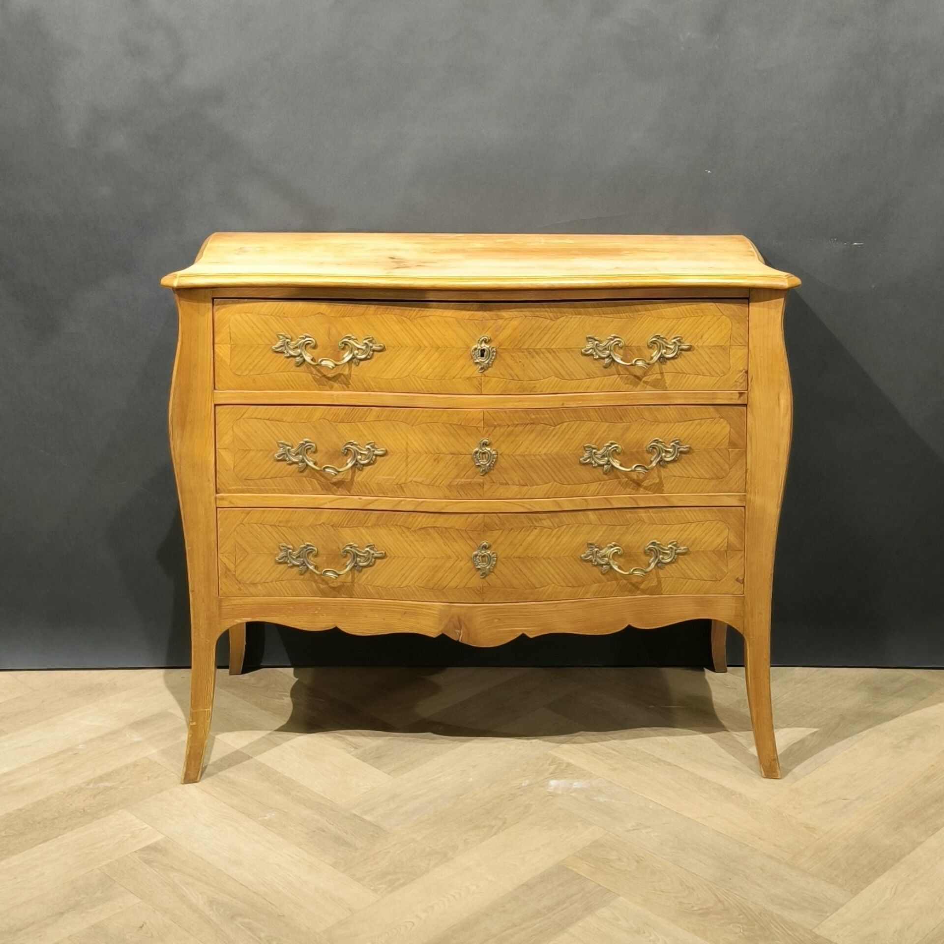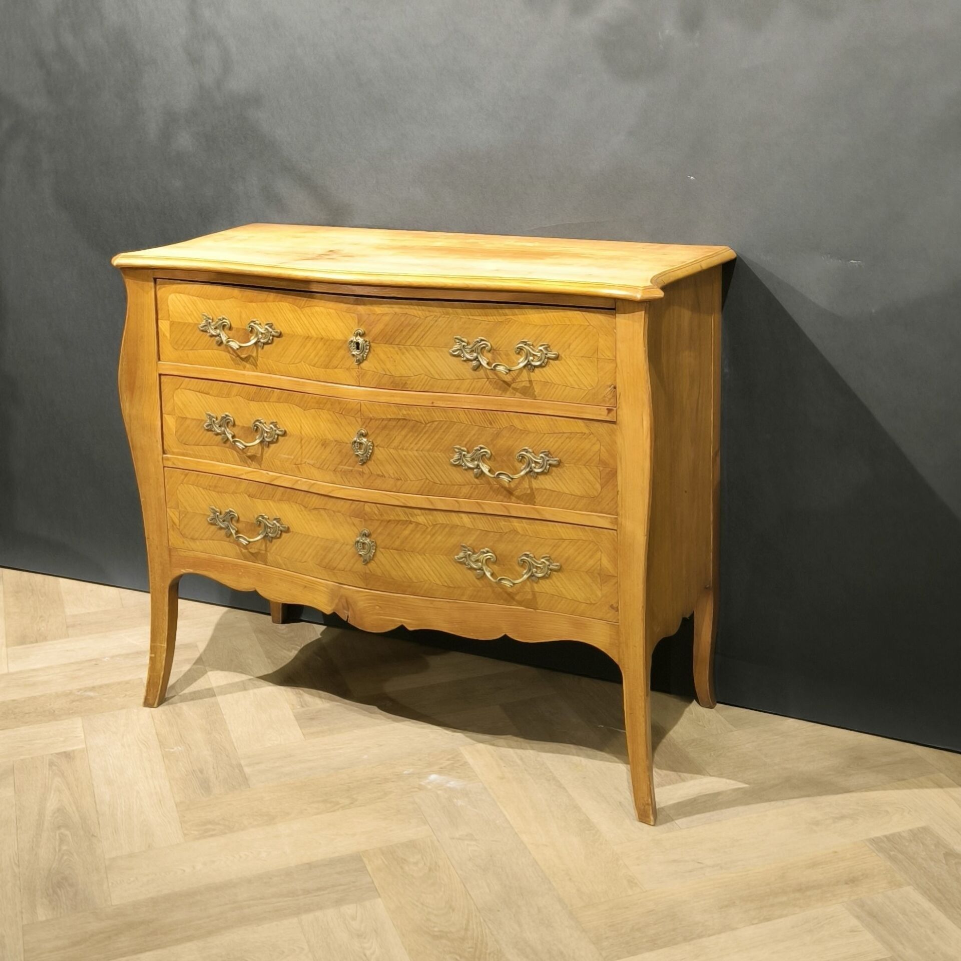 Chest of drawers in cherrywood and cherrywood veneer, opening with three drawers, bronze ornamentation, Louis XV style (minor wear, oiled) Height 83 cm, length 100 cm, depth 46 cm