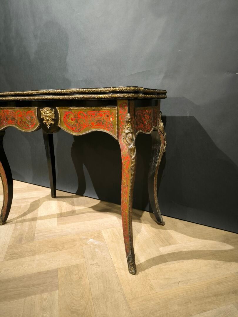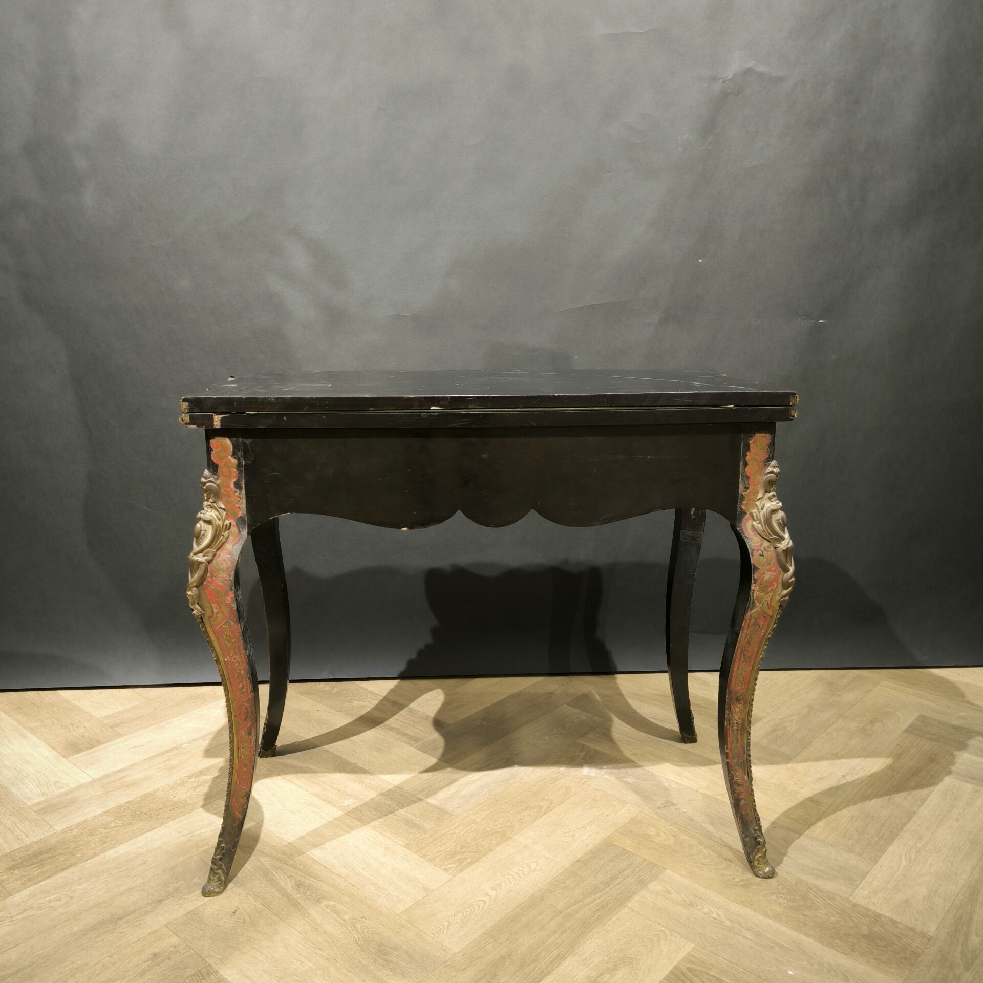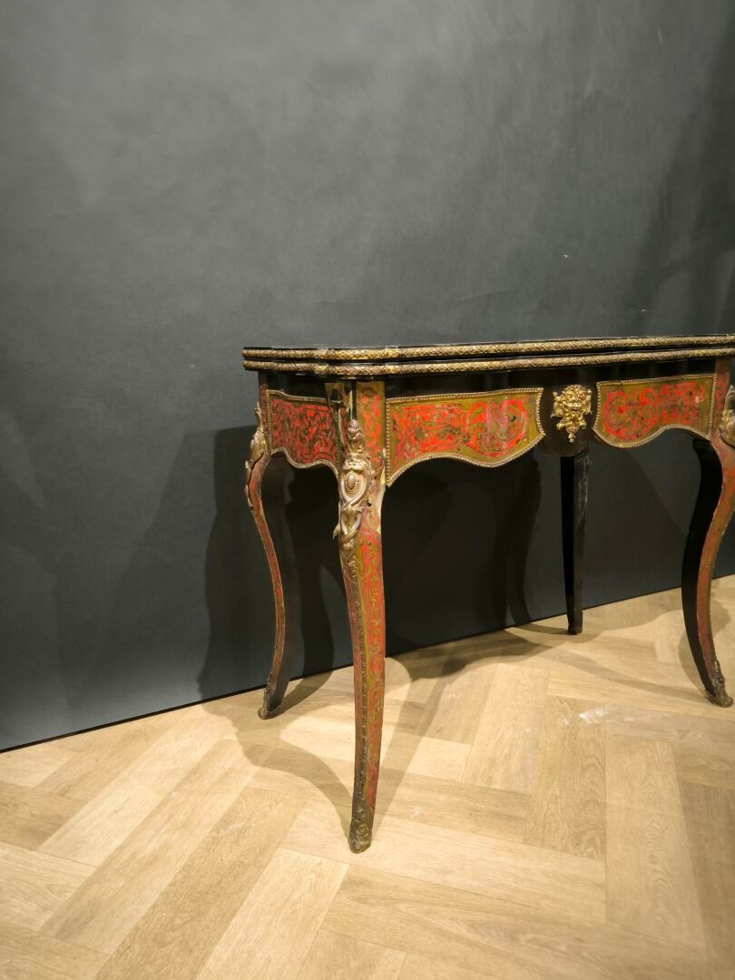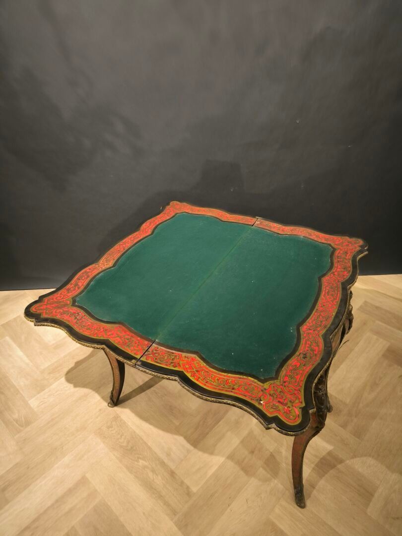 Four-legged games table in blackened wood and "Boulle" marquetry of tortoiseshell and brass, bronze ornamentation, opening top in green felt, Napoleon III (small chips and accidents) Height 78 cm, length 87 cm, width 45 cm