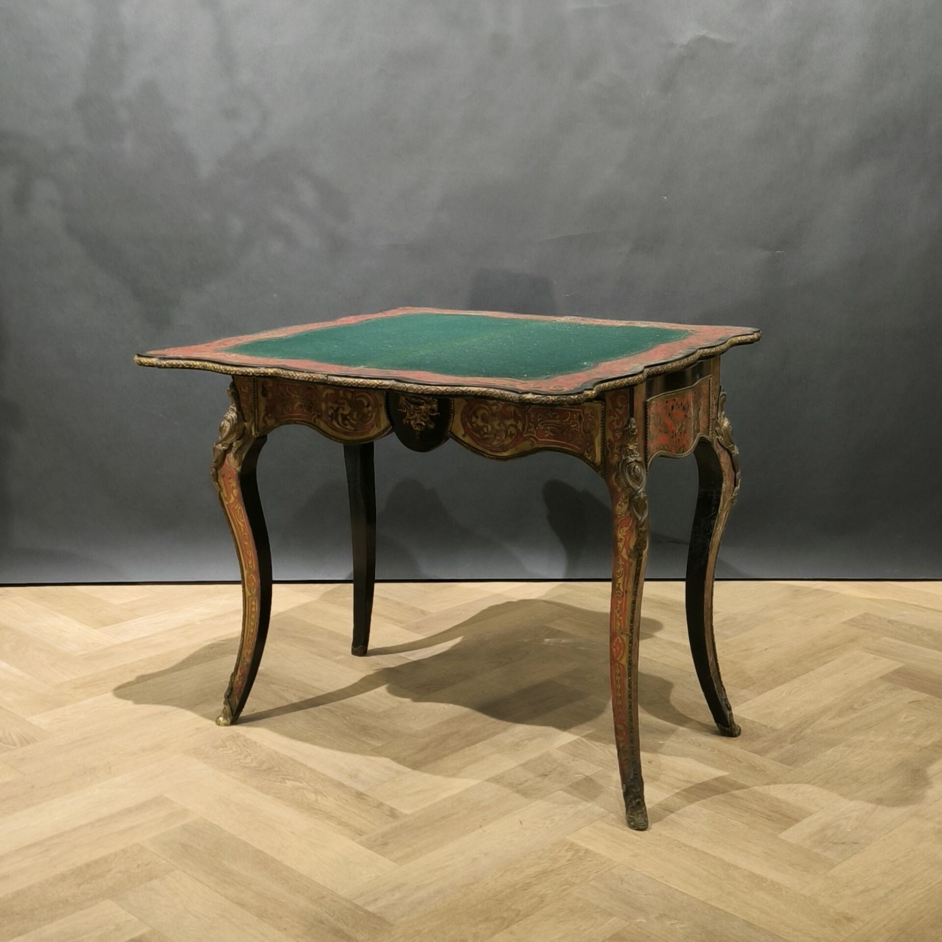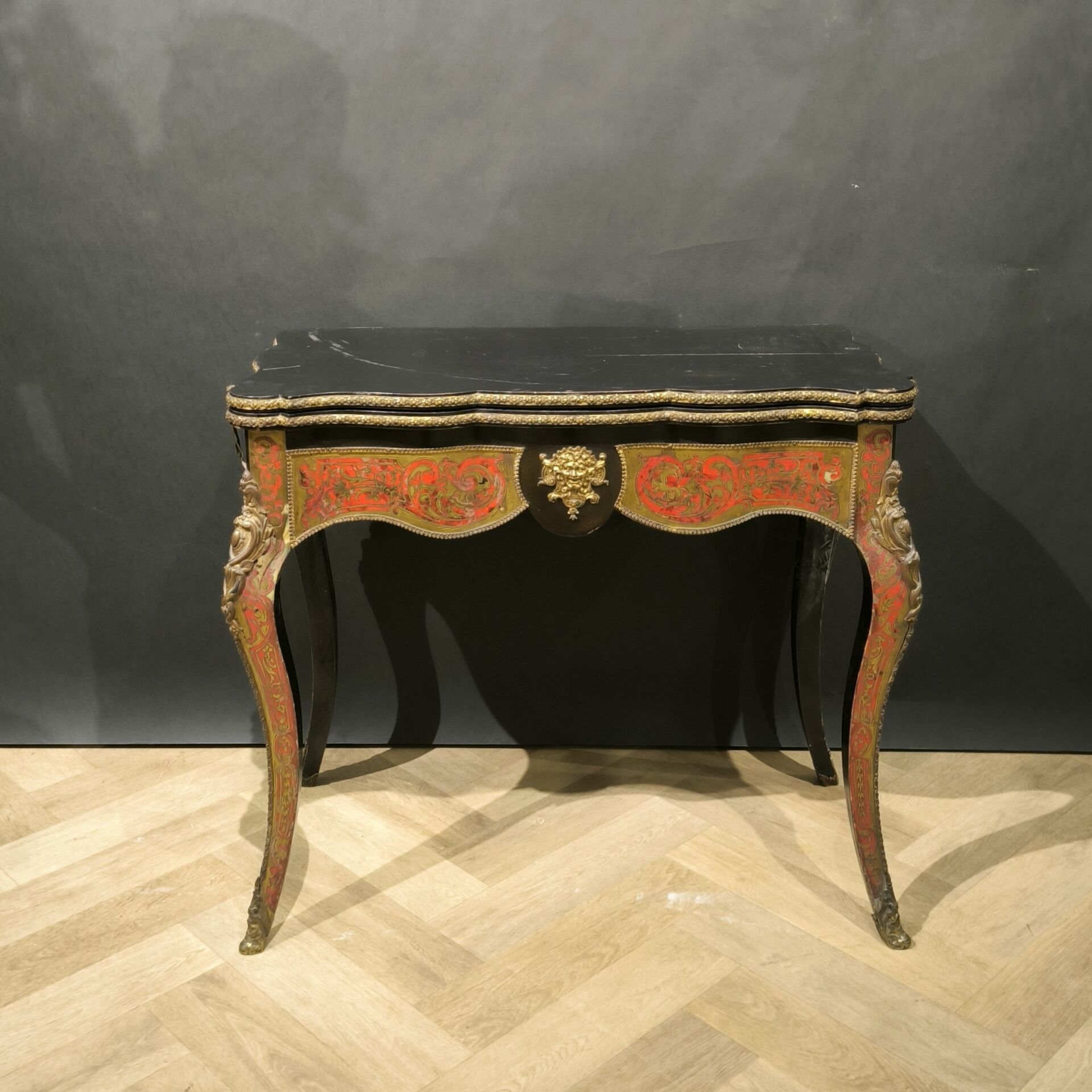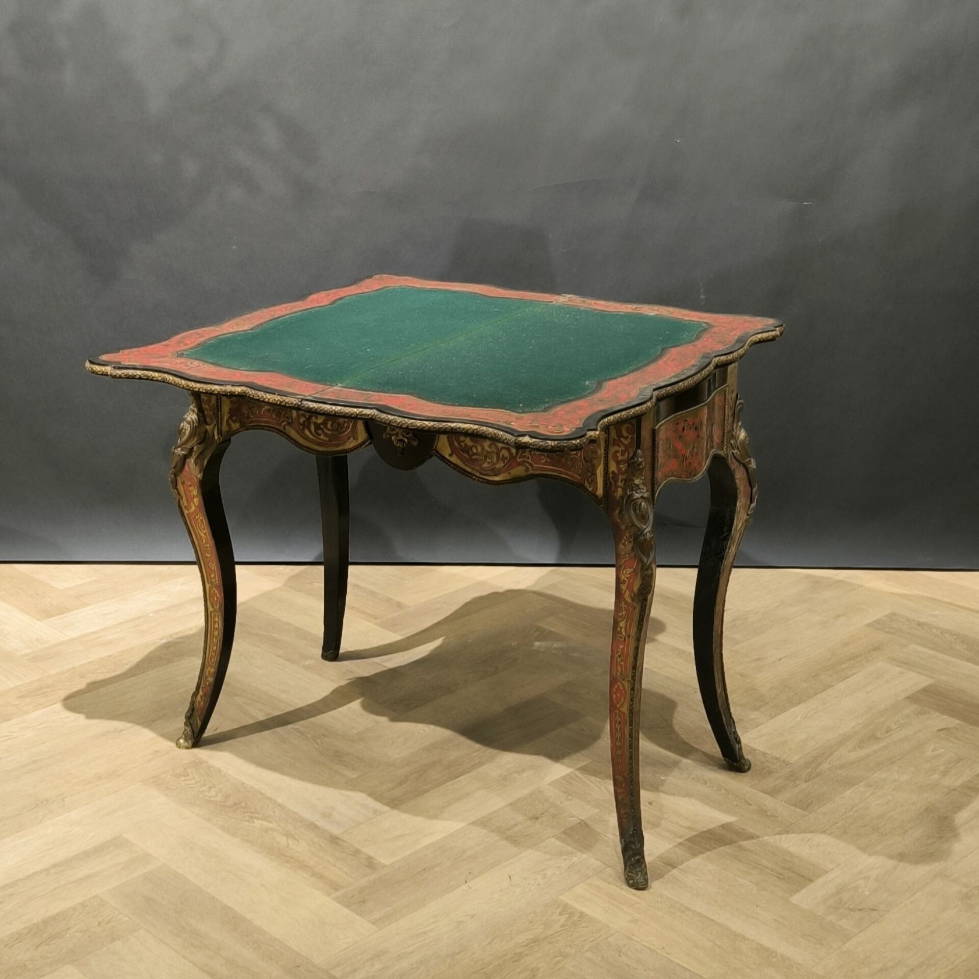Four-legged games table in blackened wood and "Boulle" marquetry of tortoiseshell and brass, bronze ornamentation, opening top in green felt, Napoleon III (small chips and accidents) Height 78 cm, length 87 cm, width 45 cm