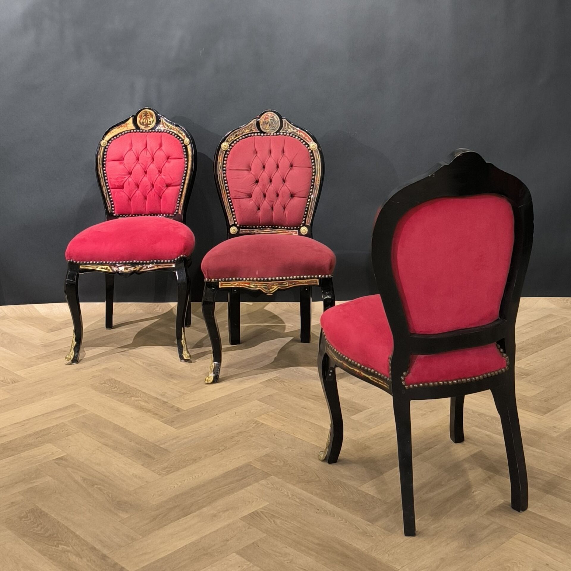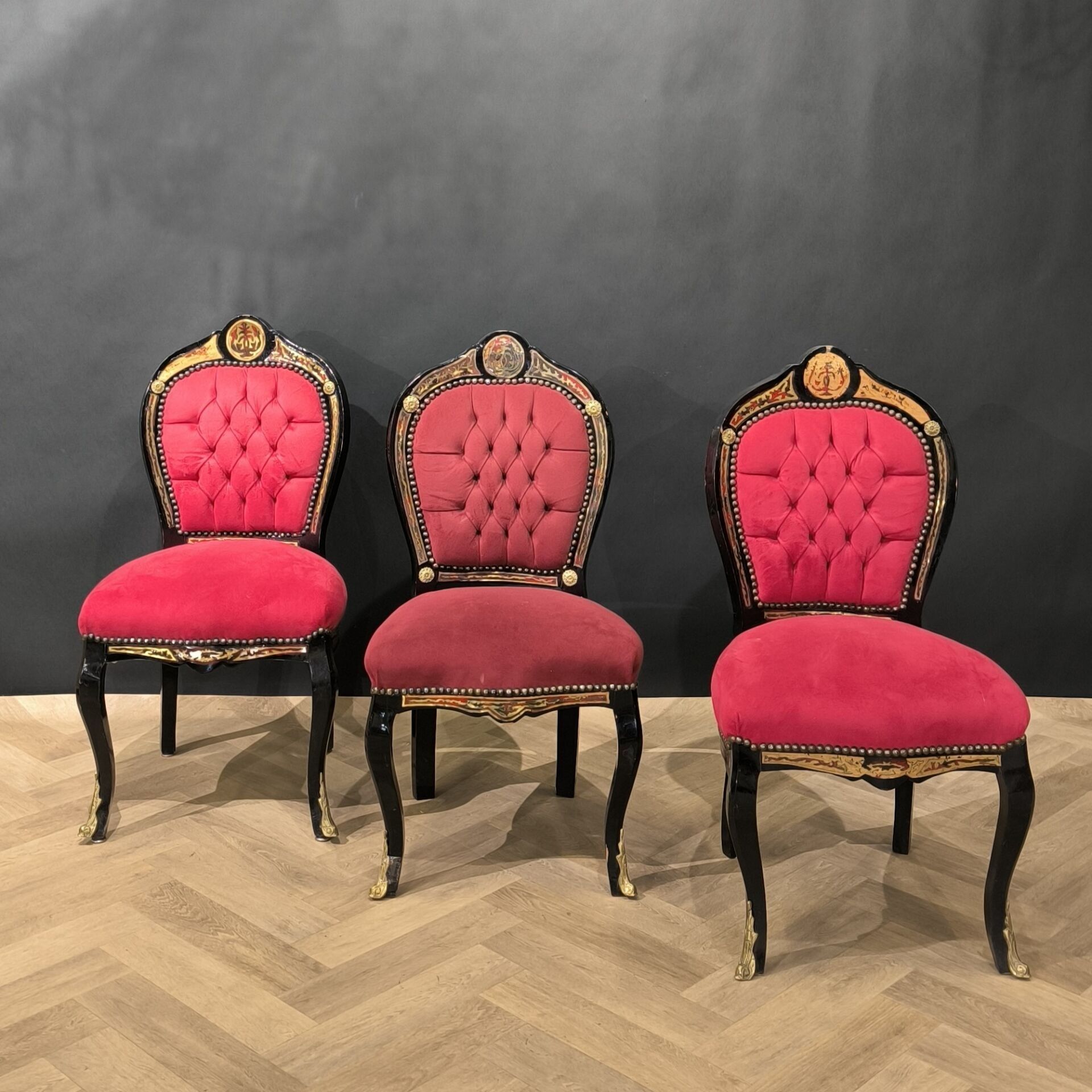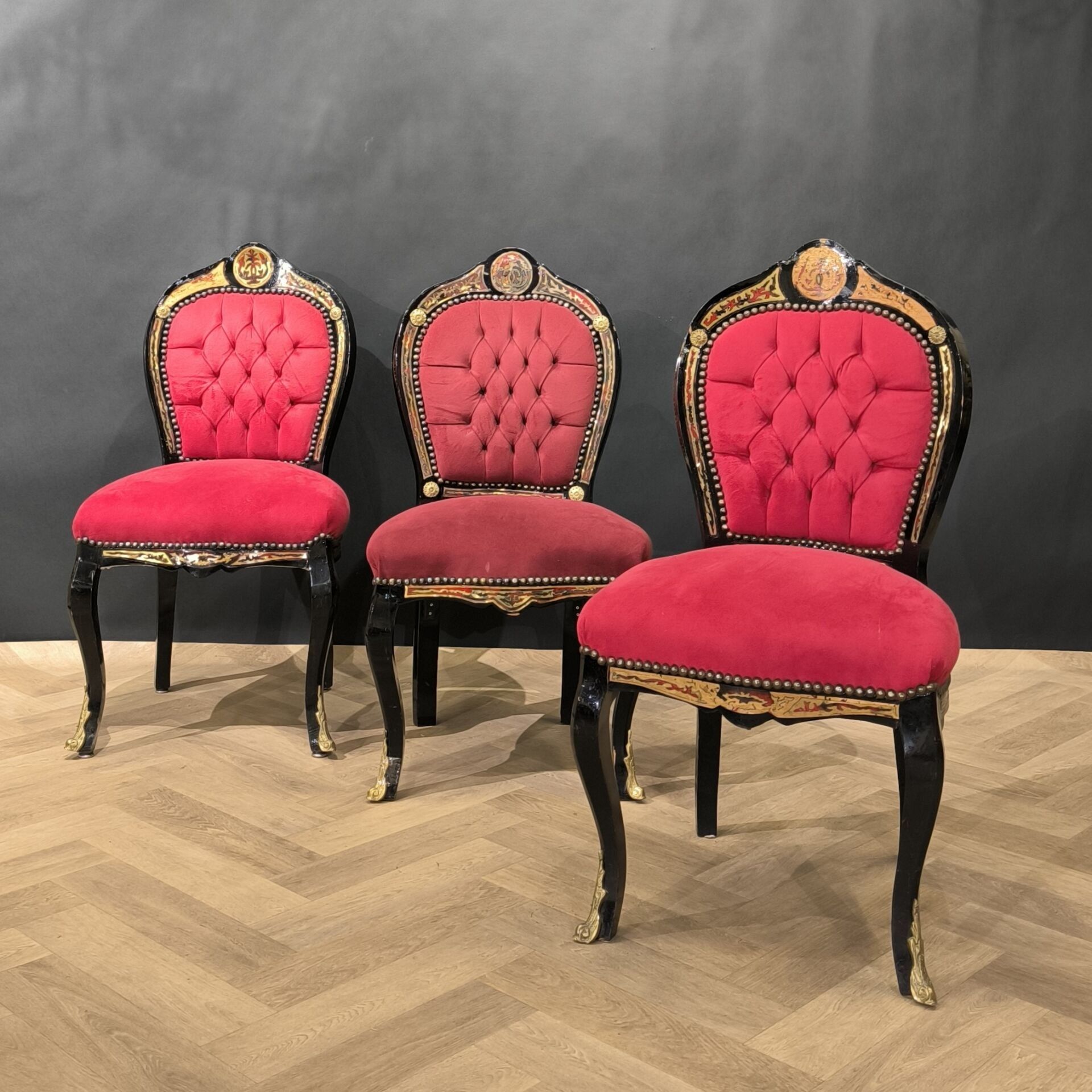Suite of 3 veneered chairs with Boulle marquetry and burgund…