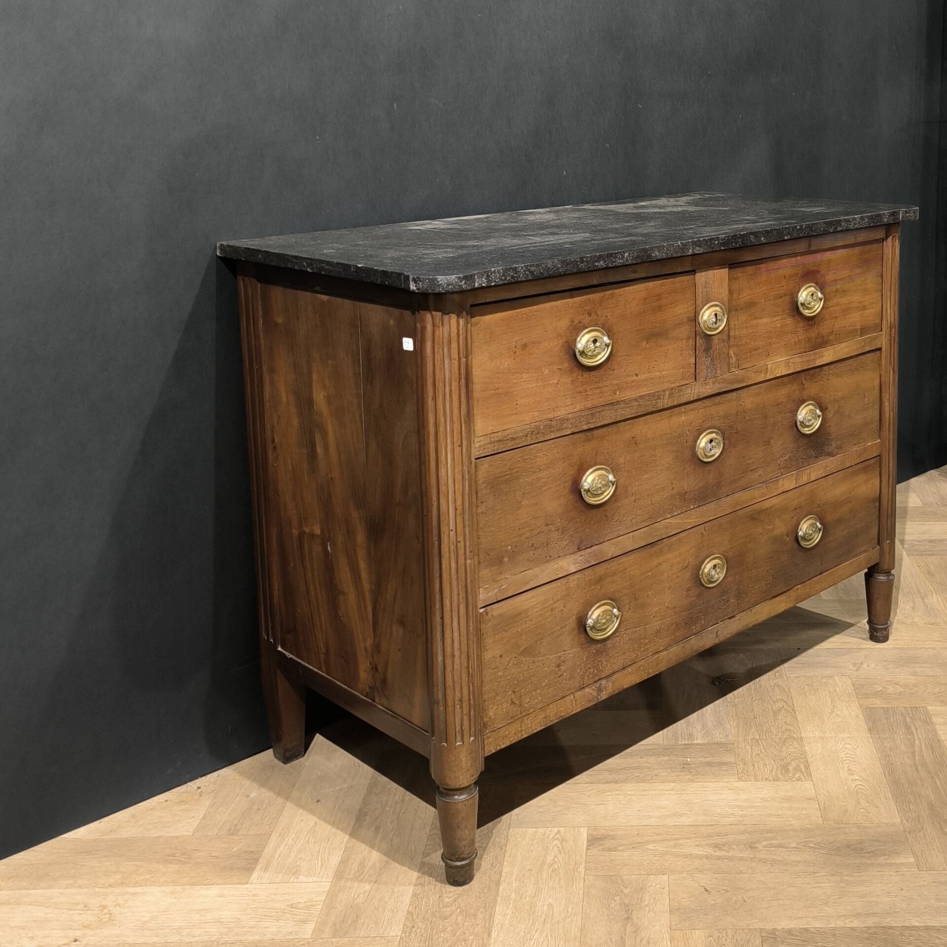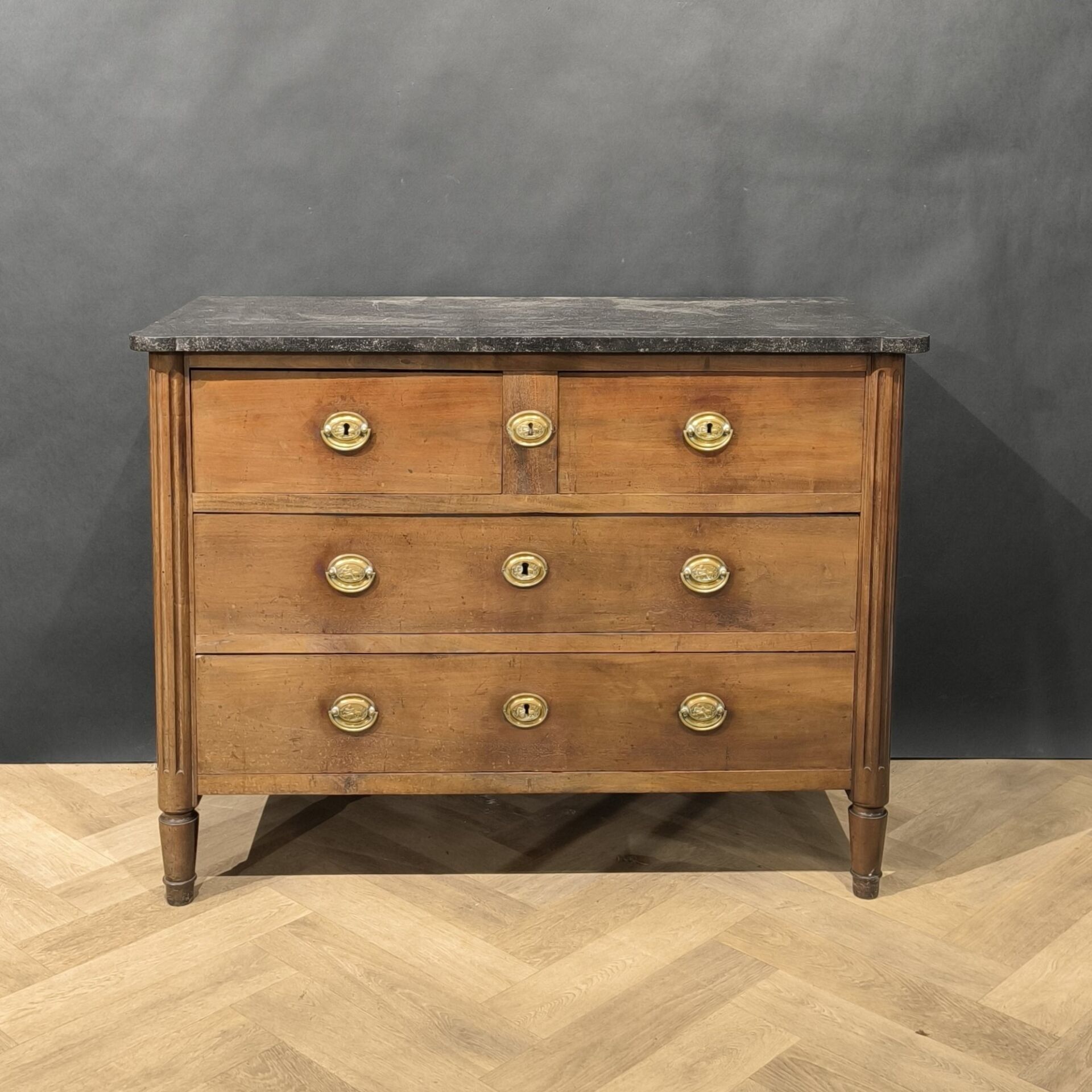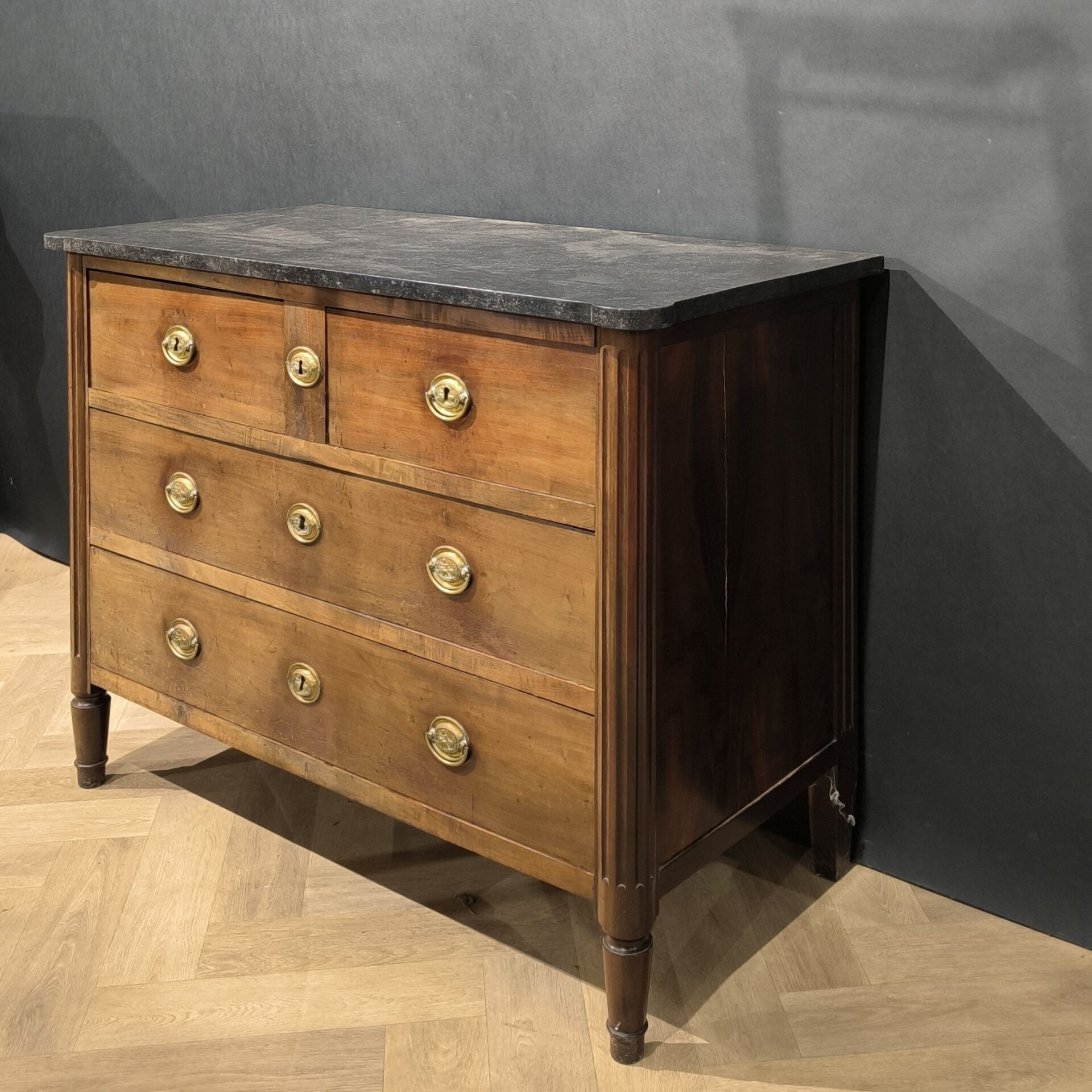Mahogany and mahogany veneer chest of drawers opening with 4 drawers on 3 levels, fluted uprights, bronze ornaments, grey marble top, early 19th C. (minor wear and acc.) Height 86 cm, length 115 cm, depth 56.5 cm