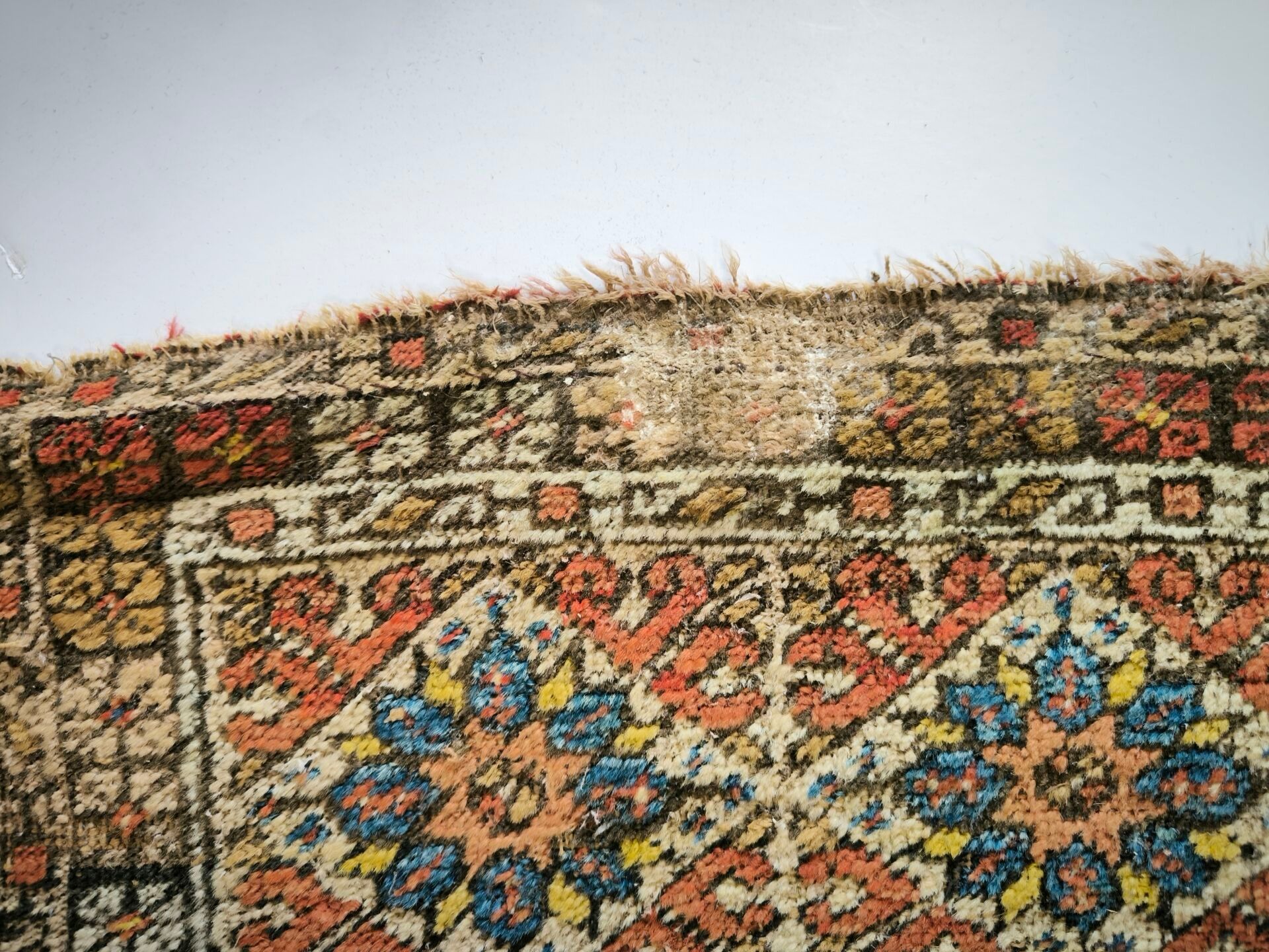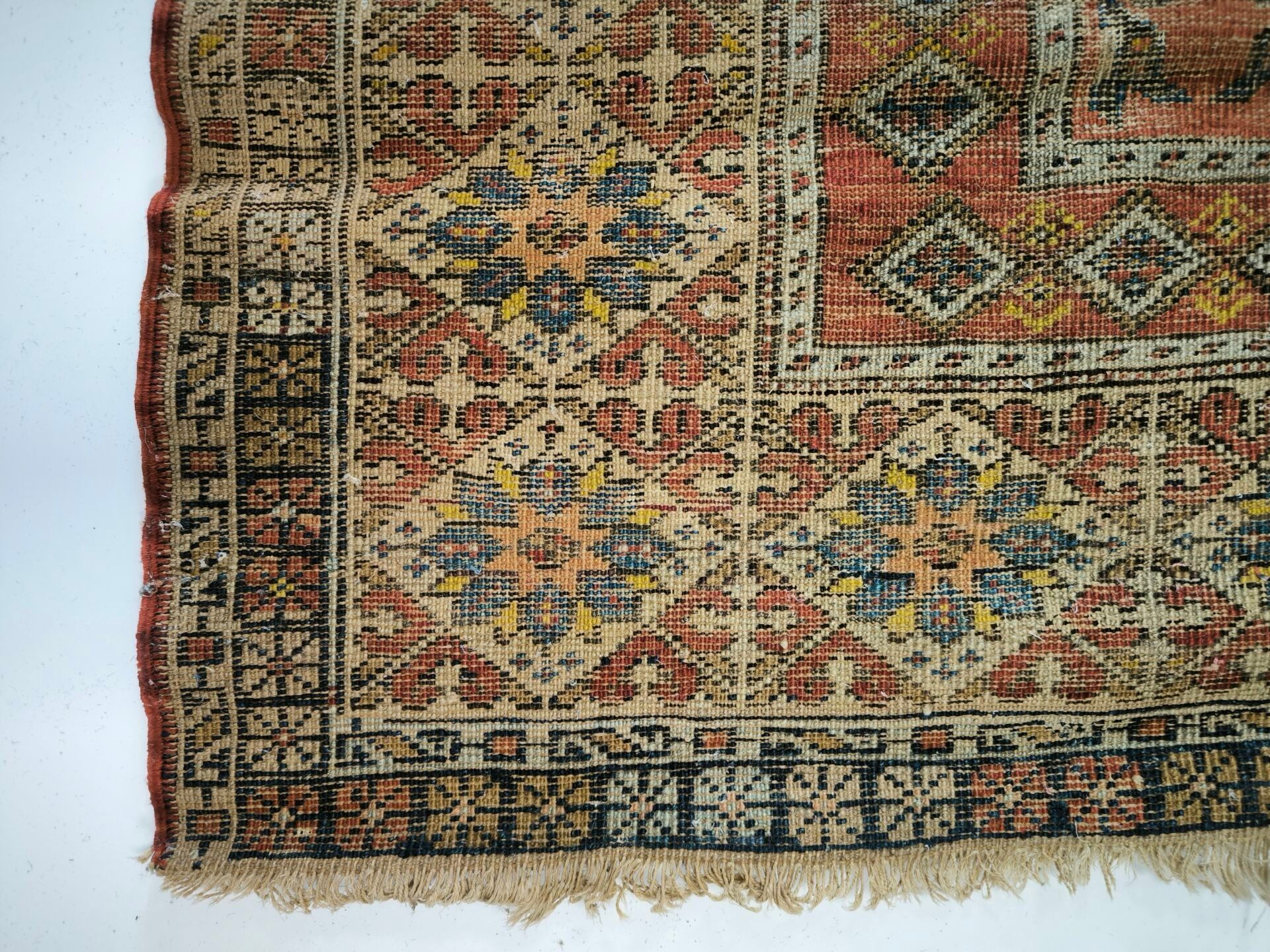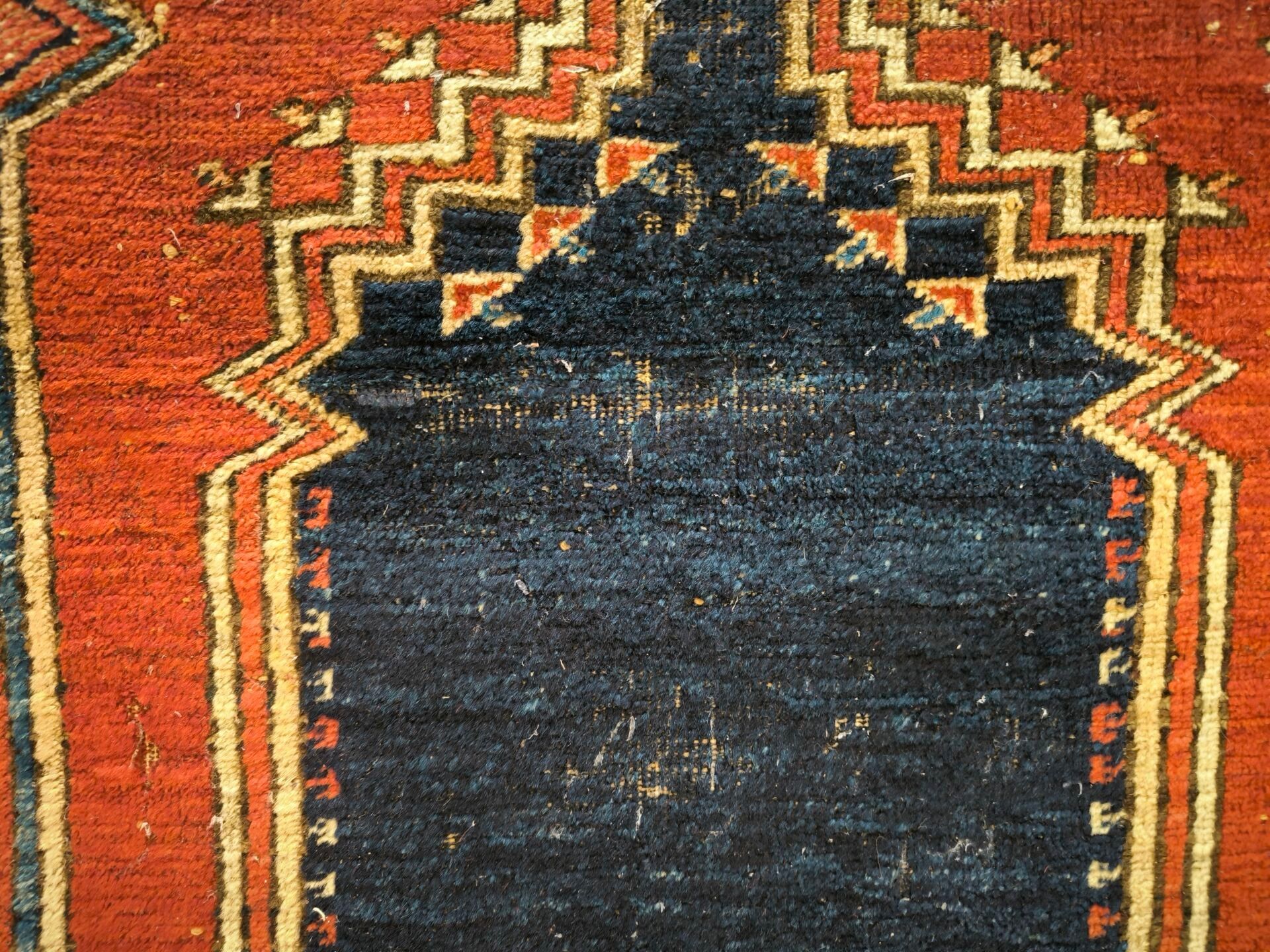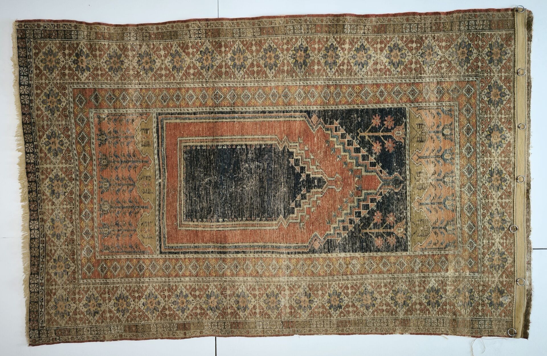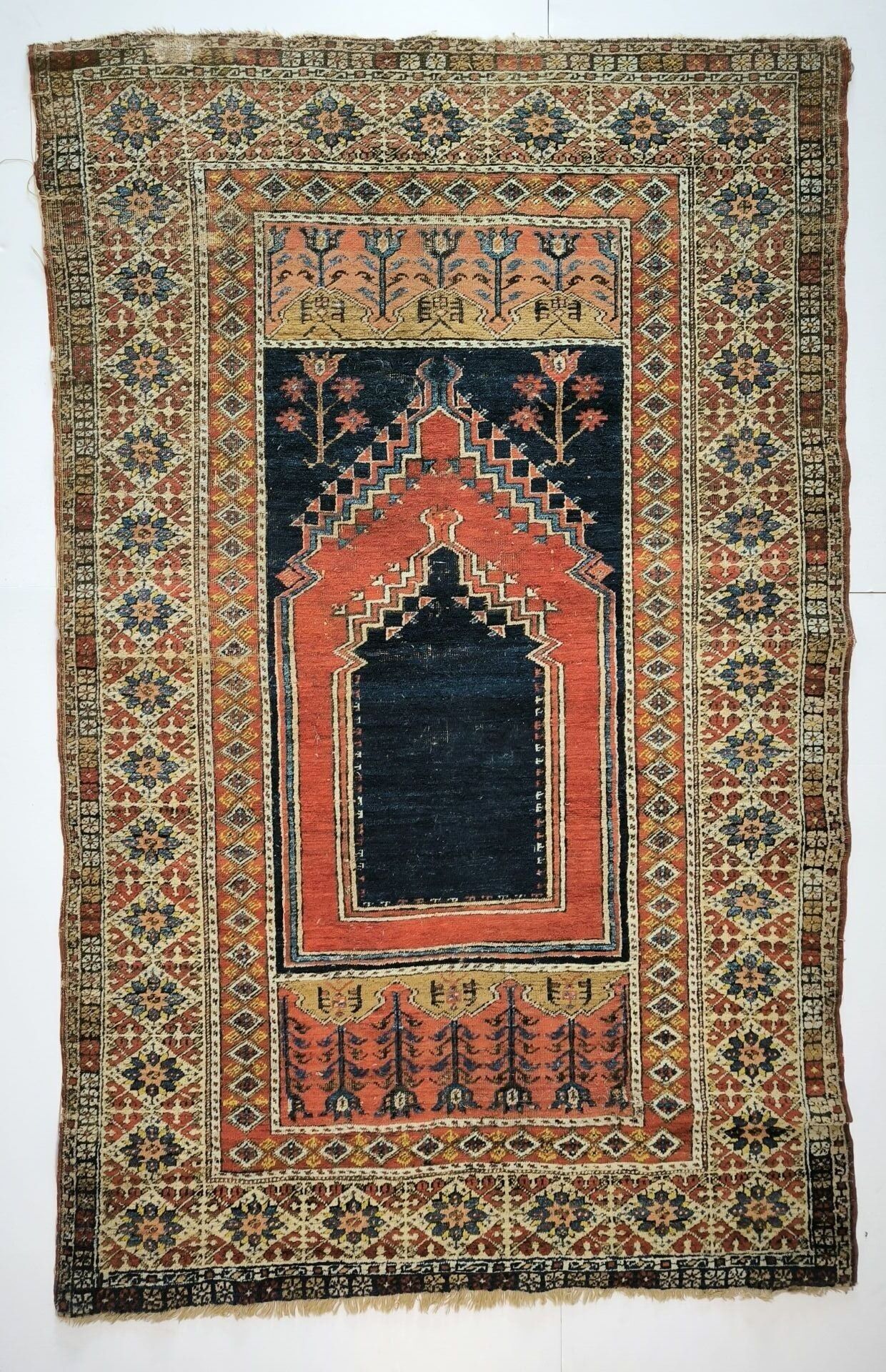 Ladik carpet, Anatolia, midnight blue background, decorated with a red arcature between tulips, two cartels of rows of tulips, border of flowers between braids (damage to one edge) 179 x 117 cm