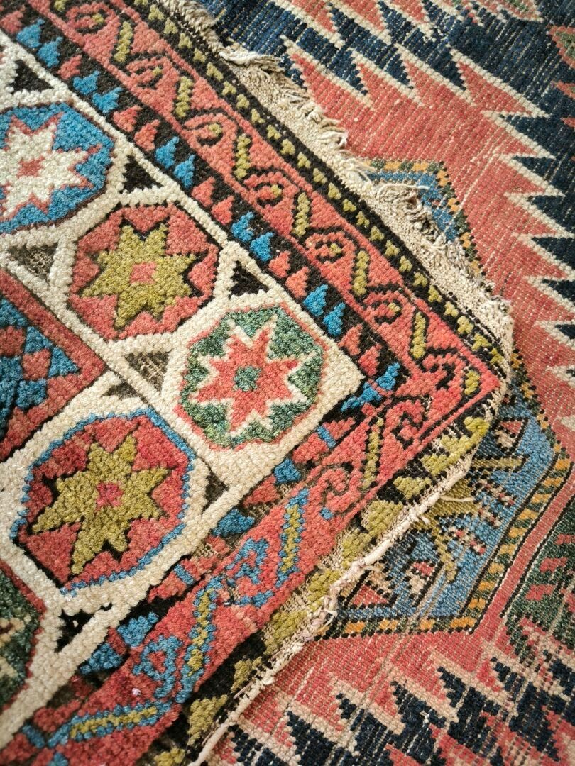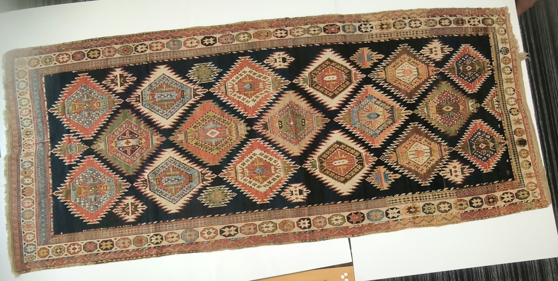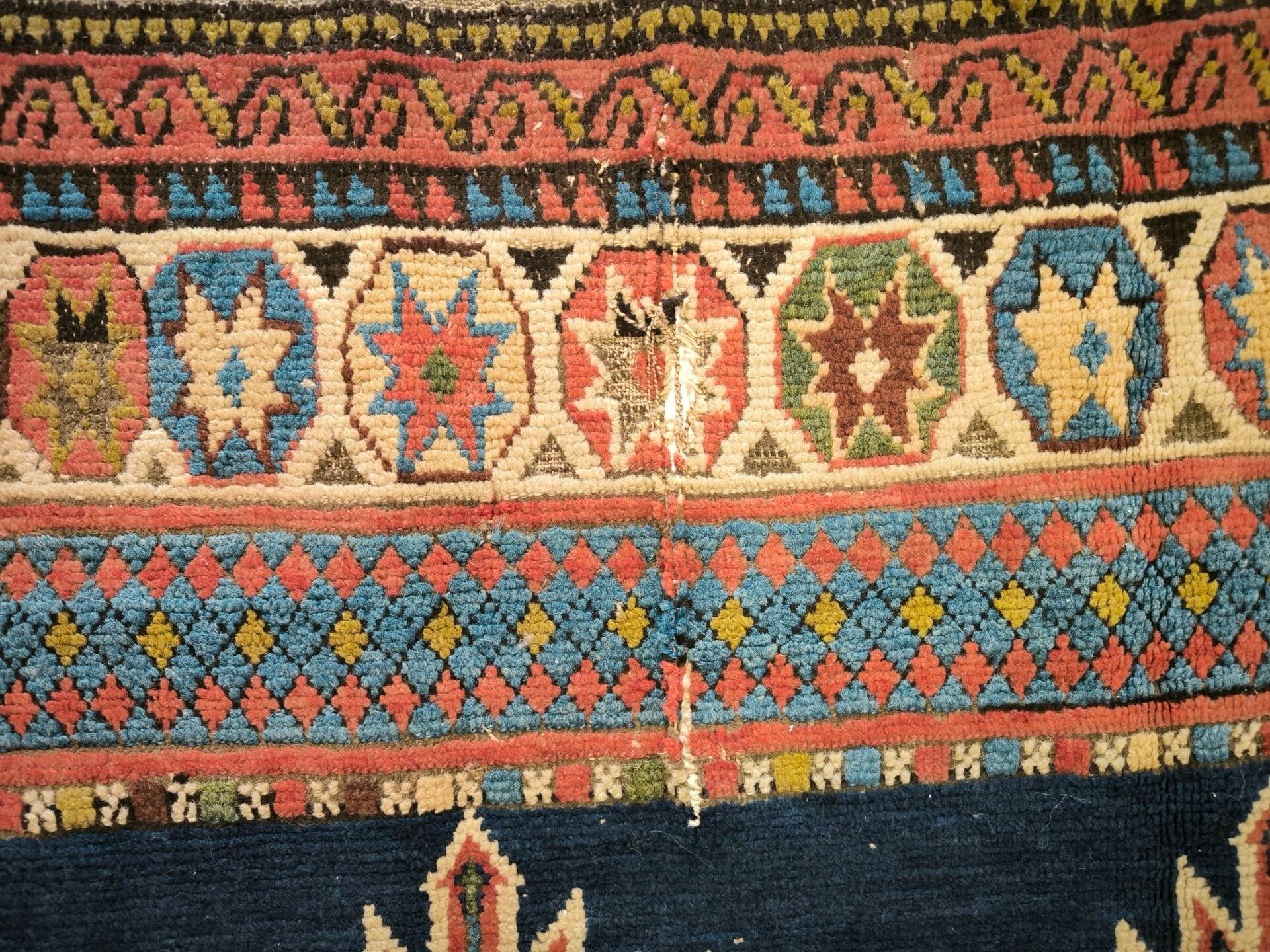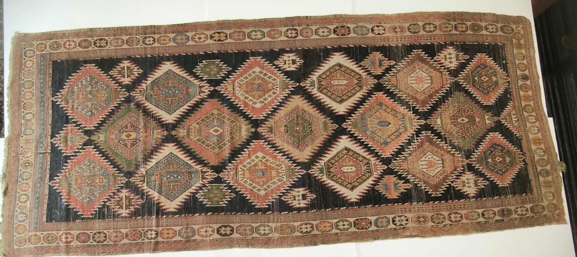 Carpet, Caucasus, black background, decoration of red, blue and green medallions bordered by flames, cream border of star medallions (wear, cut on one side, tear) 362 x 151 cm