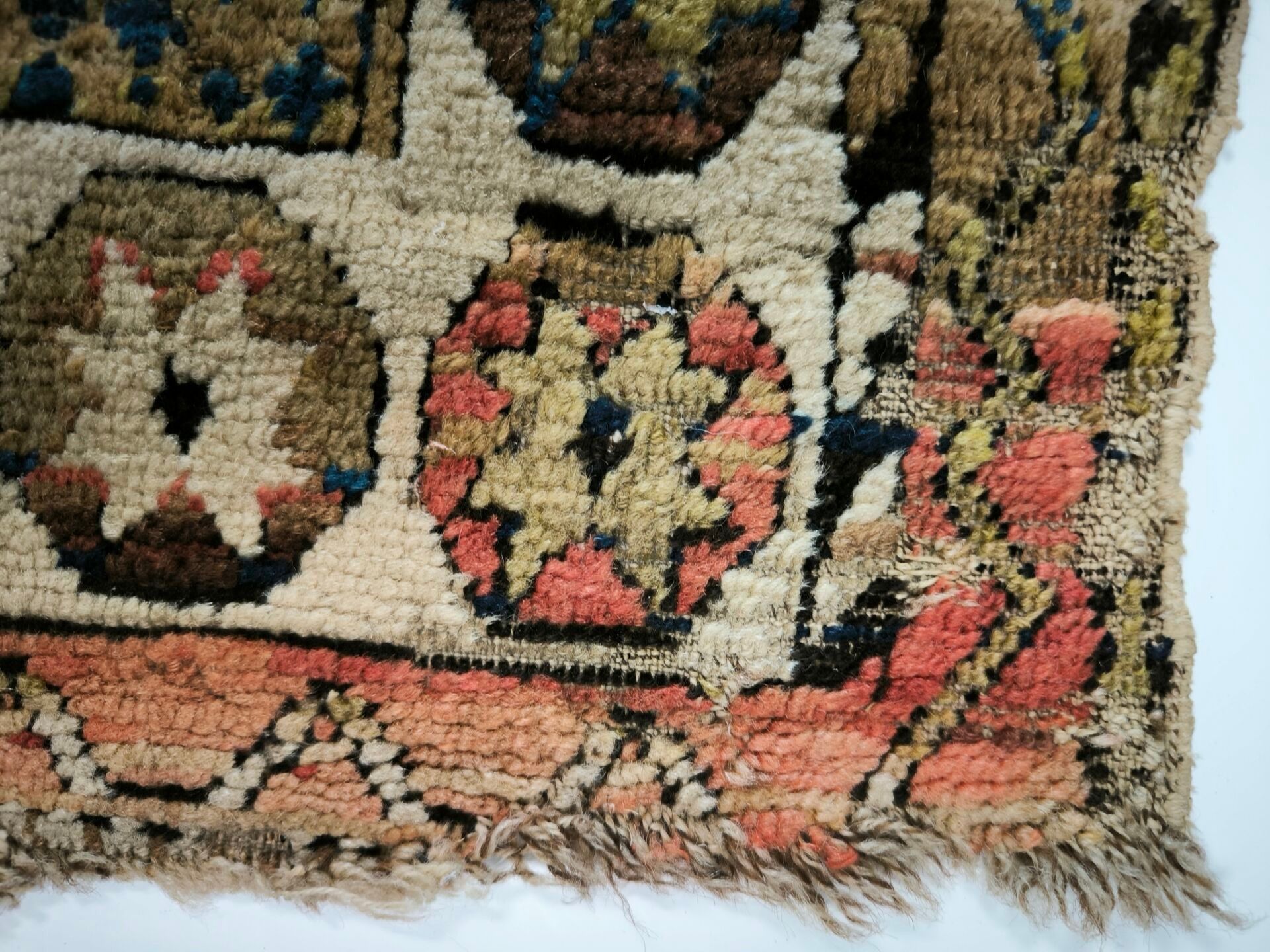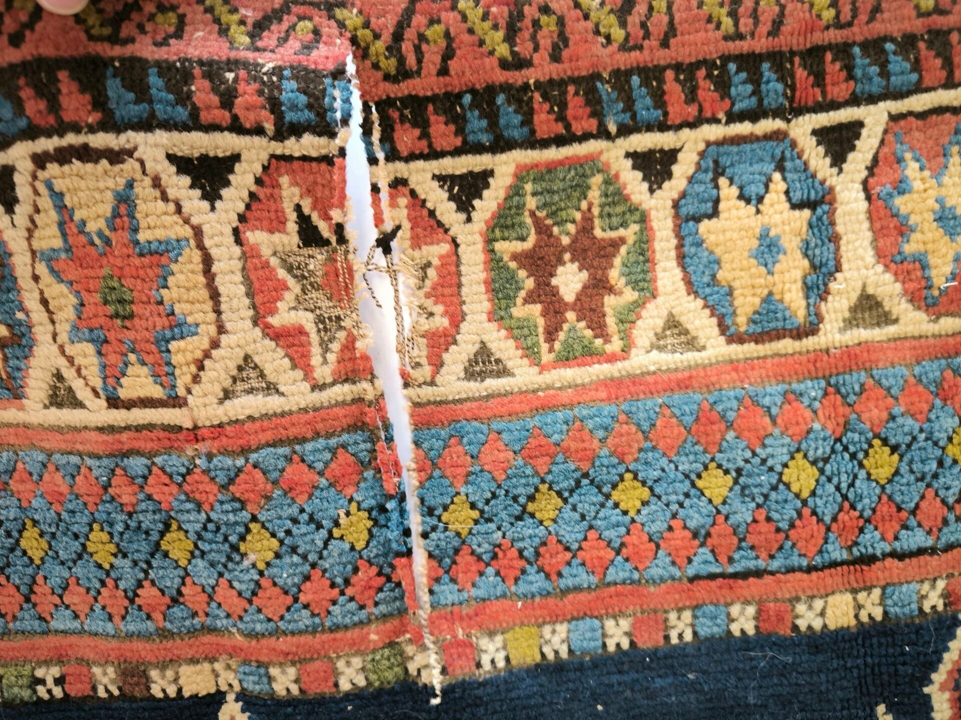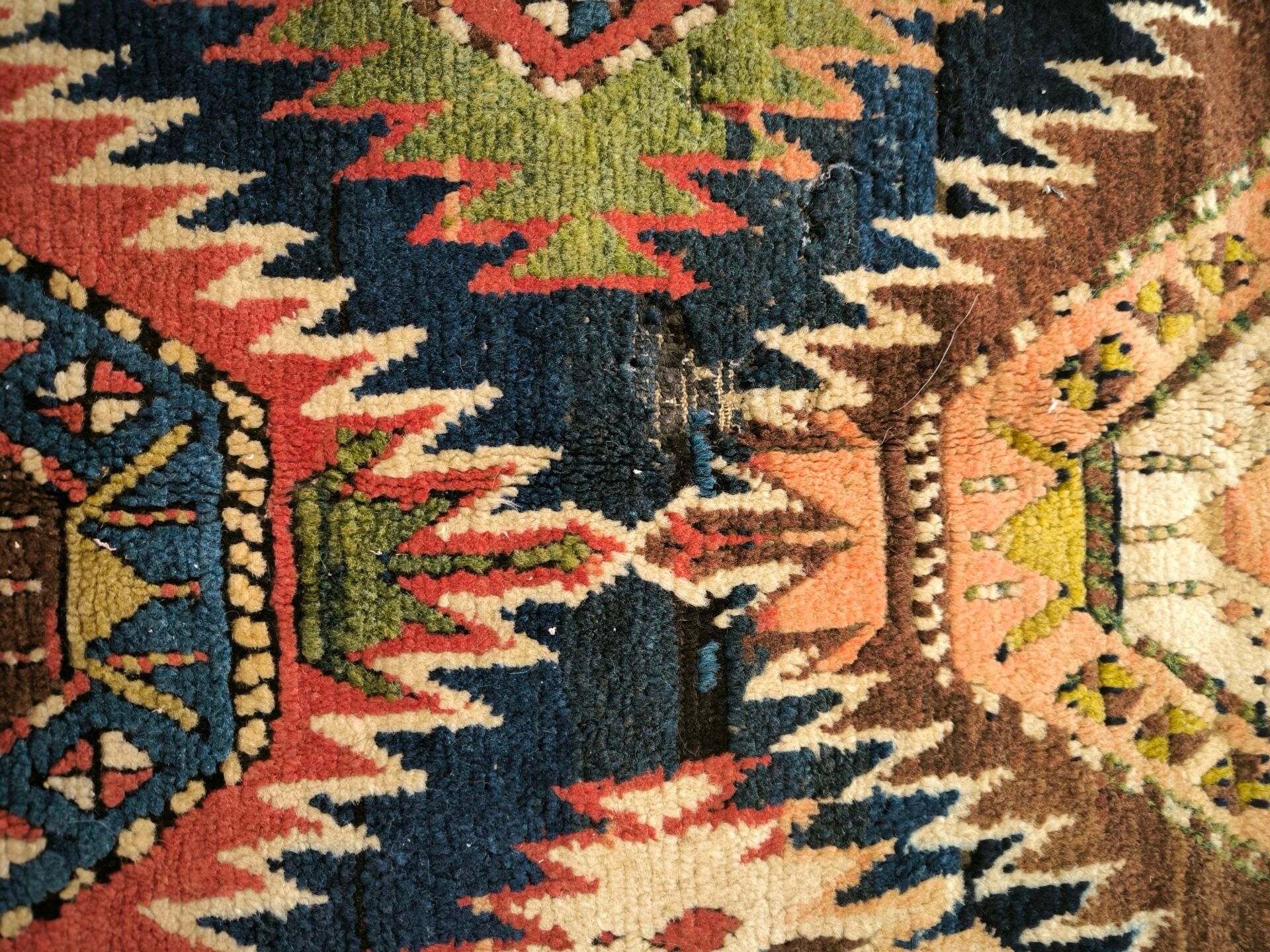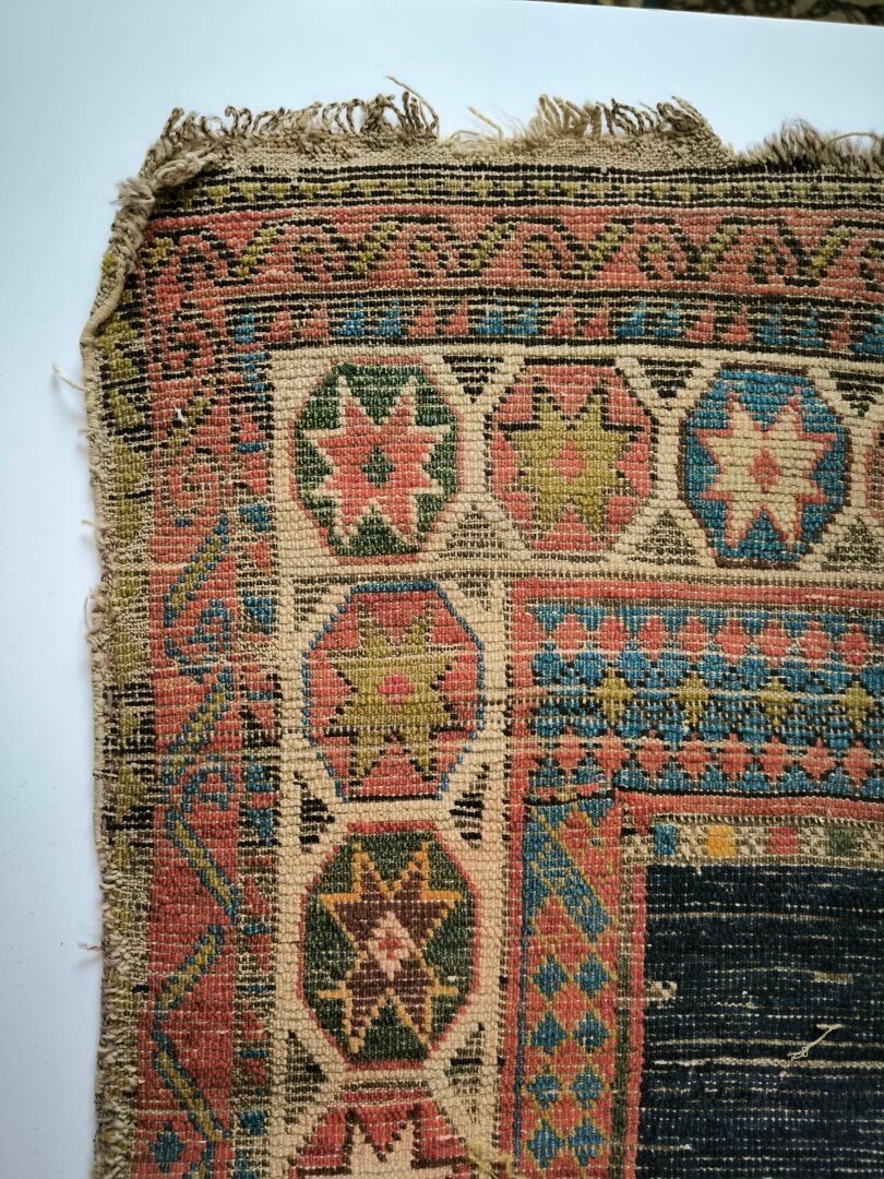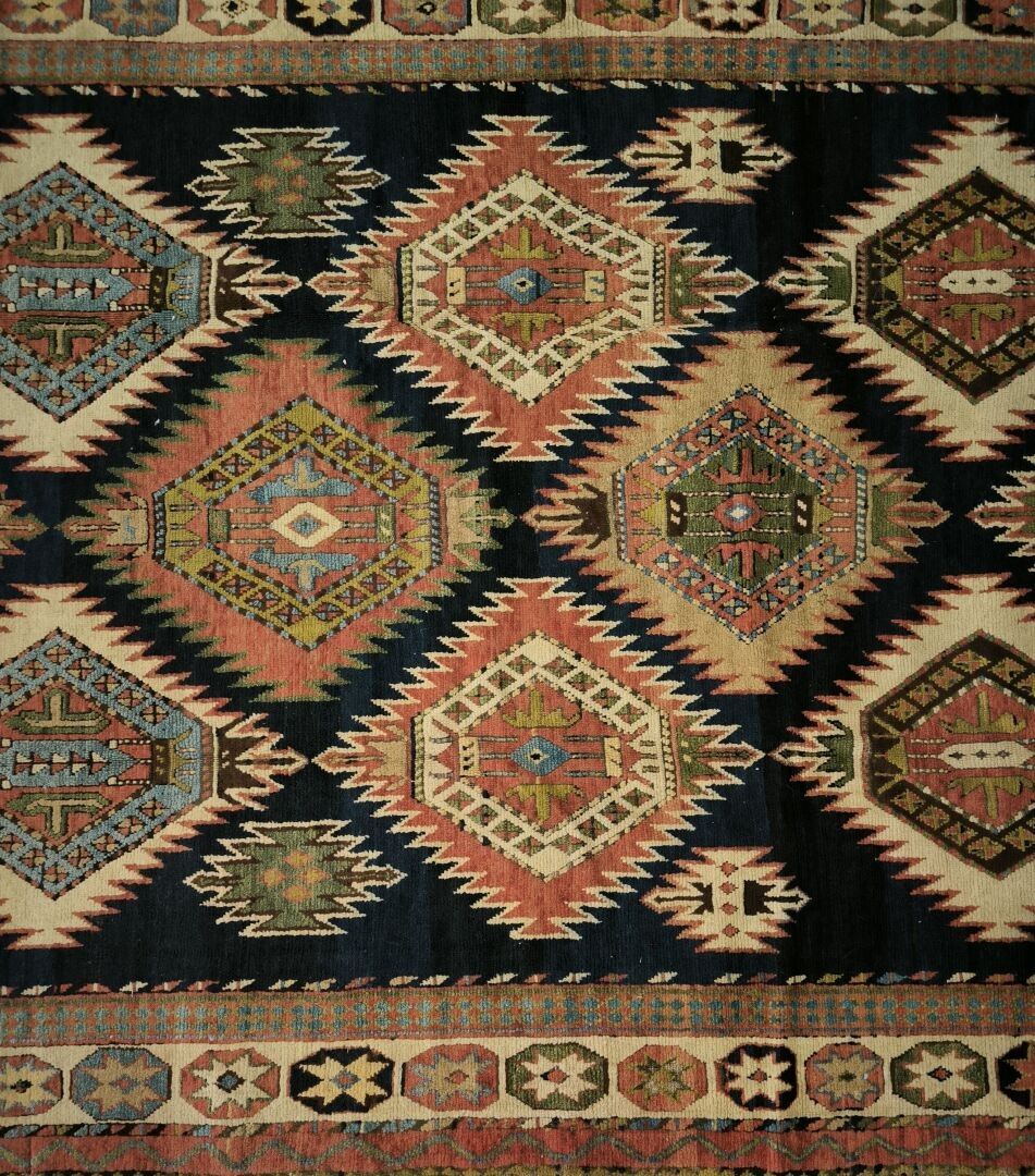 Carpet, Caucasus, black background, decoration of red, blue and green medallions bordered by flames, cream border of star medallions (wear, cut on one side, tear) 362 x 151 cm