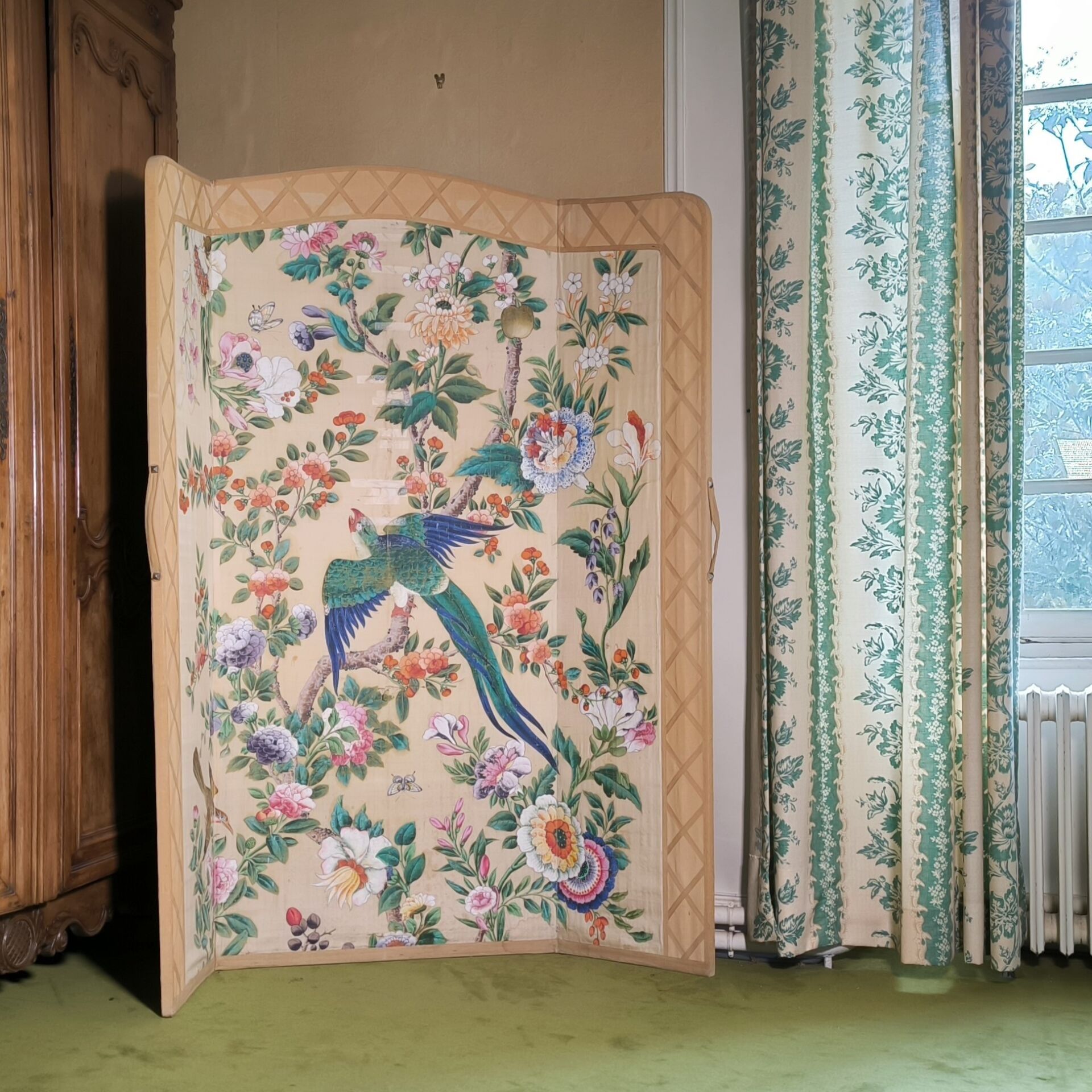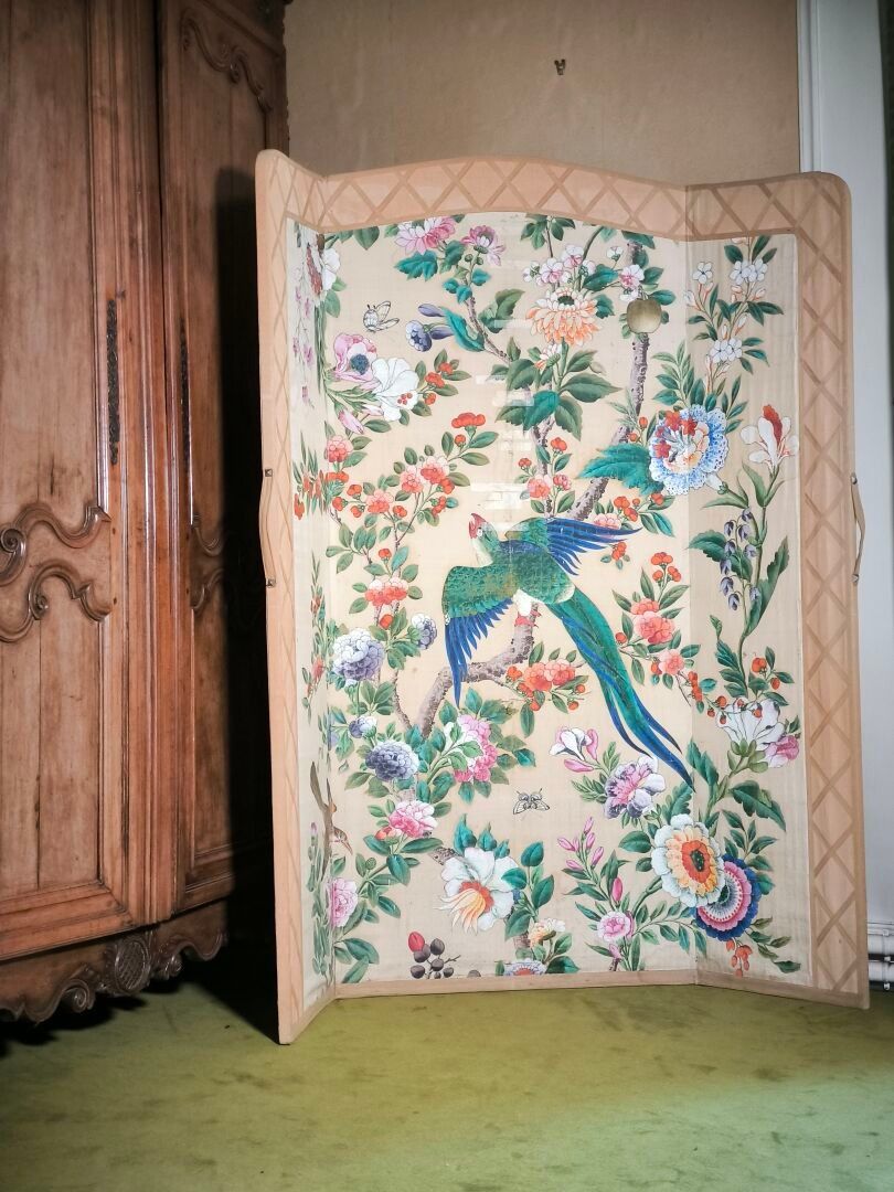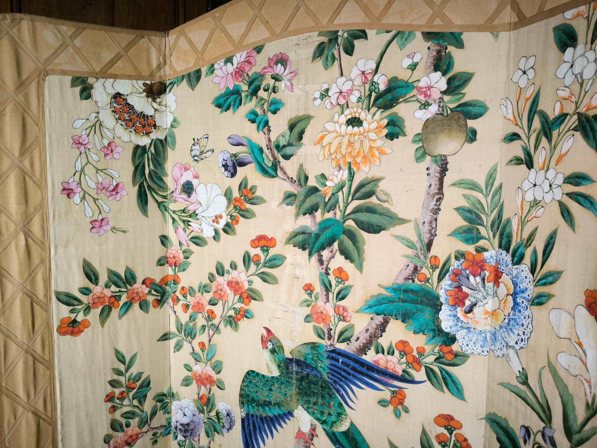Three-leaf folding screen lined with fabric painted in the Chinese style. 18th century- 19th century (acc.) 185 x 162 cm. Together with a large printed fan (71 cm - acc.)