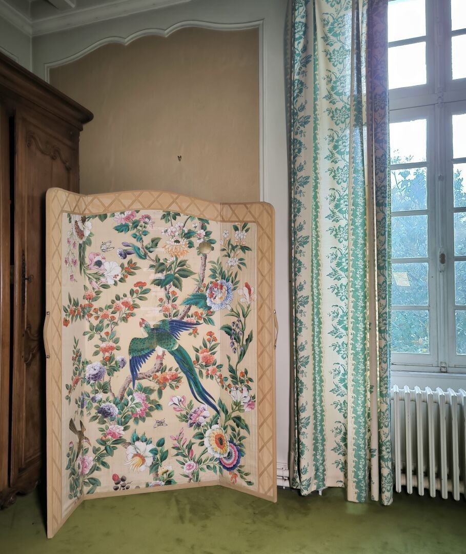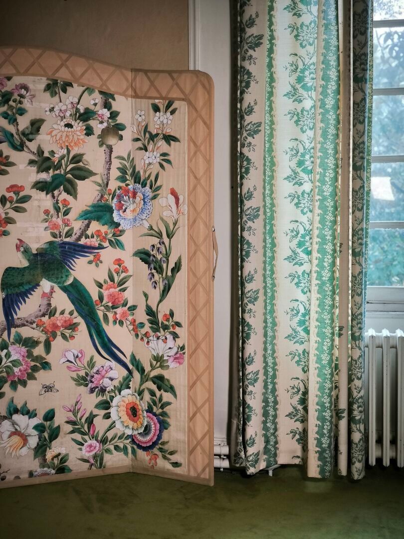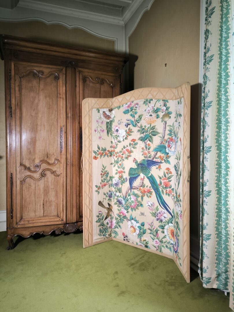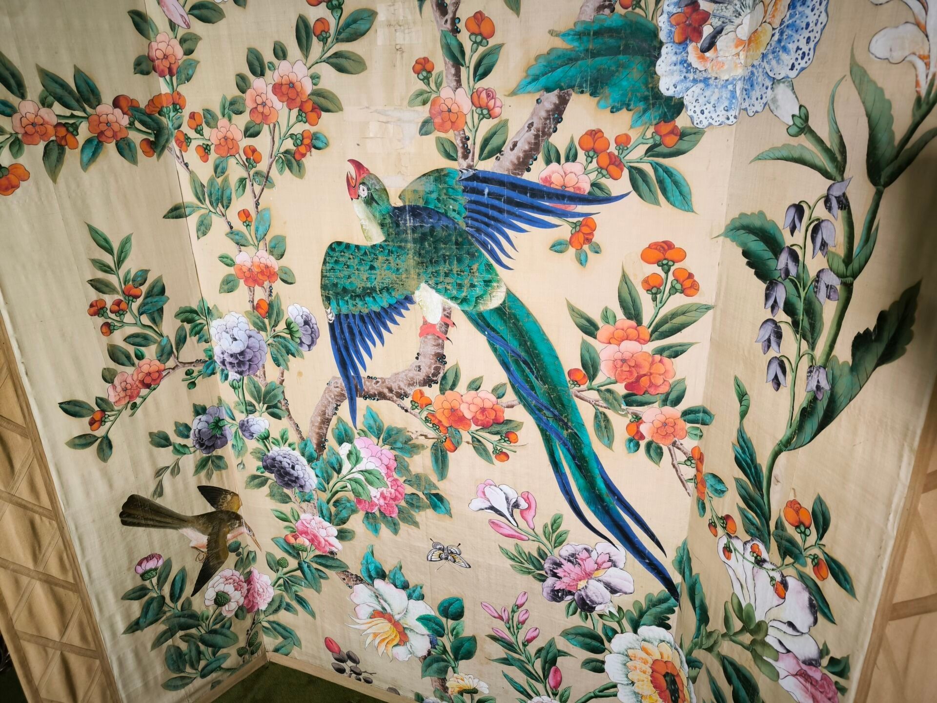Three-leaf folding screen lined with fabric painted in the Chinese style. 18th century- 19th century (acc.) 185 x 162 cm. Together with a large printed fan (71 cm - acc.)