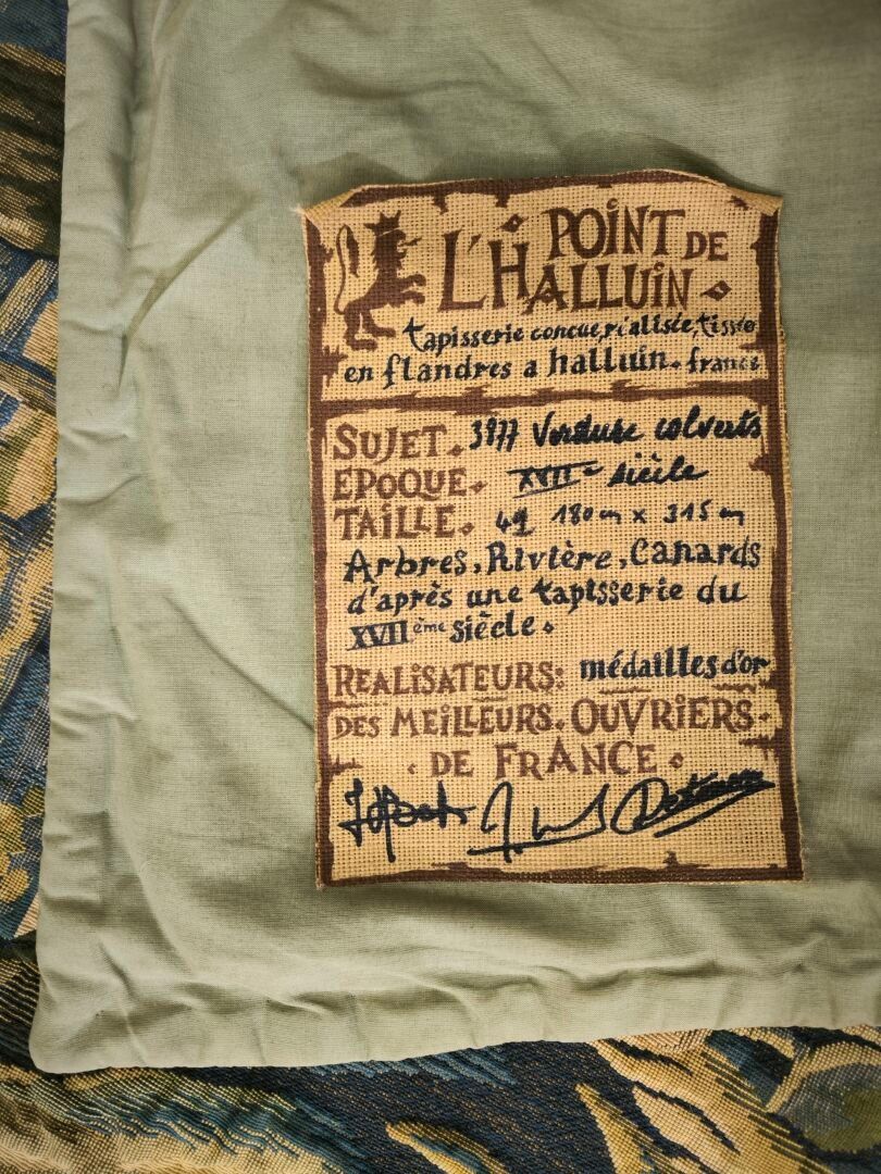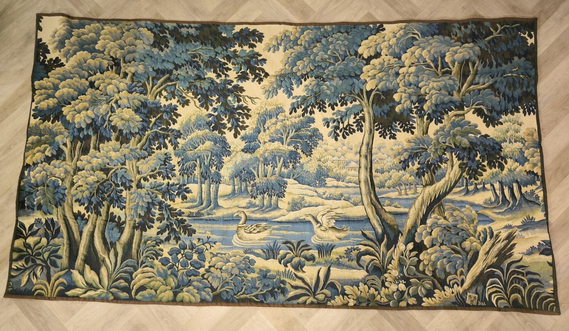 LES TAPISSERIES D'HALLUIN, 20th century. Trees, rivers, ducks. Machine tapestry, label. 180 x 315 cm