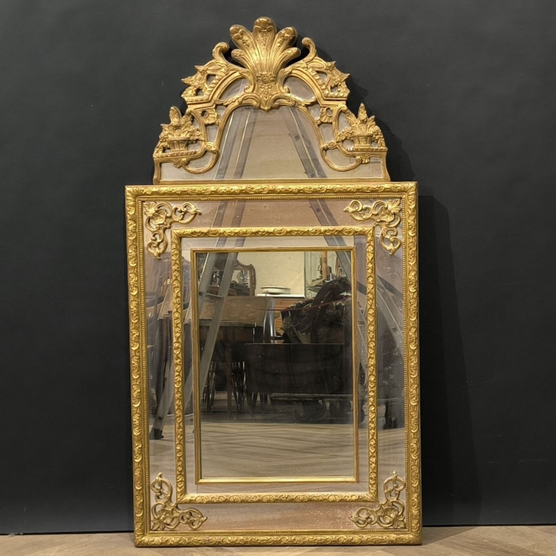 Carved and gilded wood window with pediment and glazing beads. Regency style. 121 x 67 cm