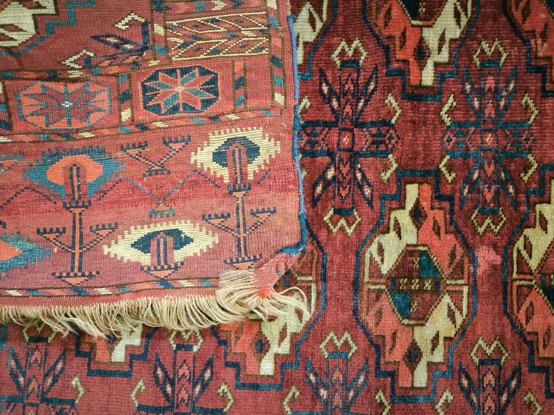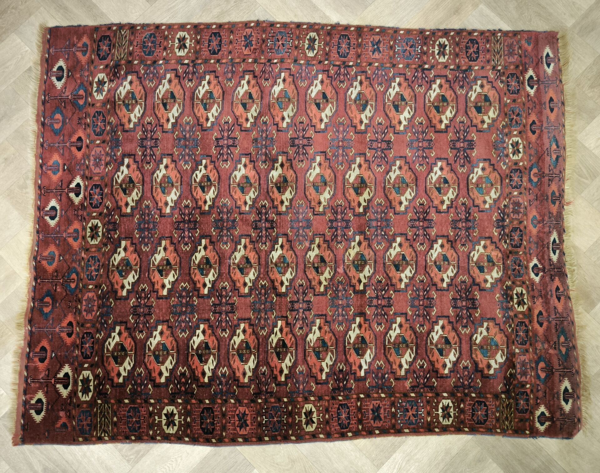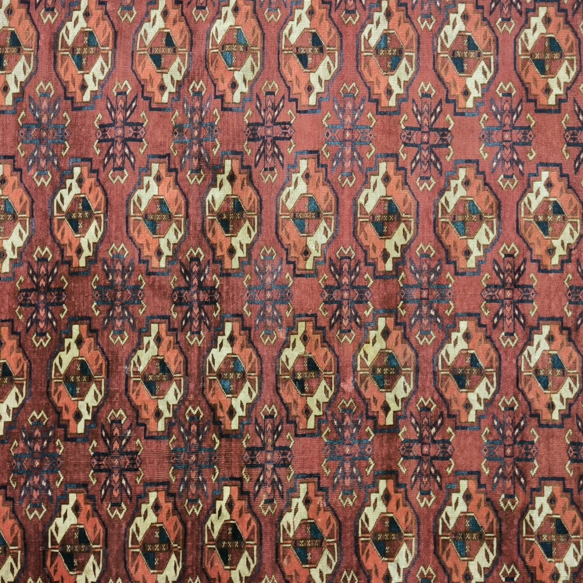 Tightly woven Oriental carpet with Bukhara motifs.