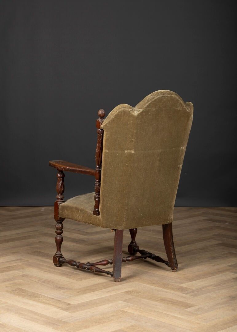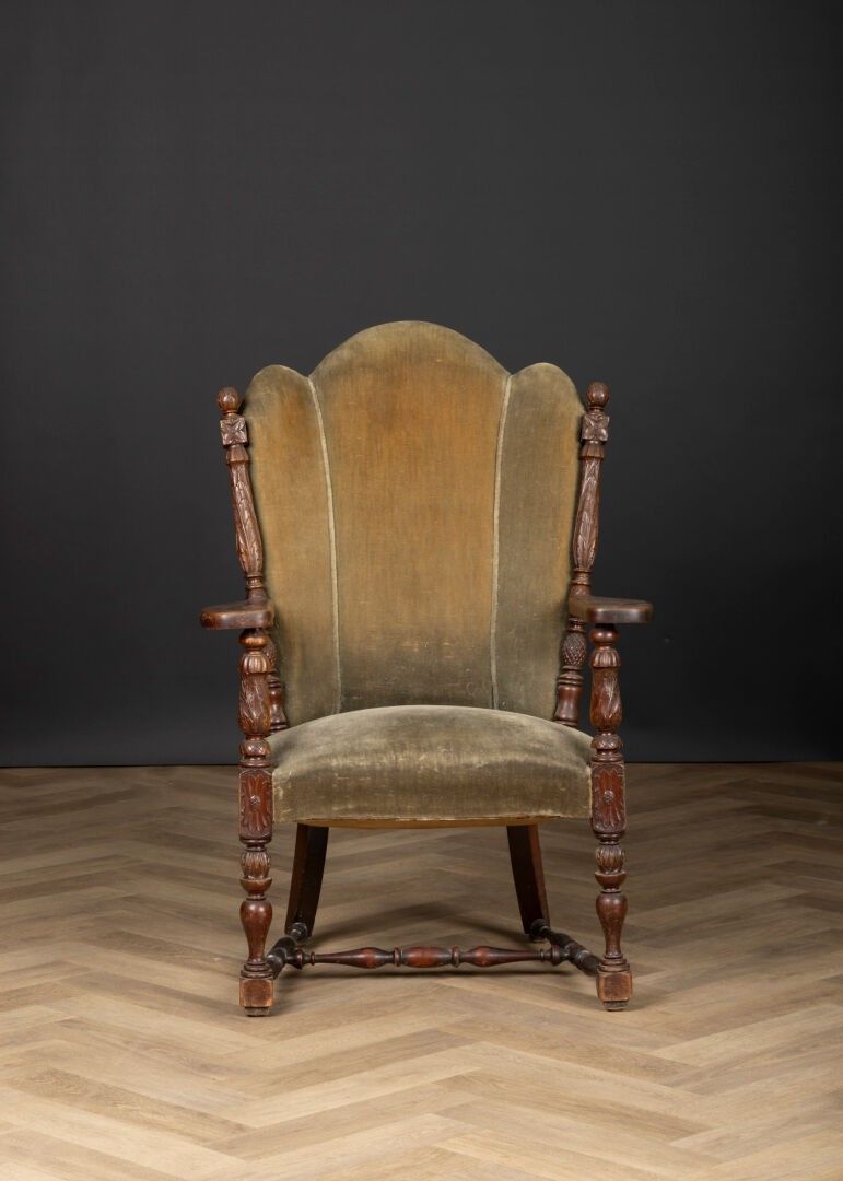 . Carved wooden armchair, green velvet upholstery (wear and …