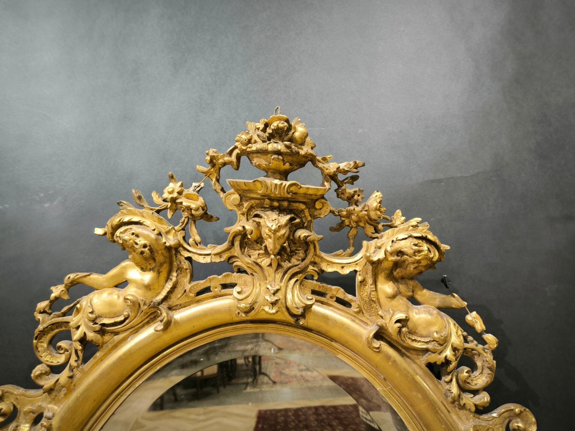 Oval glass in wood and gilded stucco, decorated with putti a…