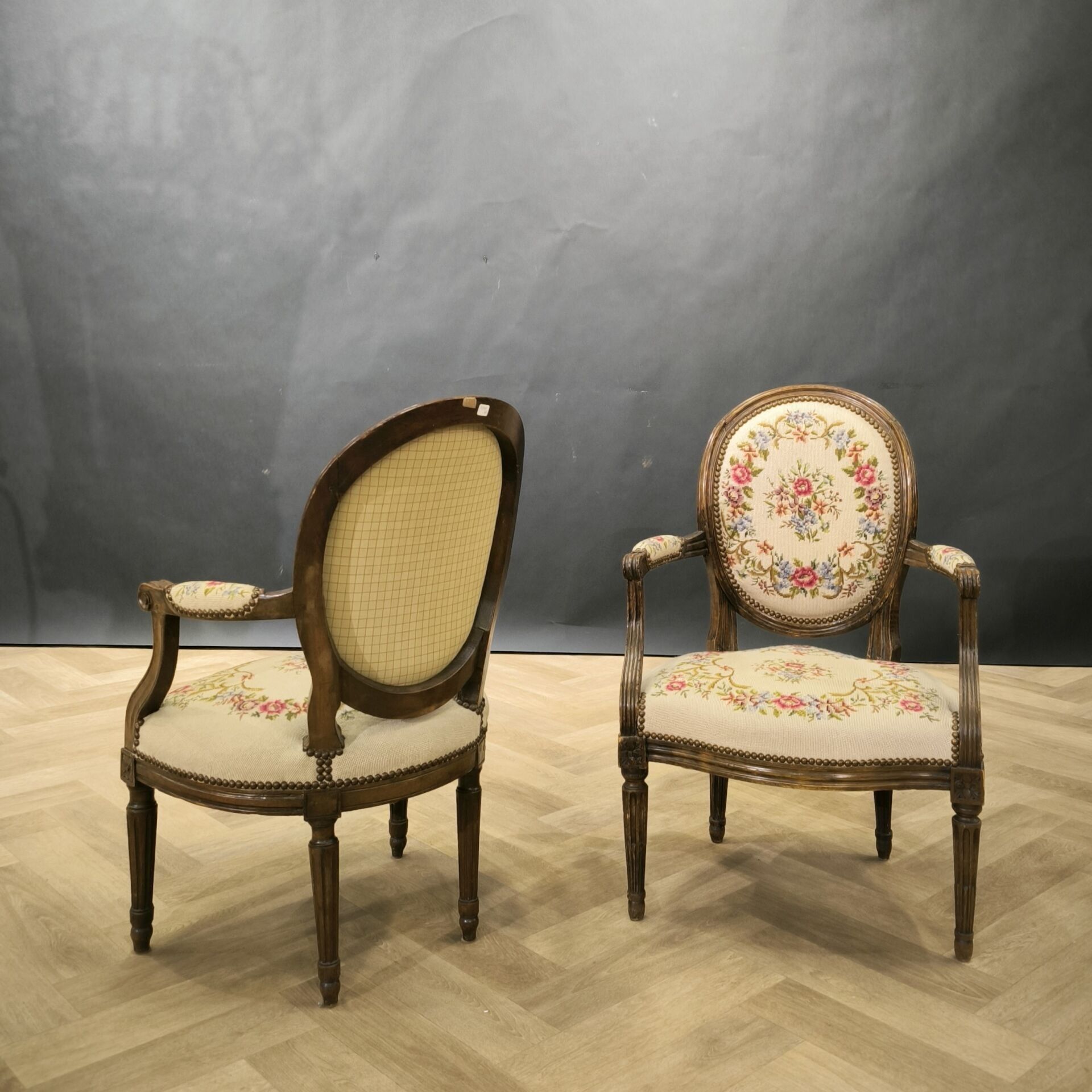 A pair of cabriolet medallion armchairs in moulded and carved natural wood, with fluted tapered legs. Louis XVI period.