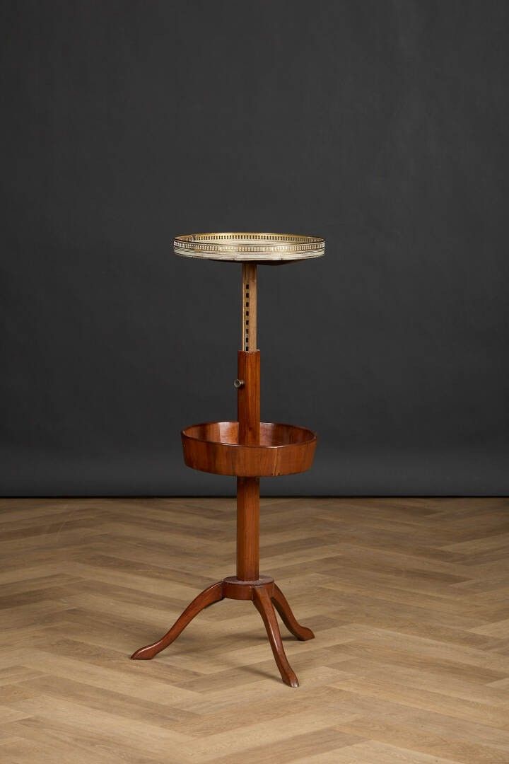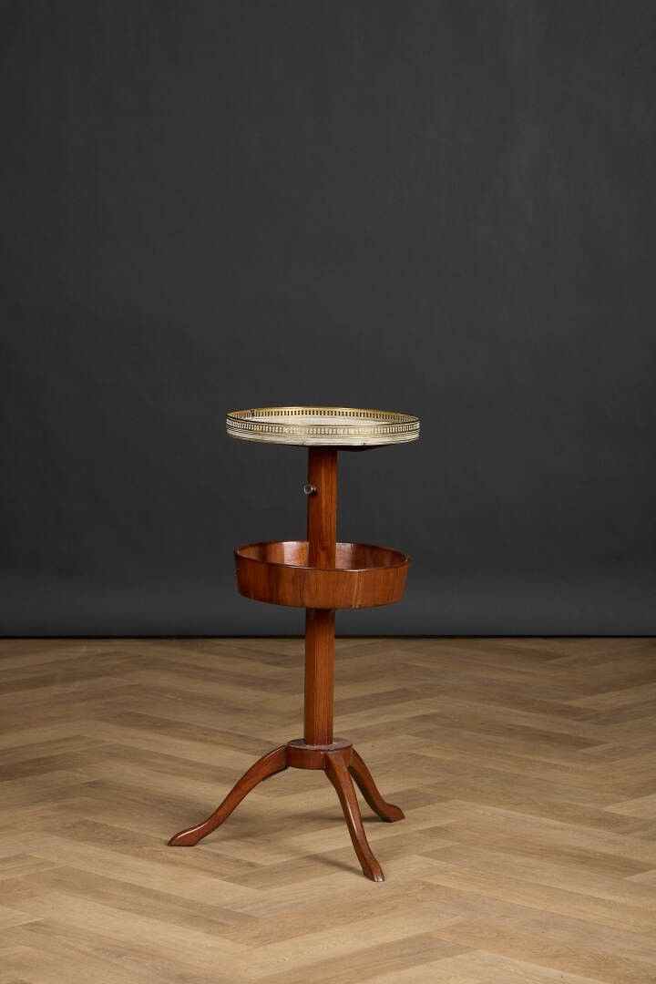 Small round side table with rack system, sewing basket and gallery marble top. 19th century. Acc. Height 74, diameter 32 cm