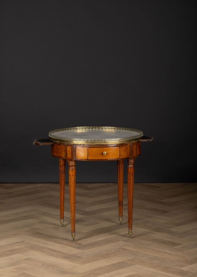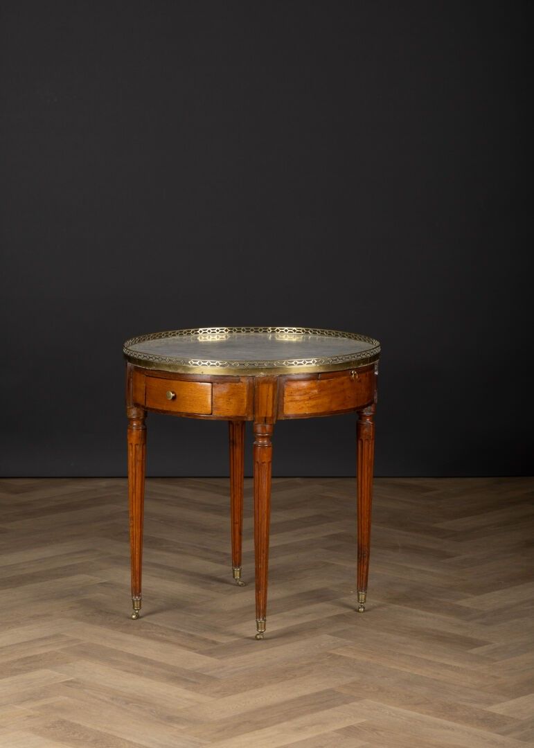 Mahogany hot-water bottle gueridon opening with two drawers and two shelves in the waist, veined white marble top, brass gallery, Louis XVI style (small accidents and missing parts) Height 71 cm, diameter 66 cm