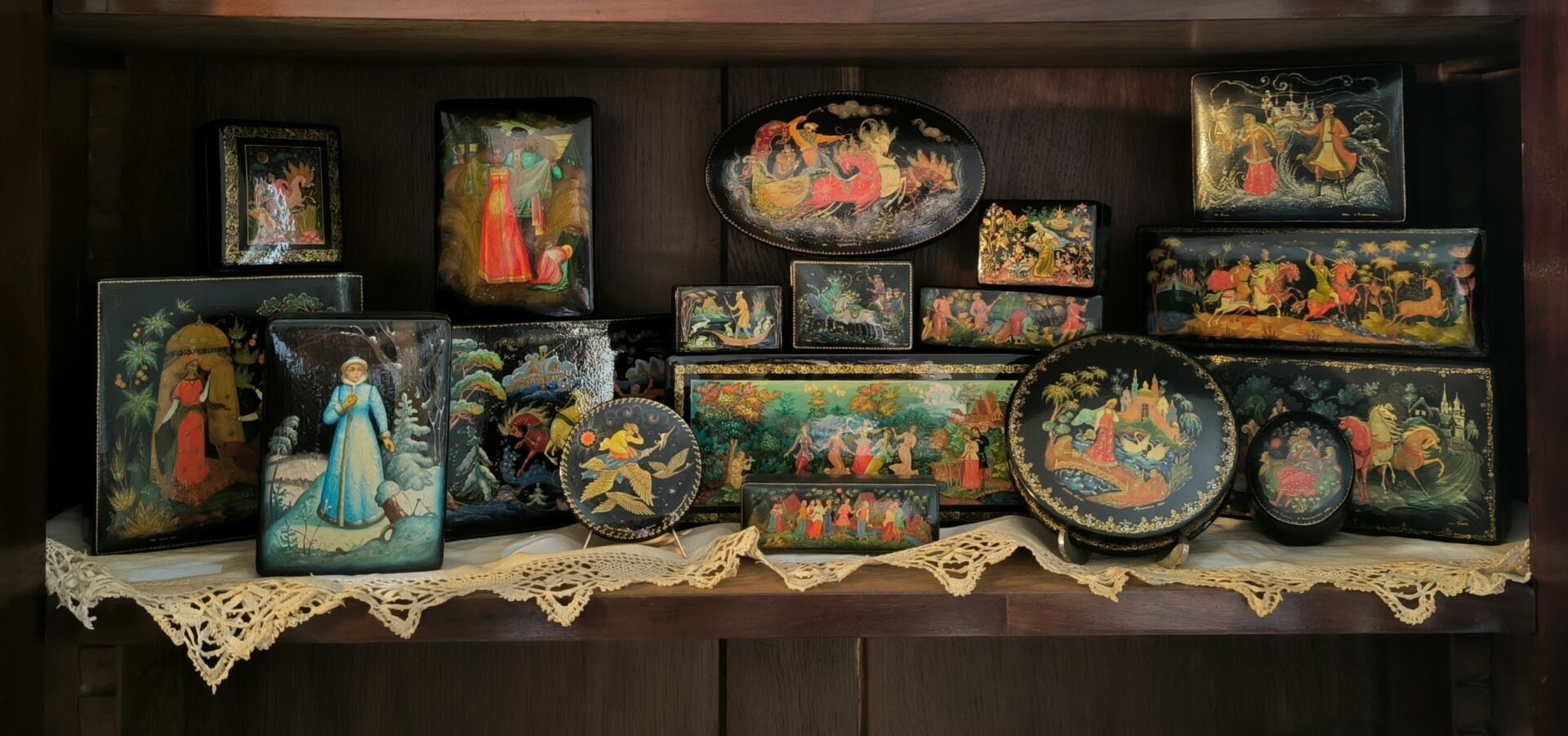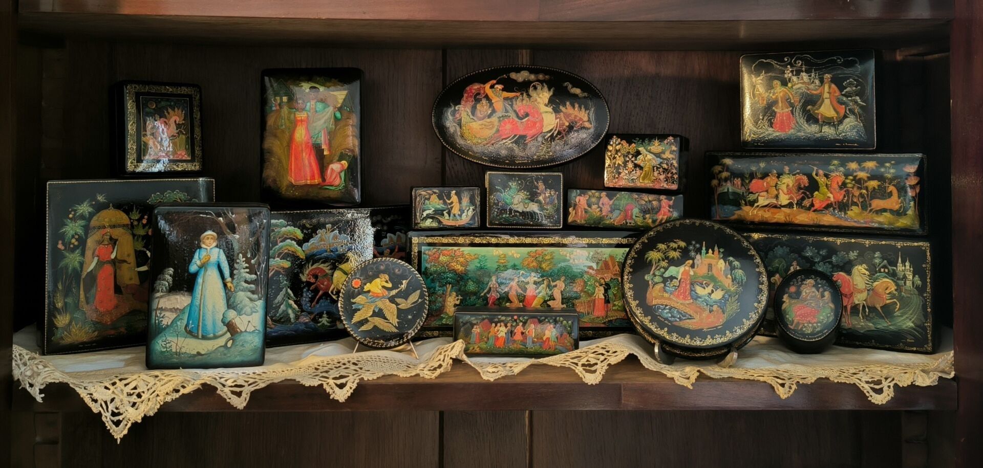 . RUSSIA - Fedoskino or Palekh school. Set of 18 boxes with painted figures.