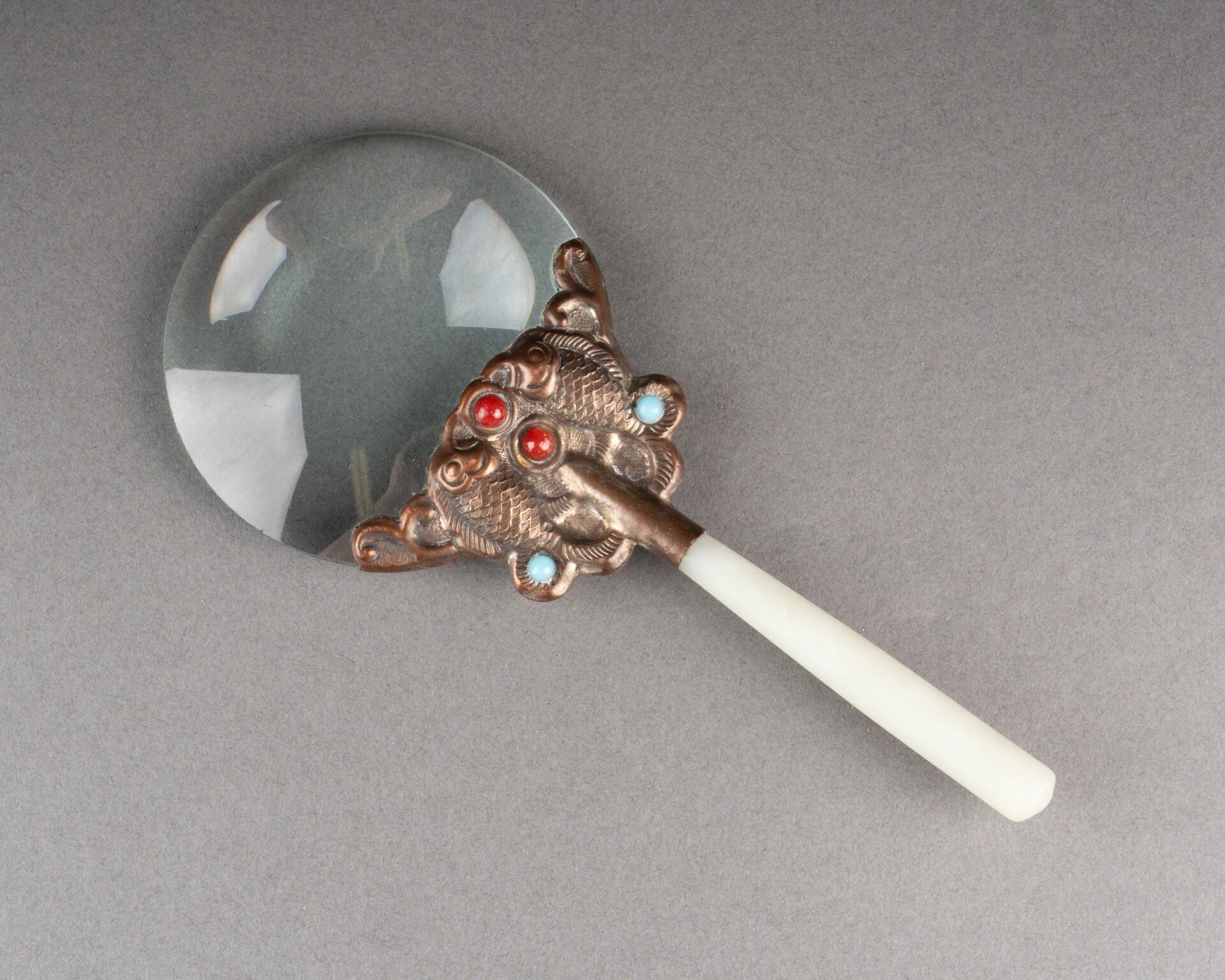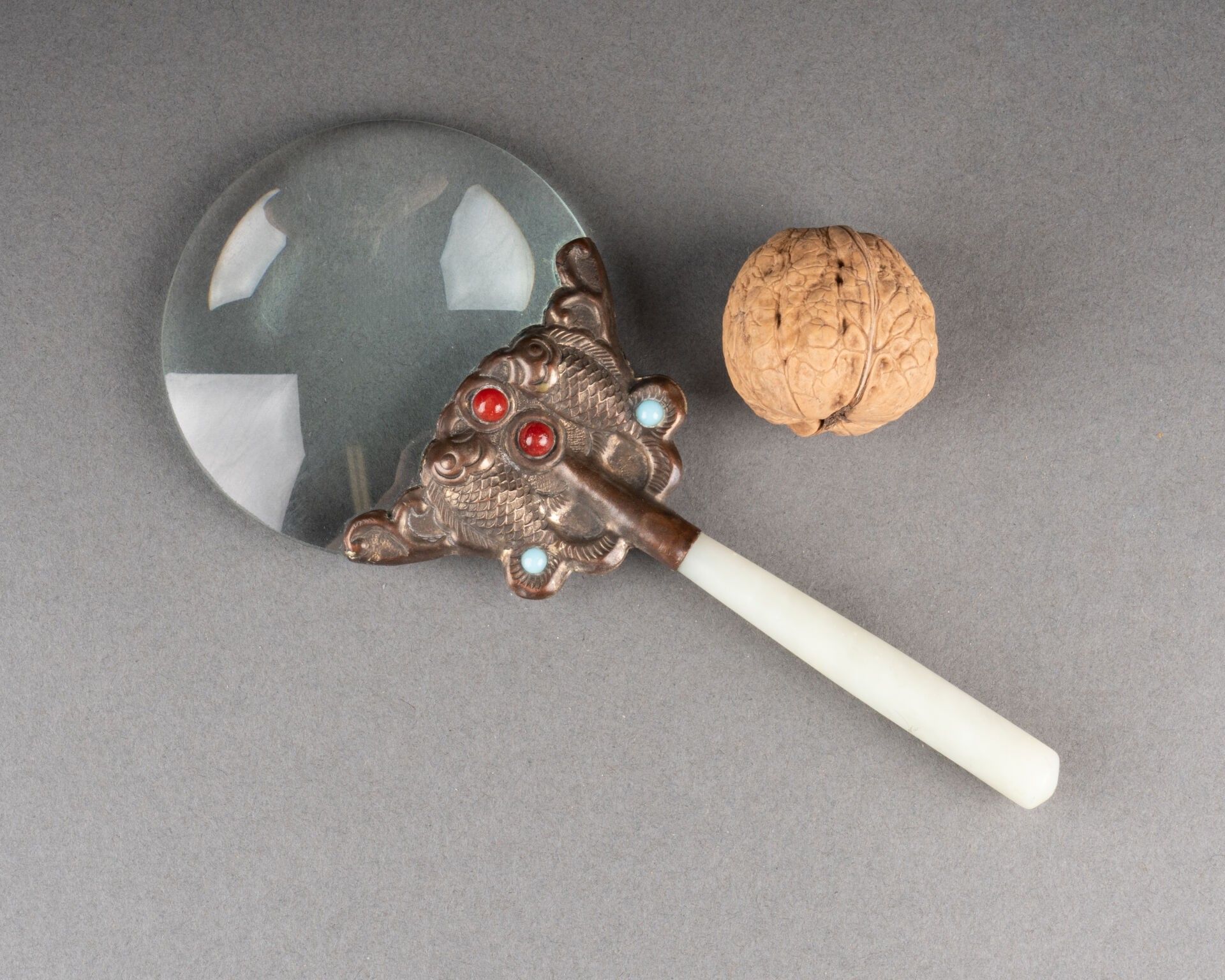 White jade handle, silver-plated metal frame embellished with turquoise cabochons