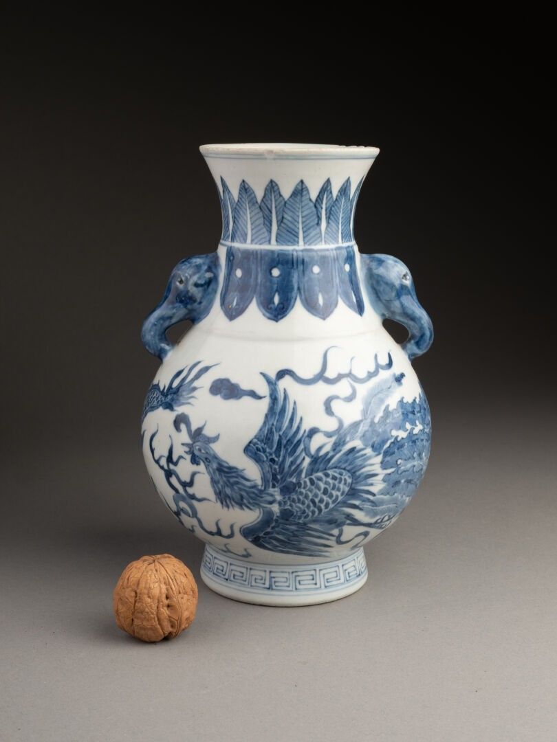 CHINA - 20th century. Baluster vase decorated with dragon and phoenix chasing the sacred pearl in the clouds, zoomorphic handles