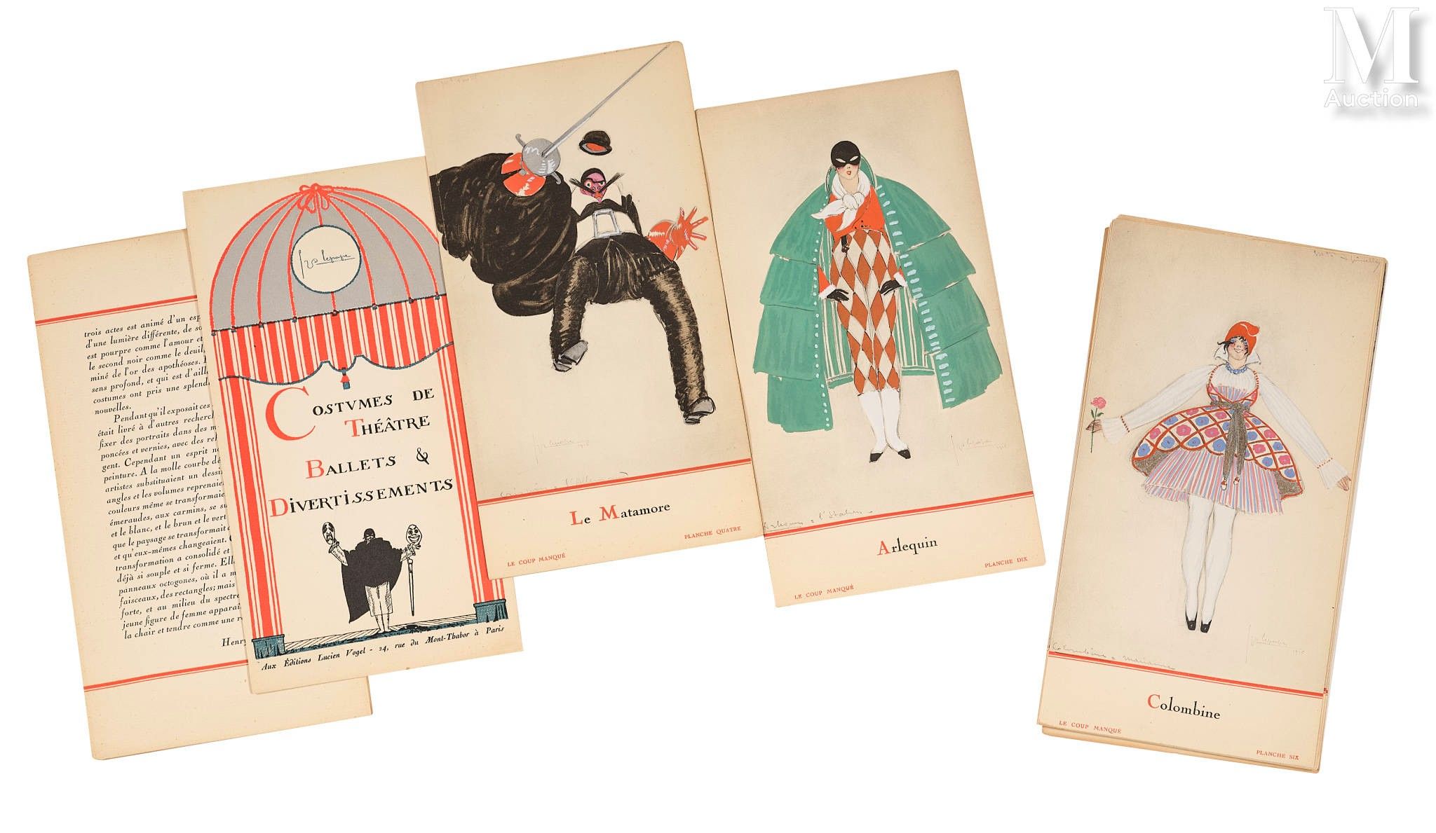 Small in-4 (23.8 x 12.4 cm) in ff. 21 colour plates by Georges Lepape, stencilled by Saudé, some with silver highlights, with a preface by Henri Bidou, representing a set and nine costumes for the ballet Le Coup manqué by Rip and two sets and eight costumes for L'Enfantement du mort by Marcel l'Herbier.