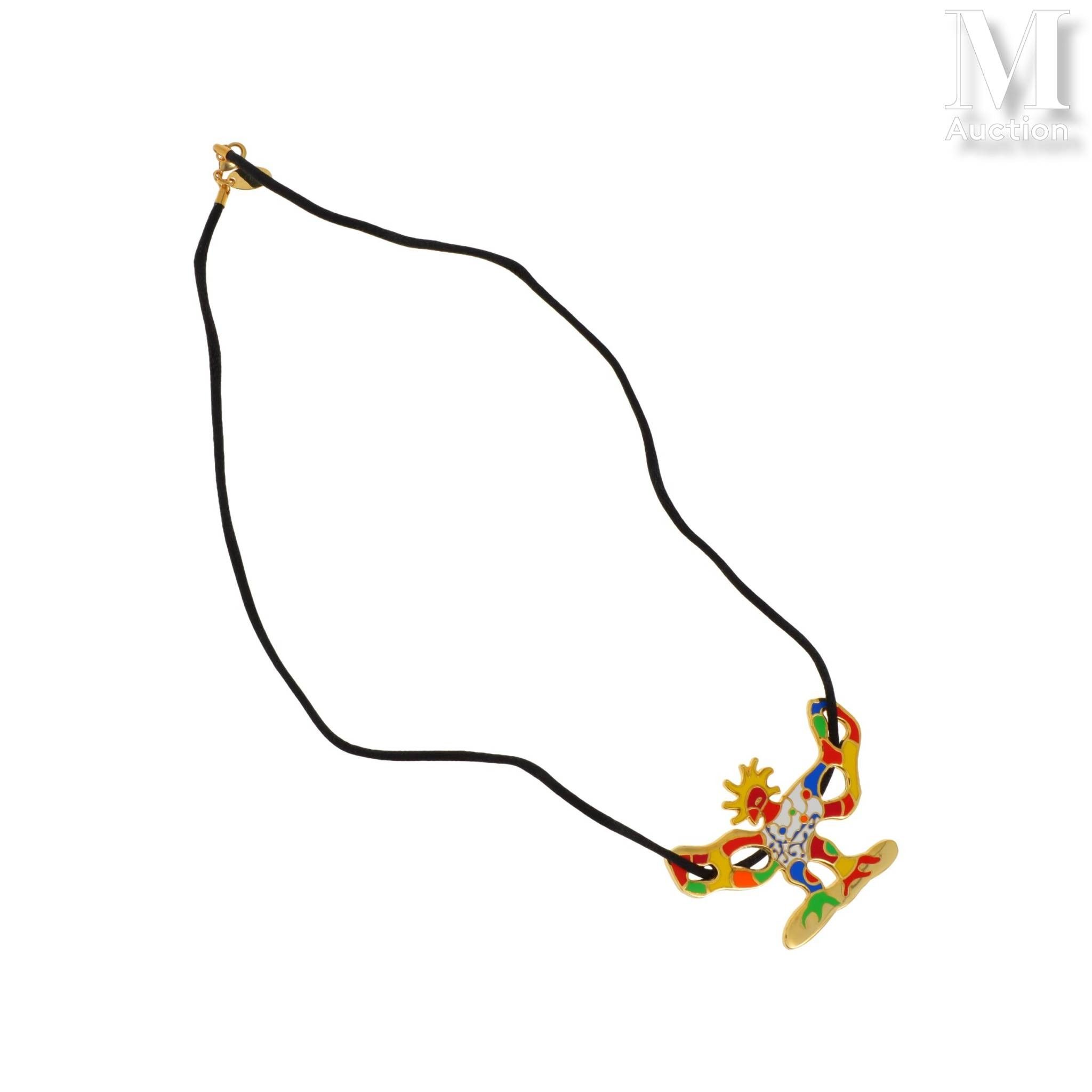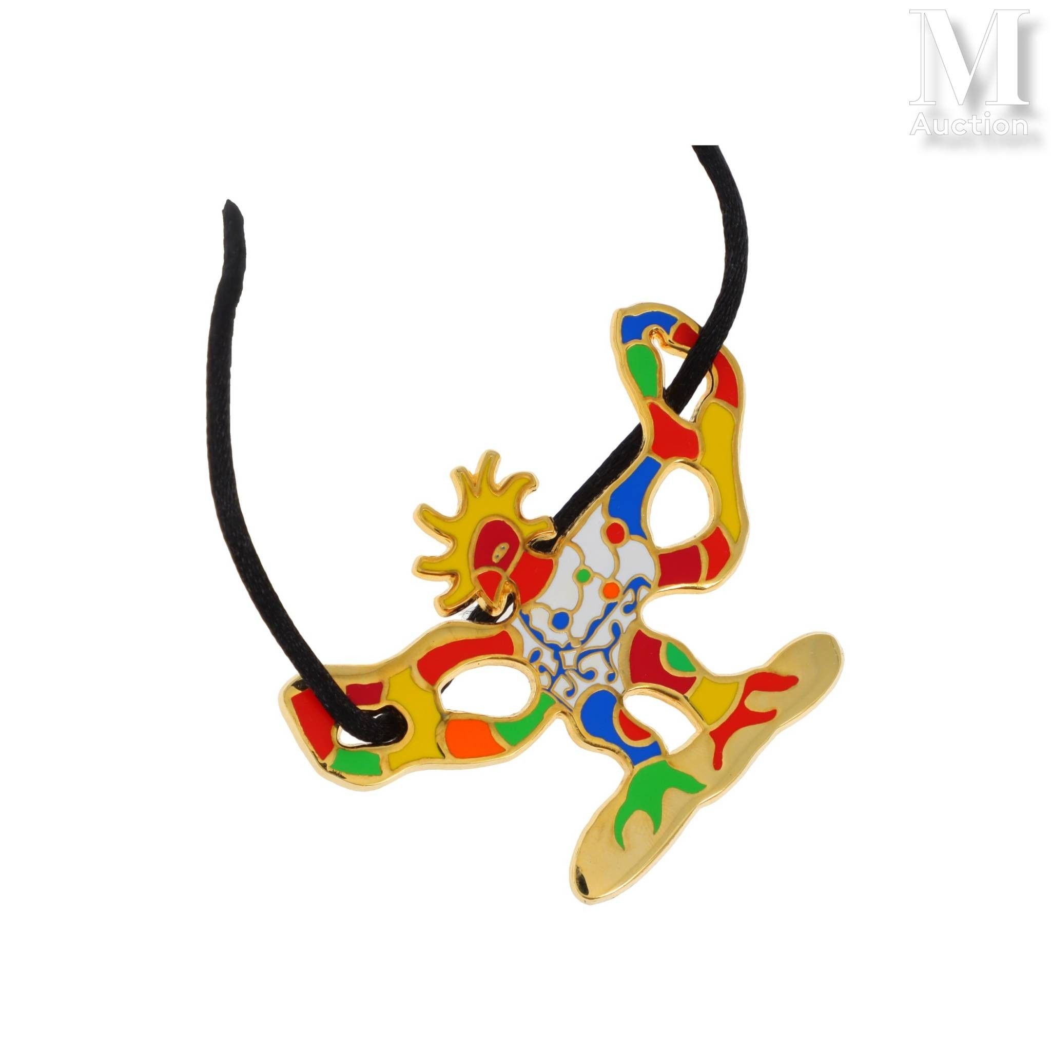 Gilded metal and polychrome enamel pendant brooch with silk cord necklace.