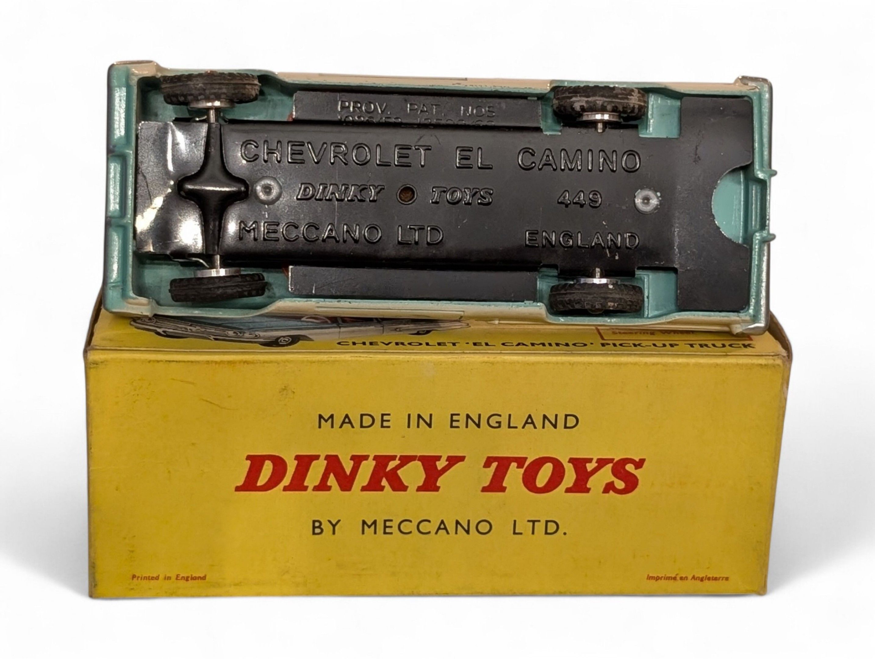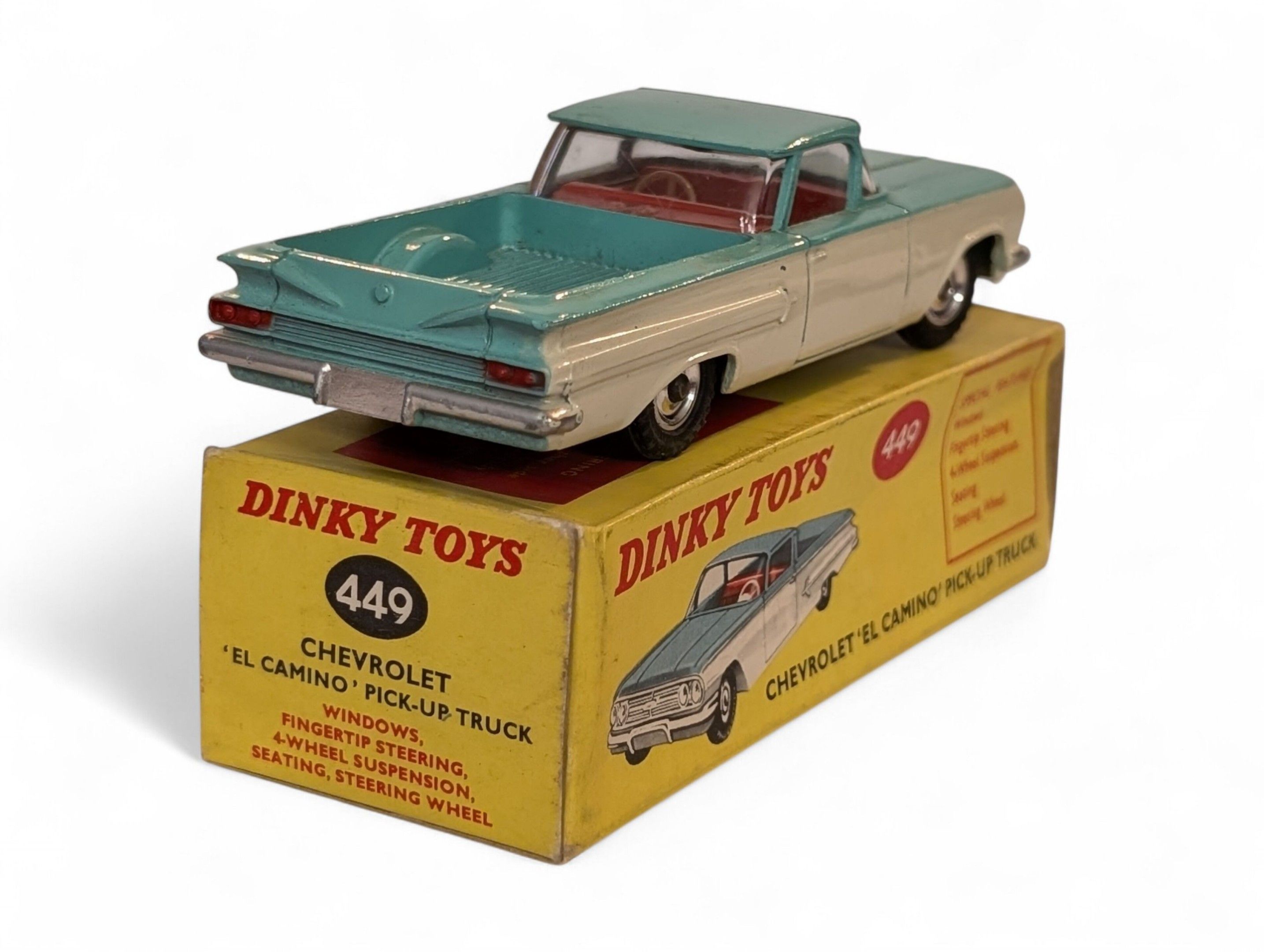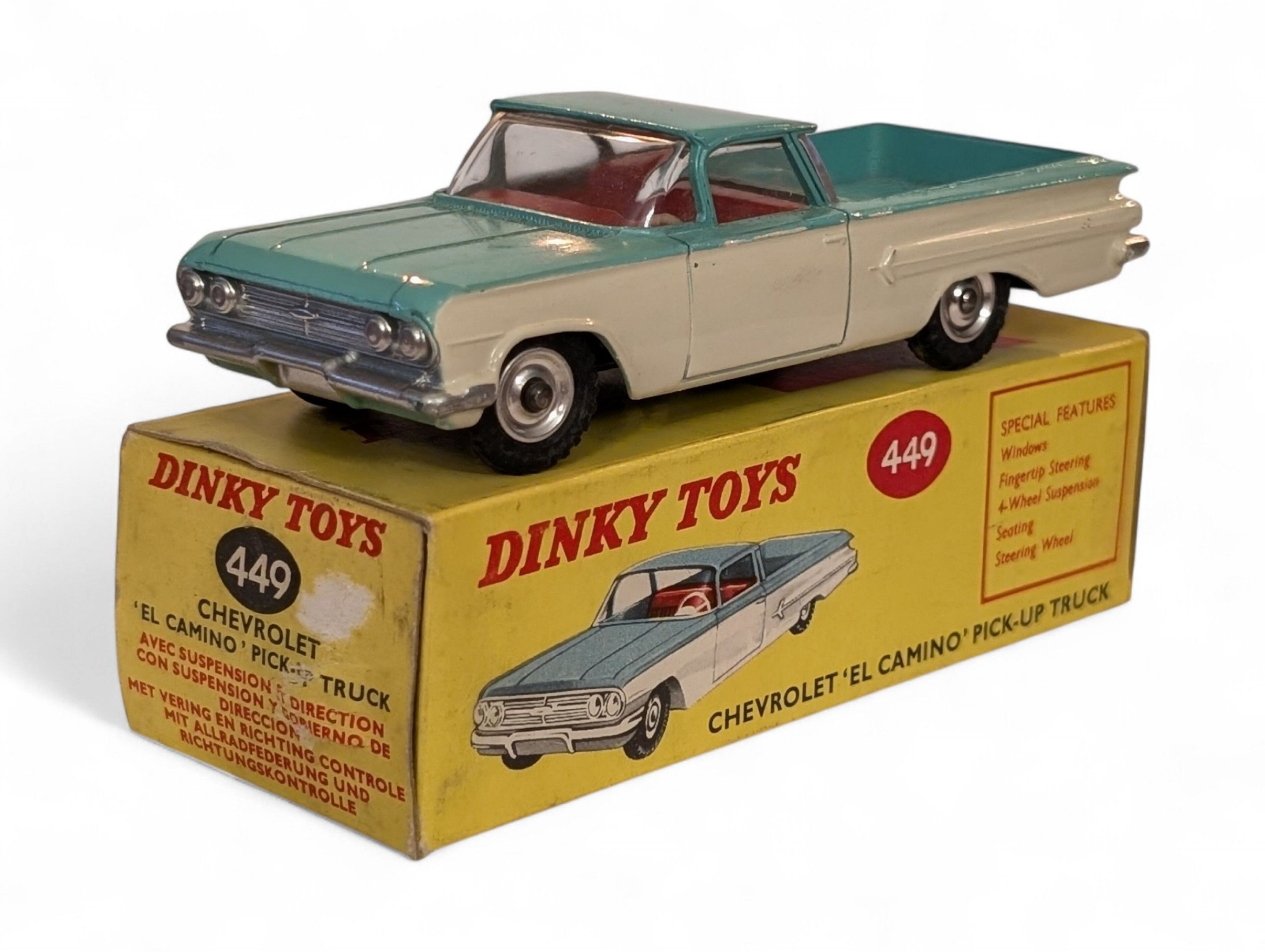 DINKY TOYS United Kingdom Chevrolet "El Camino" Pick-up Truck turquoise with suspension and steering Reference 449 Presented in original box TBE