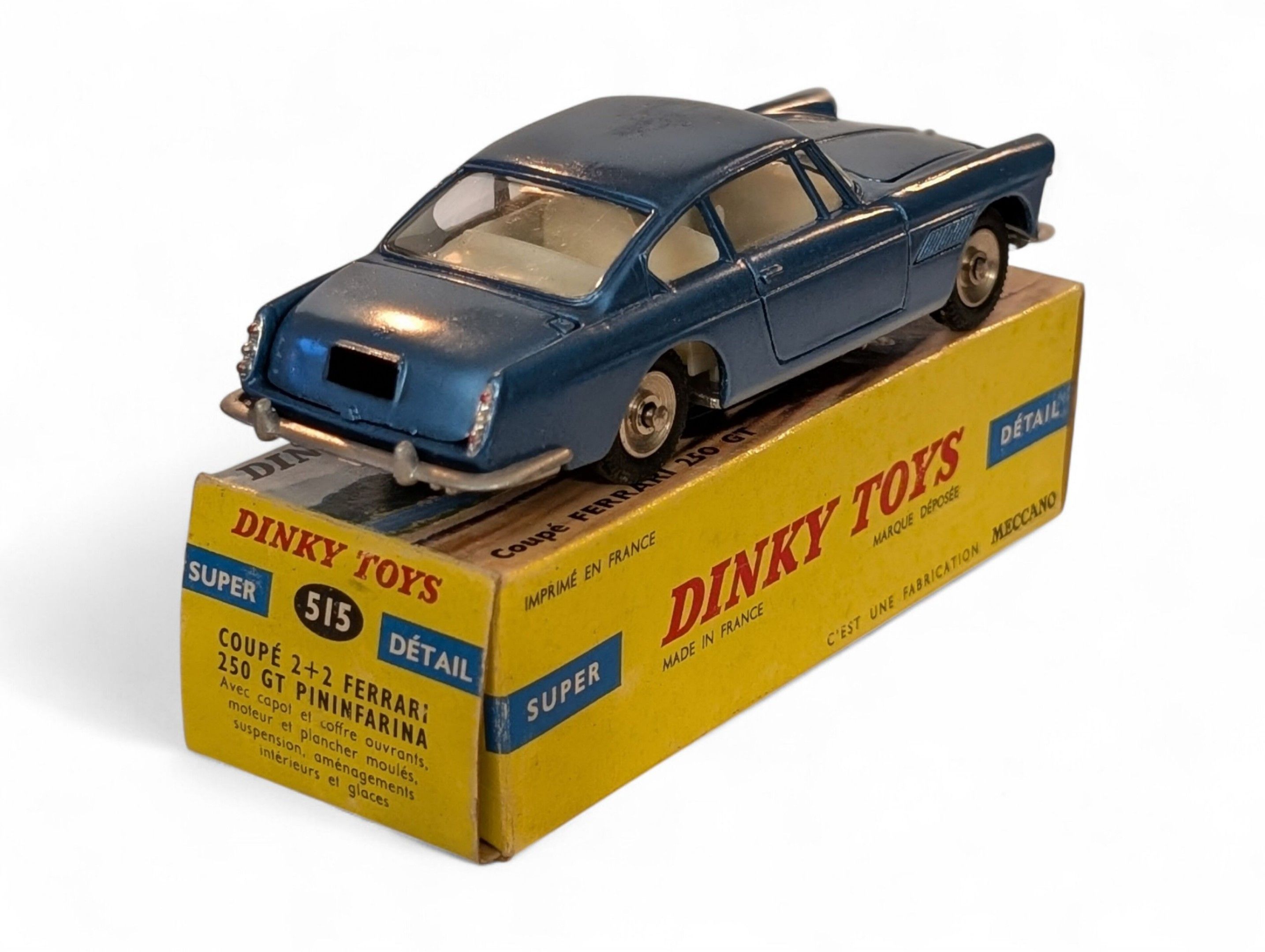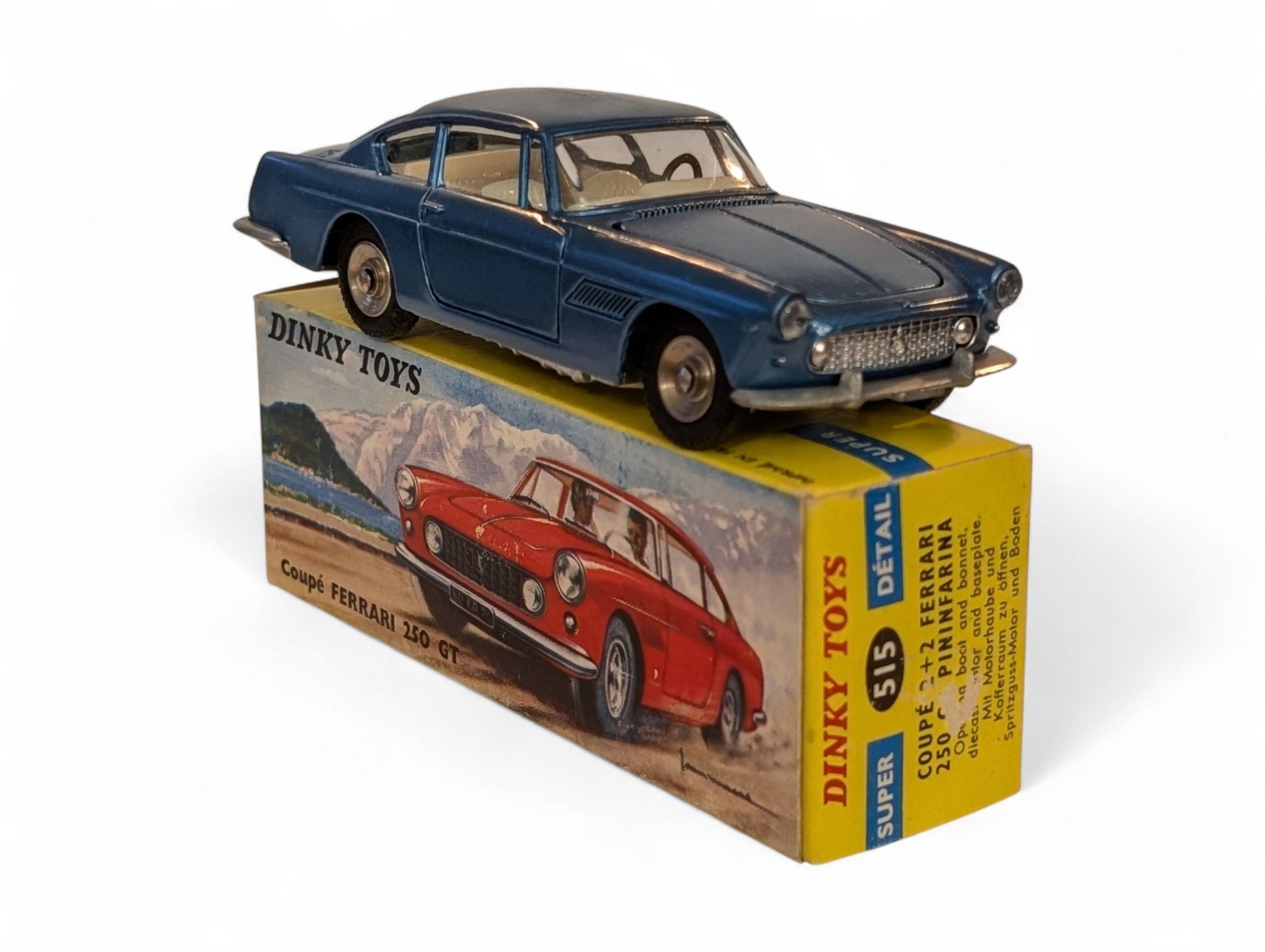 DINKY TOYS France 2+2 Ferrari 250 GT Pininfarina blue coupé with opening bonnet and boot, moulded floor and engine, suspension, interior fittings and windows Reference 515 super detail Presented in original box TBE