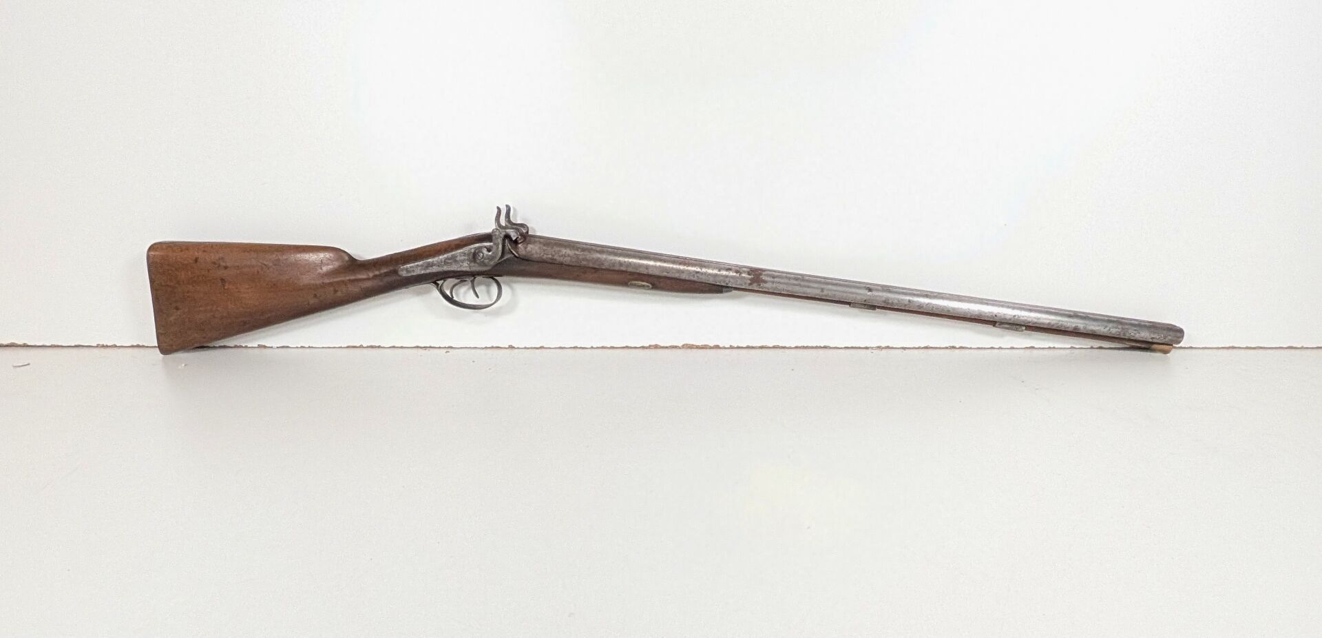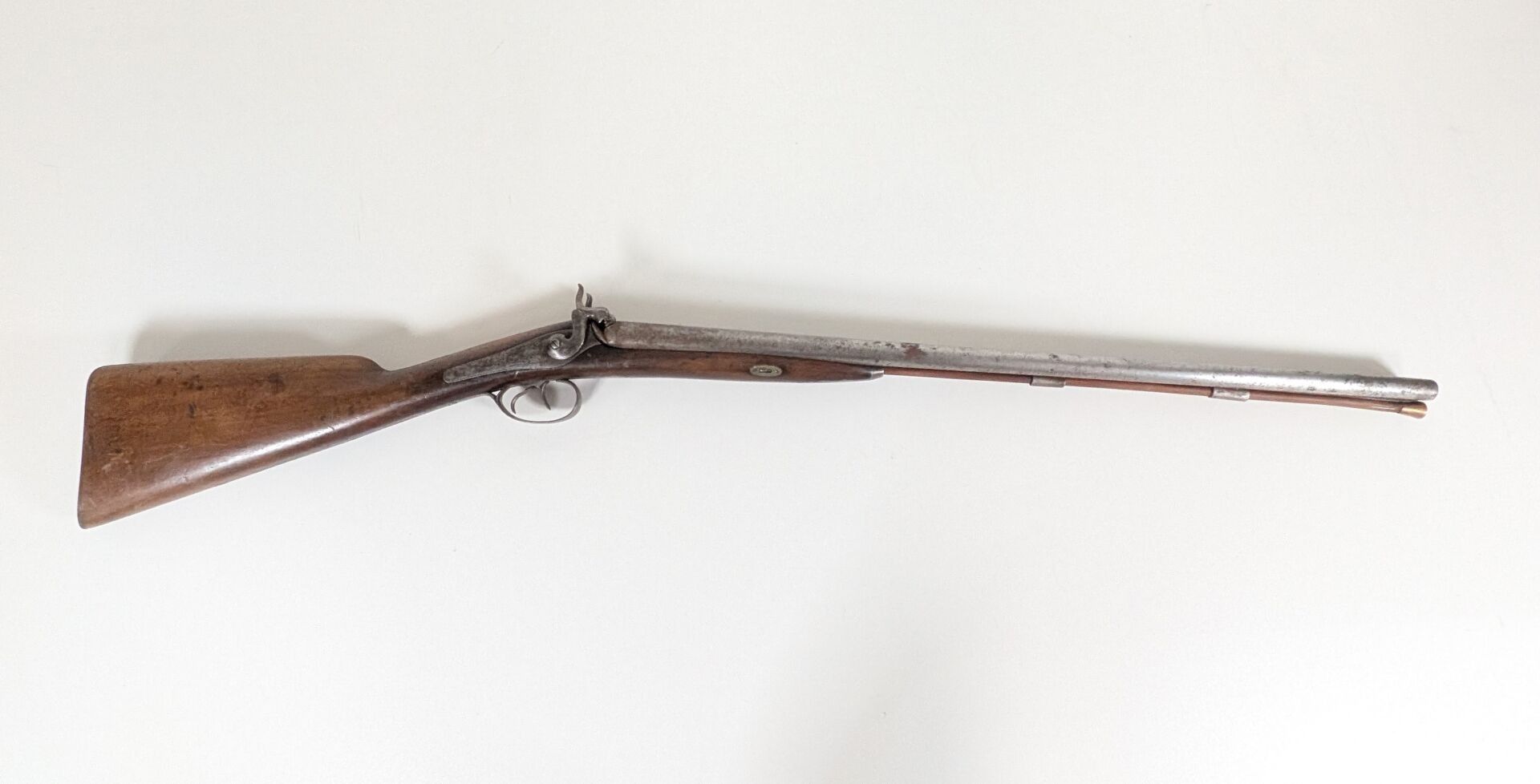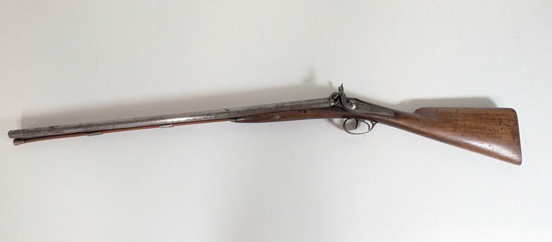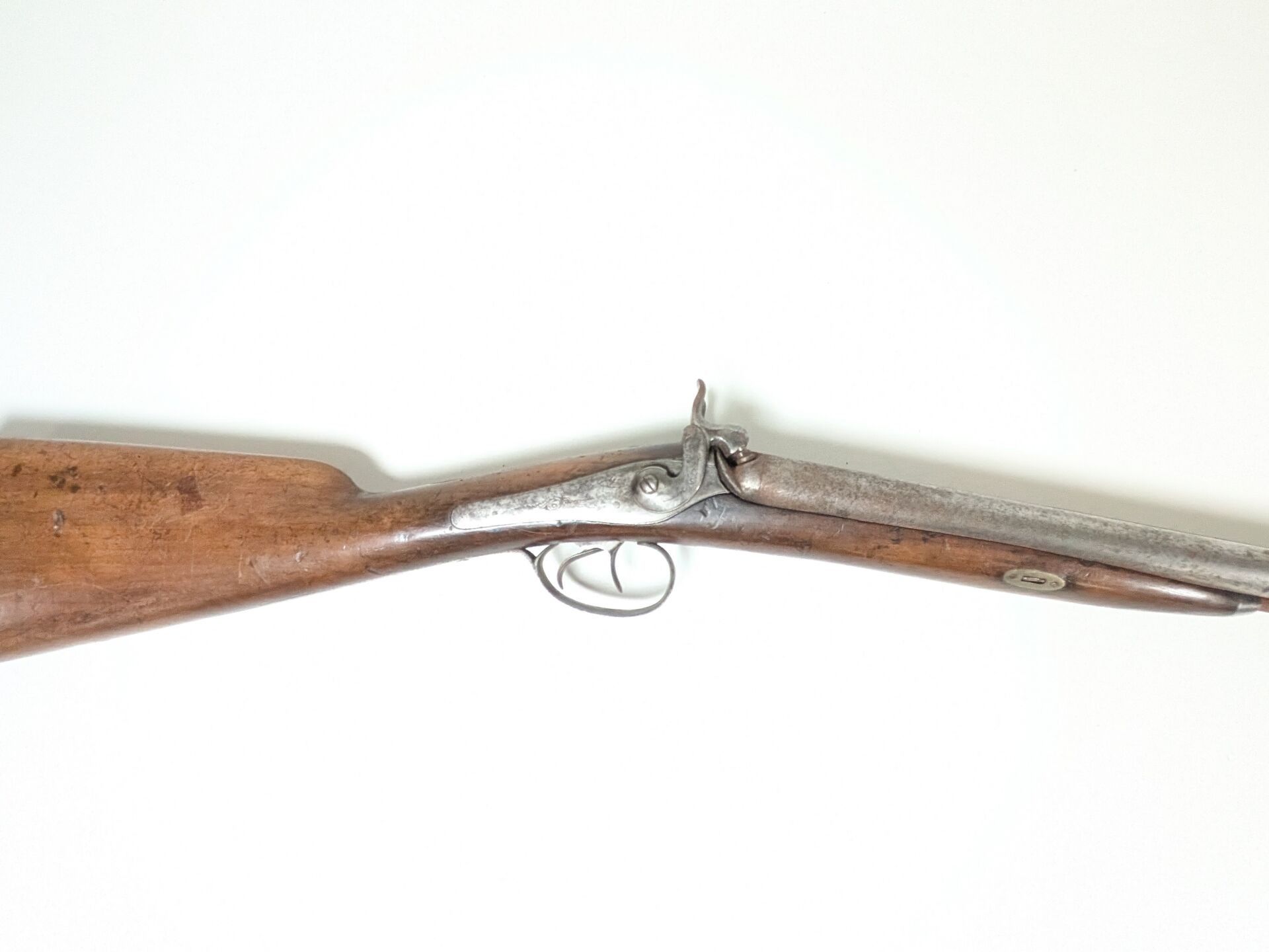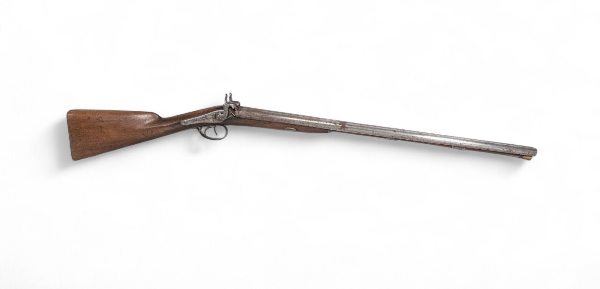 Shotgun with side-by-side barrels and piston, external hammers, L. 109 cm