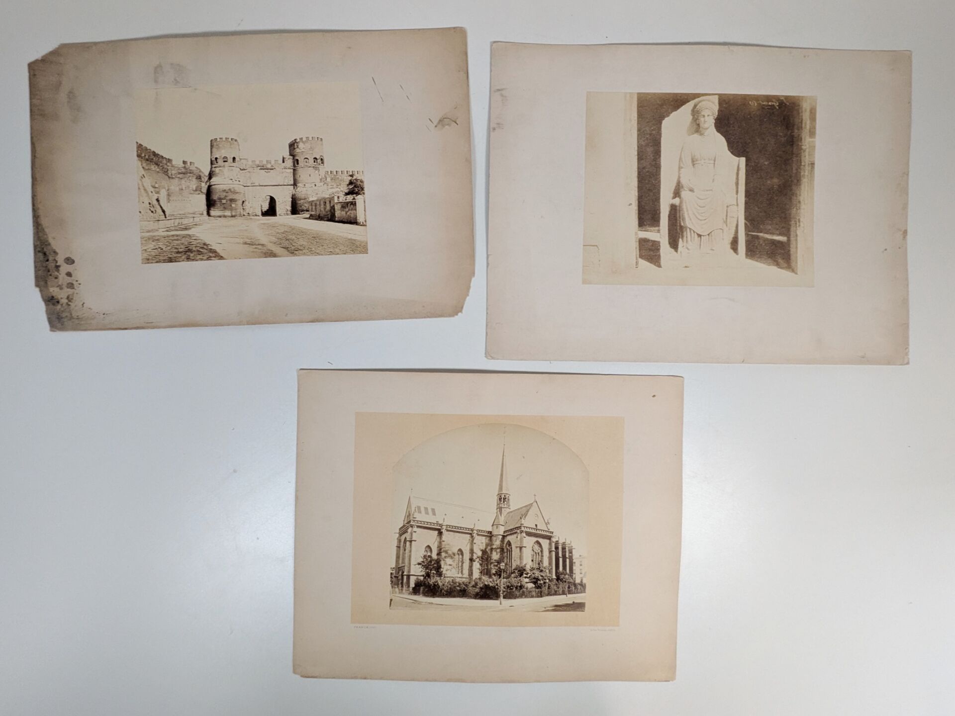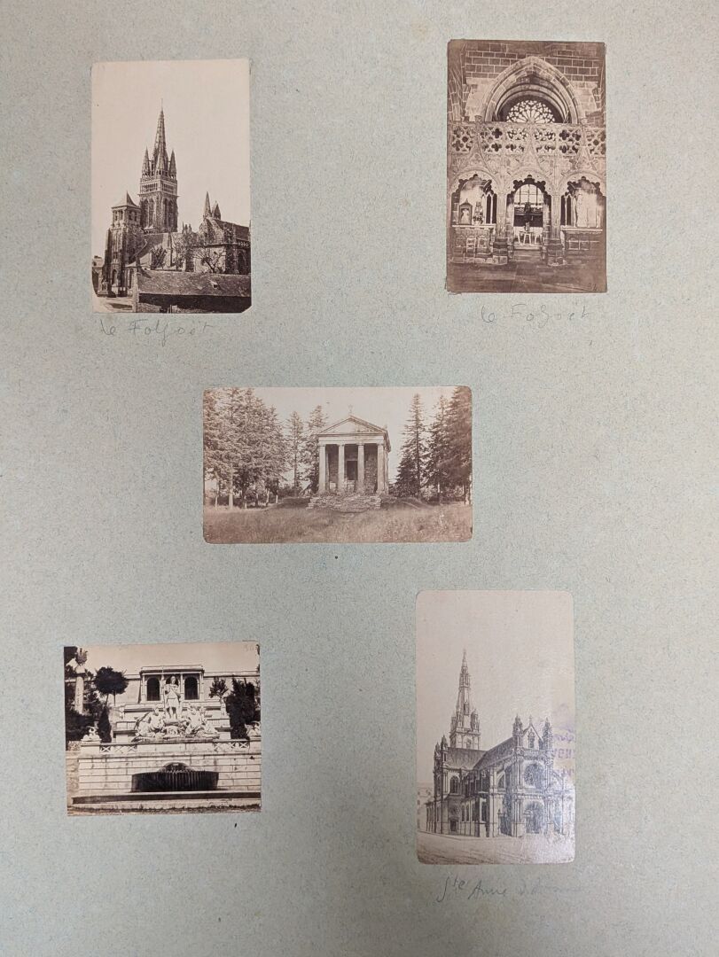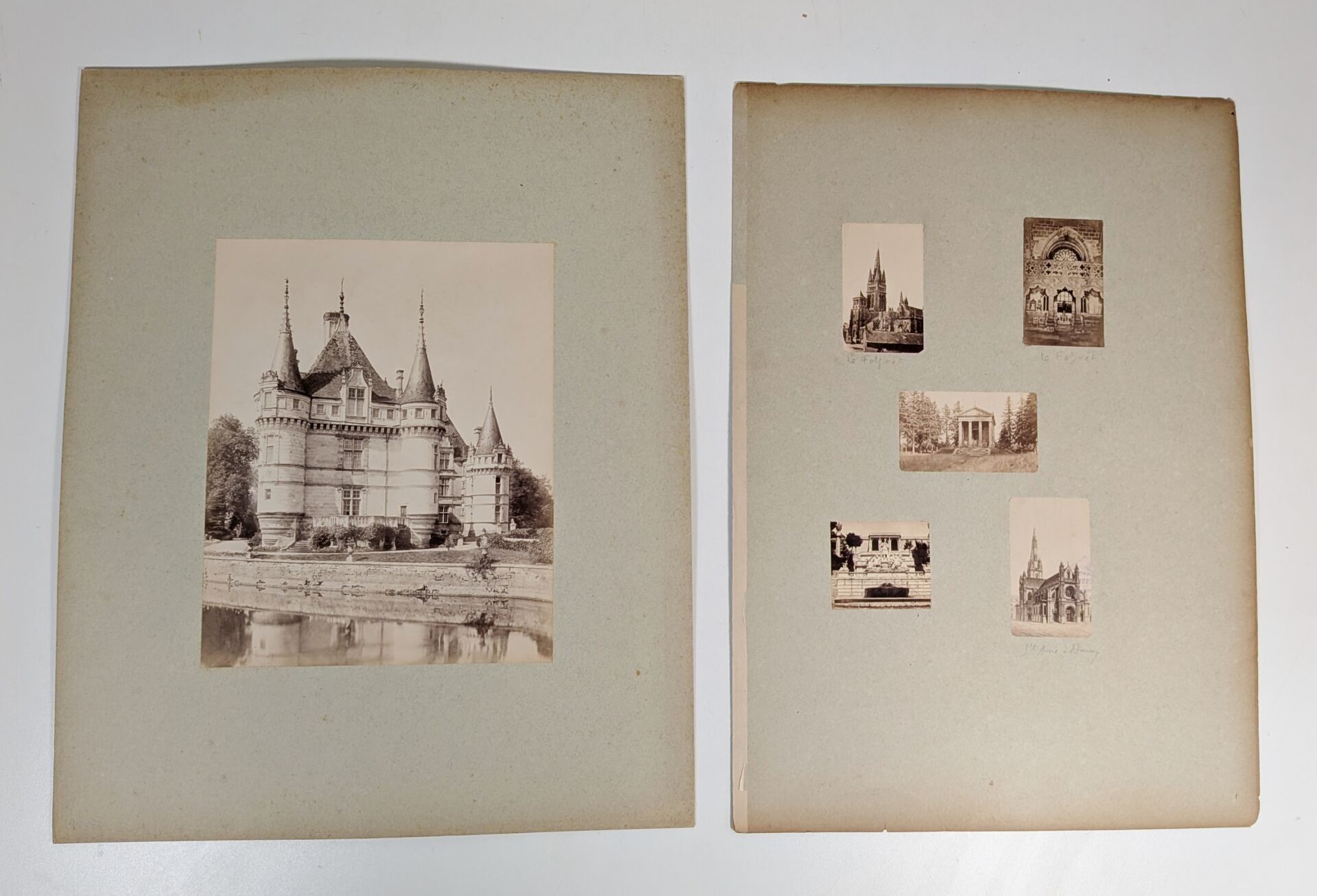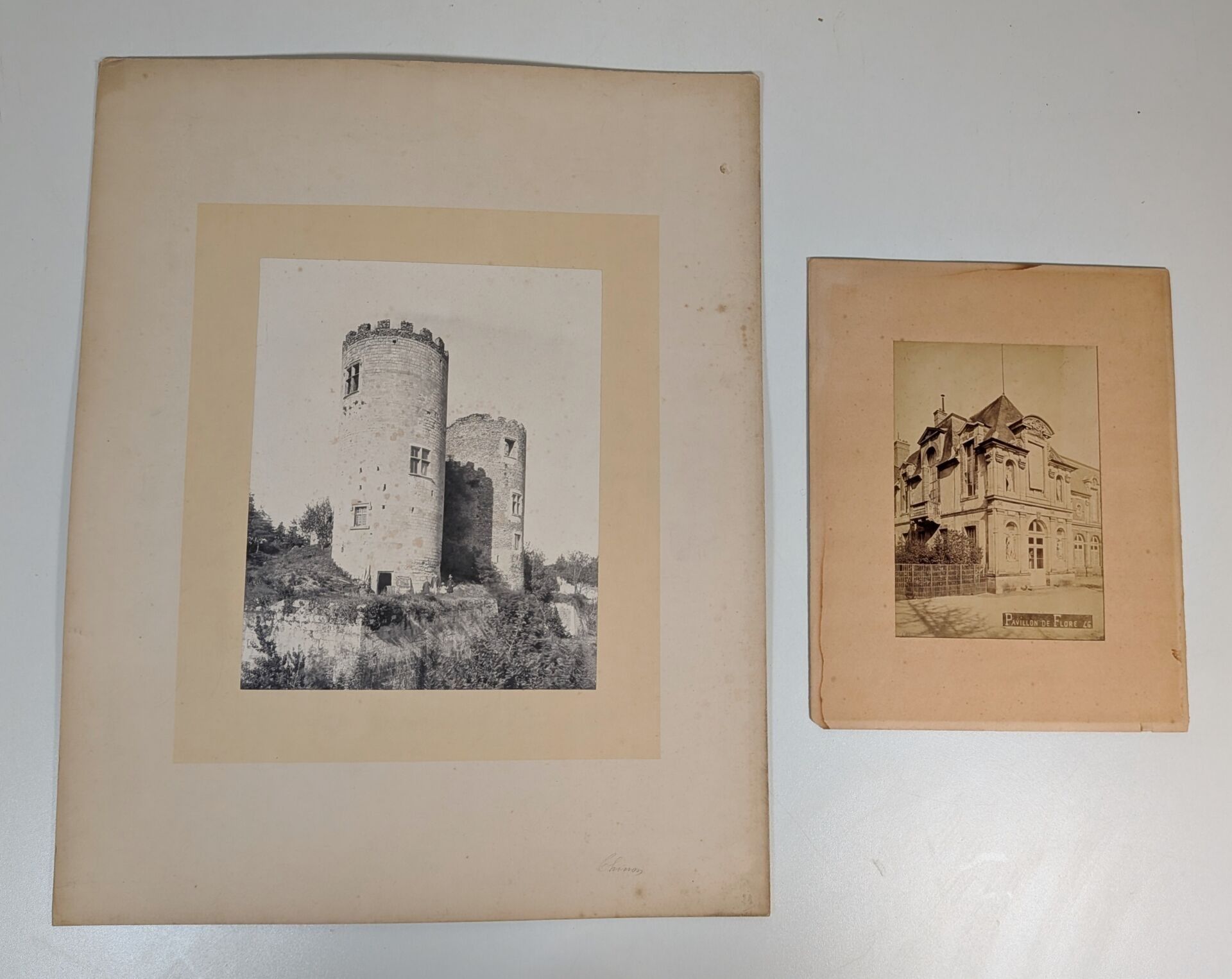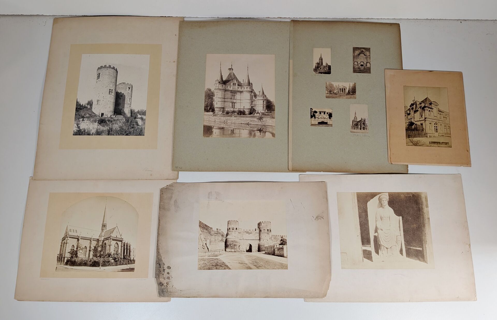 Lot of Monuments & Architecture photographs, some mounted on card, including Bretagne, Pavillon de Flore, Chinon. Some signed. Some wetness, D. 9 x 6 cm to 54 x 43 cm