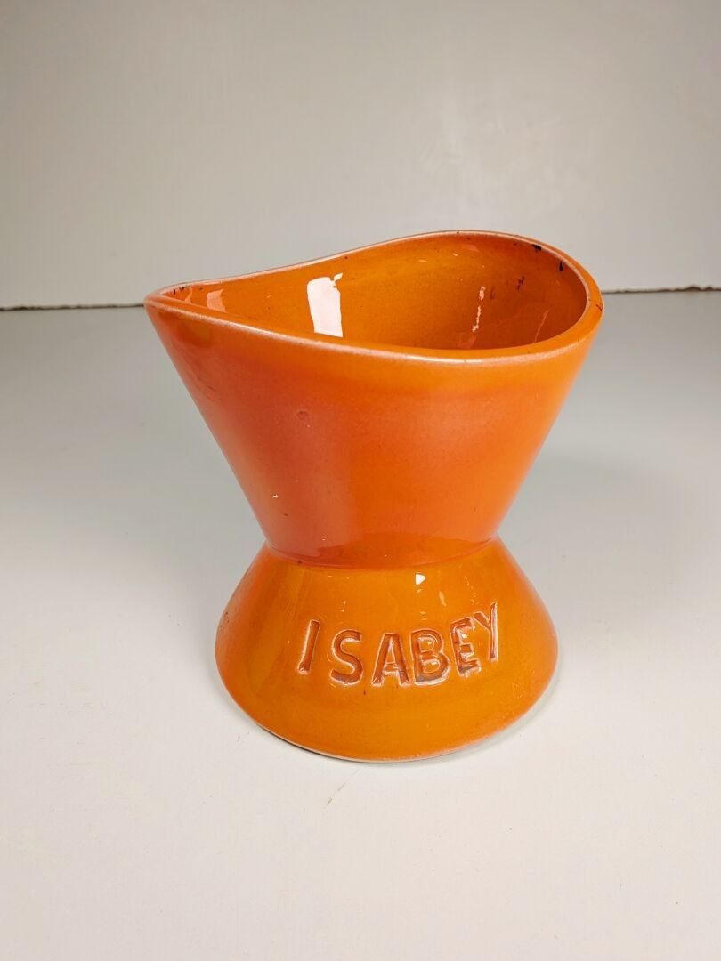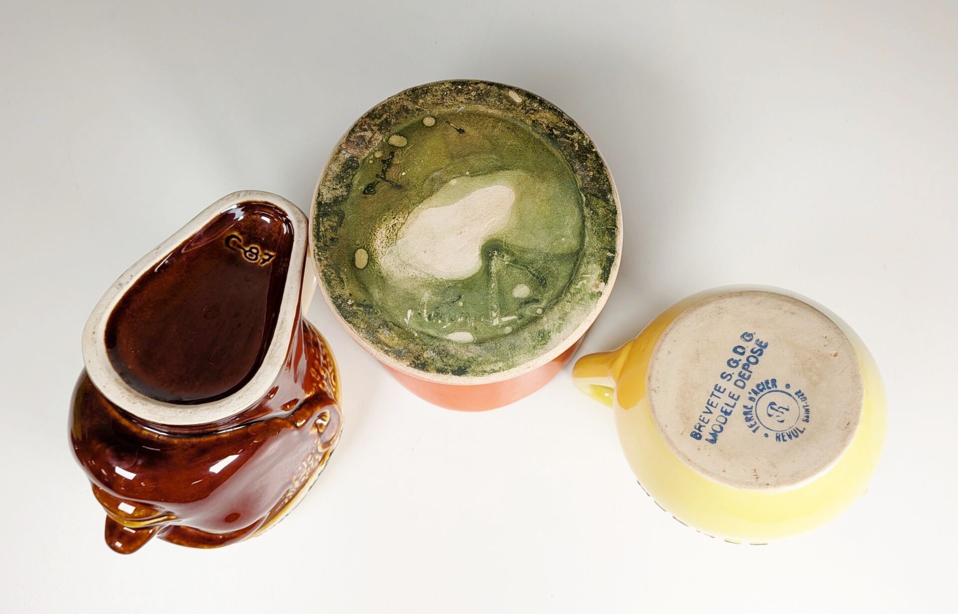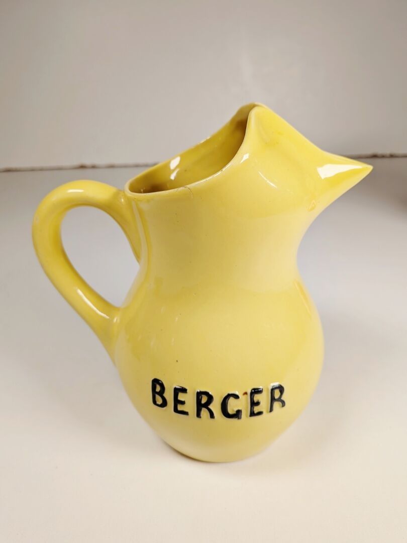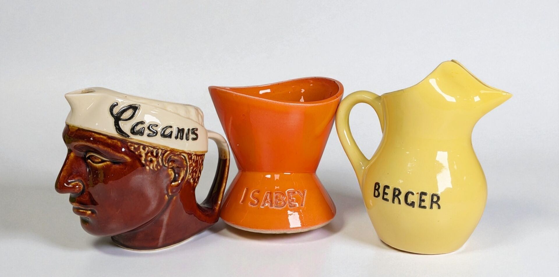 ADVERTISING. 3 pieces: Brown and brown Maure CASANIS pitcher (marked C87 on reverse, H. 15 cm), yellow earthenware BERGER pitcher (H. 19 cm, chipped), and orange ceramic ISABEY pot (H. 16 cm).