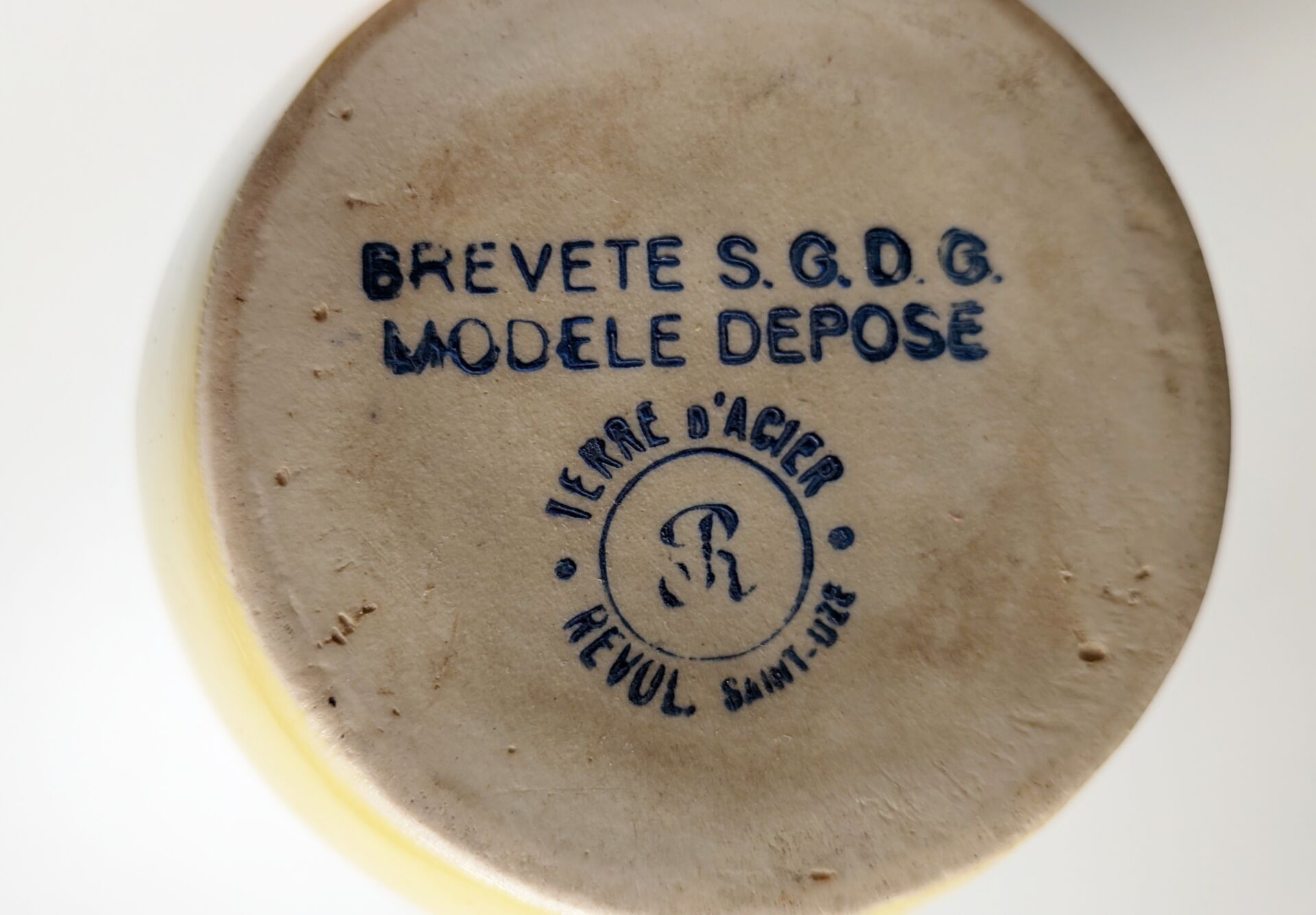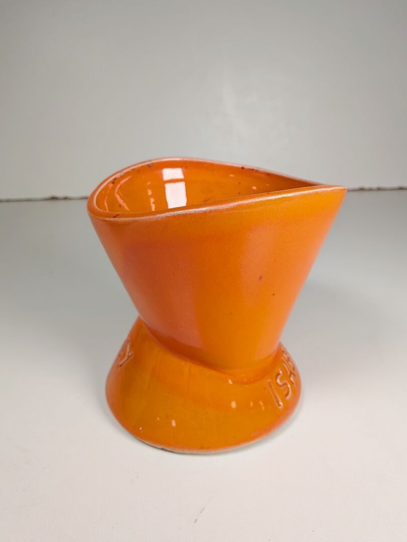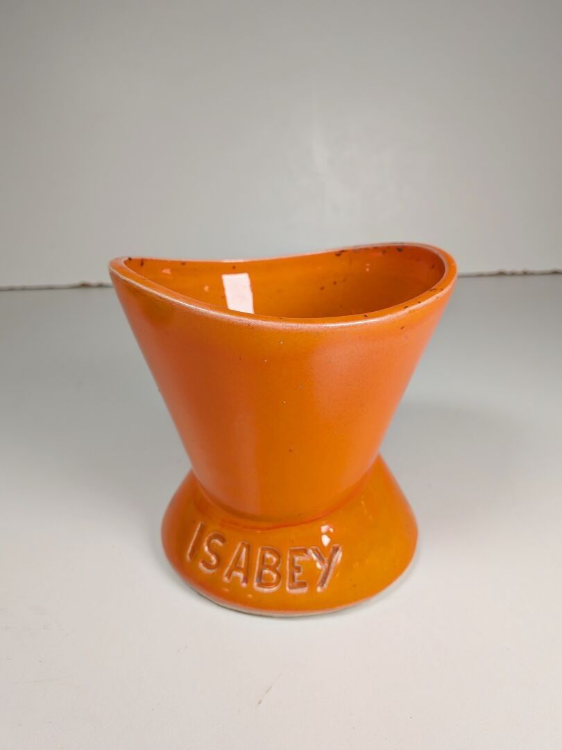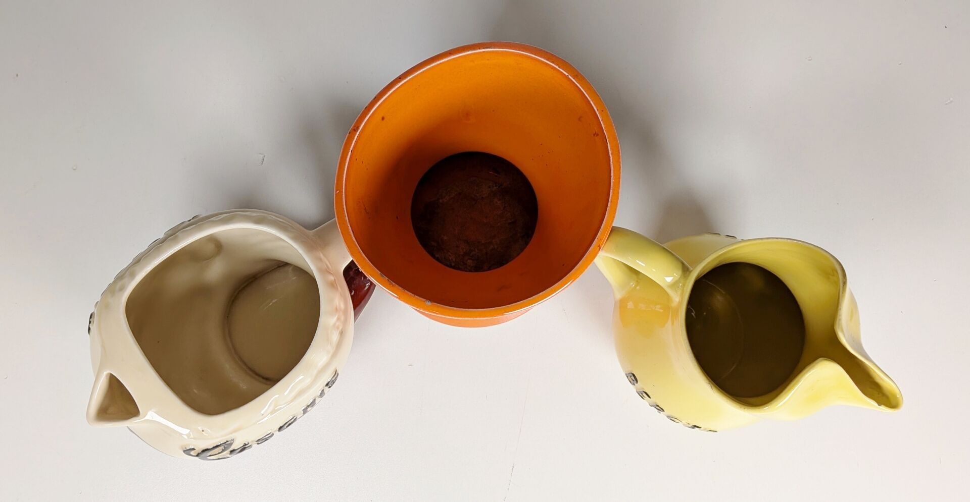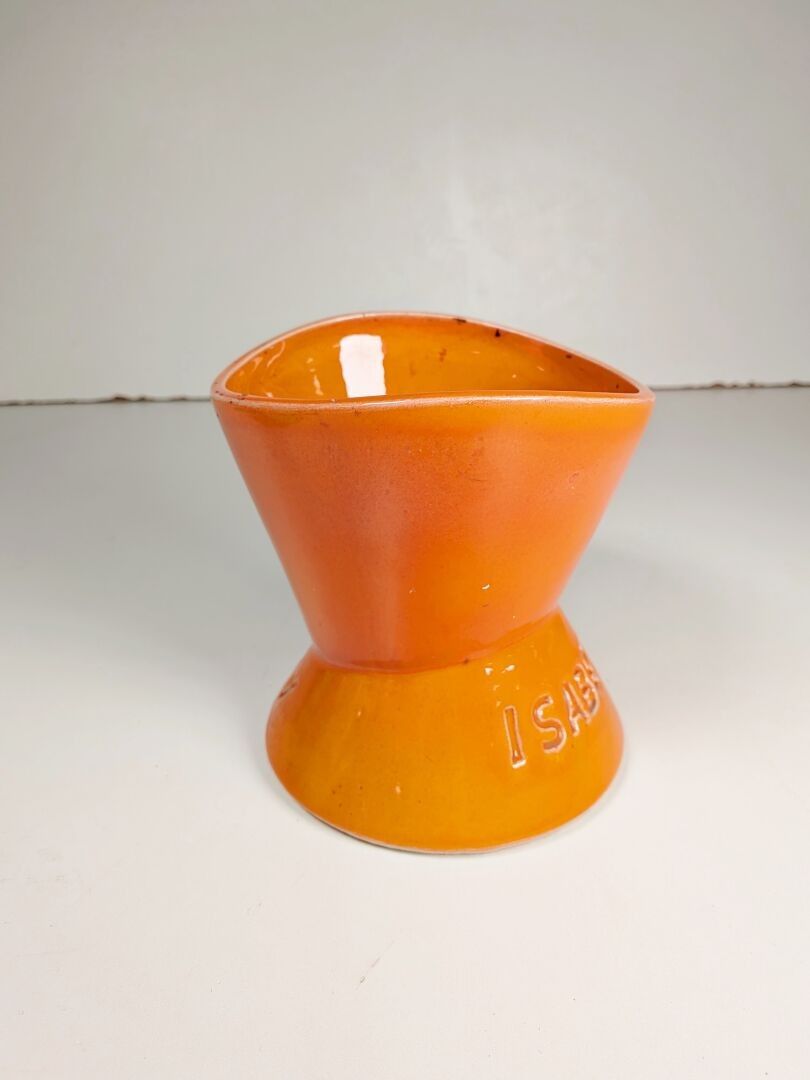 ADVERTISING. 3 pieces: Brown and brown Maure CASANIS pitcher (marked C87 on reverse, H. 15 cm), yellow earthenware BERGER pitcher (H. 19 cm, chipped), and orange ceramic ISABEY pot (H. 16 cm).