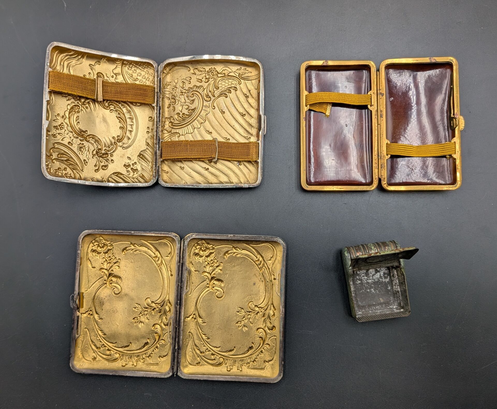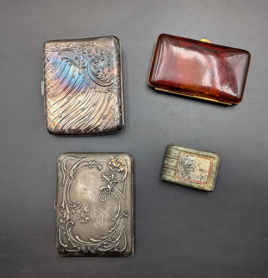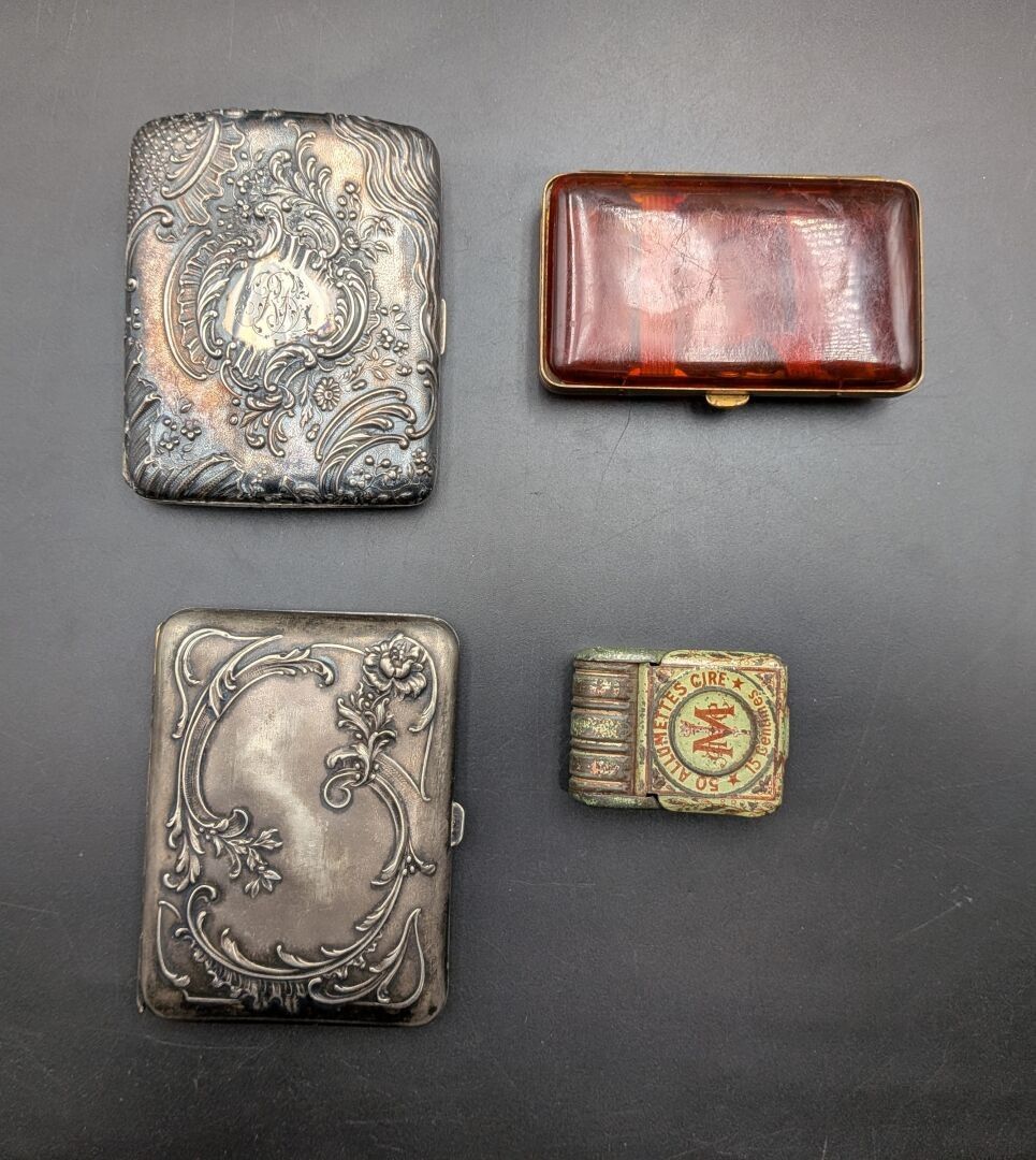 Lot: 3 cigarette cases, match holder, porcelain pyrogen "lit…