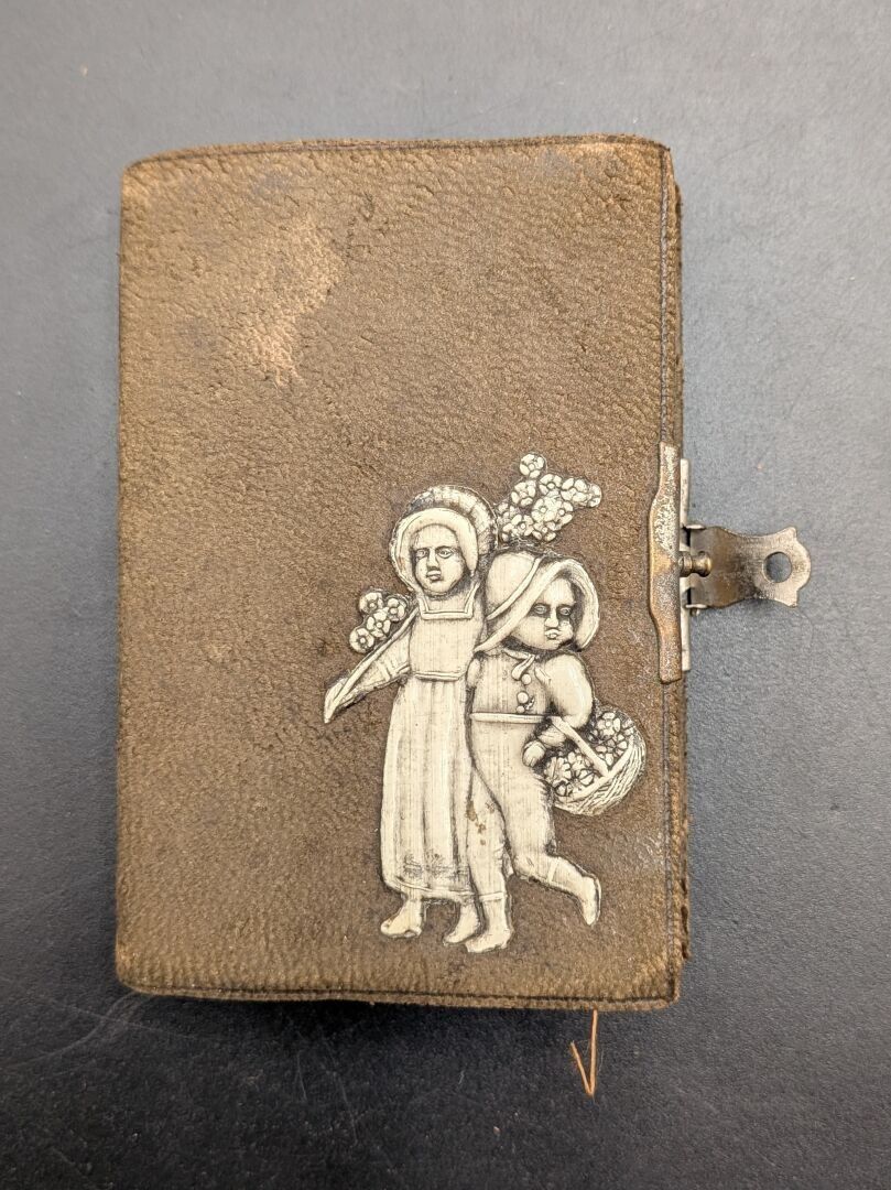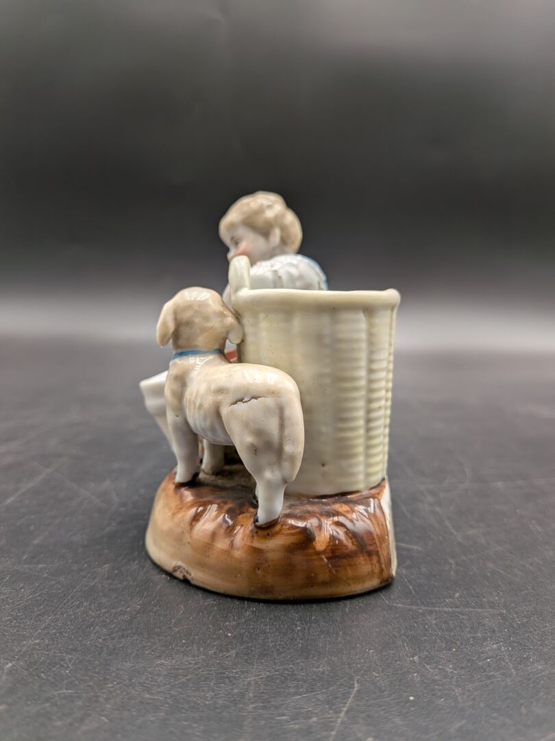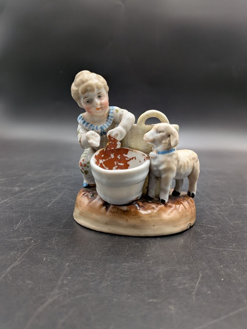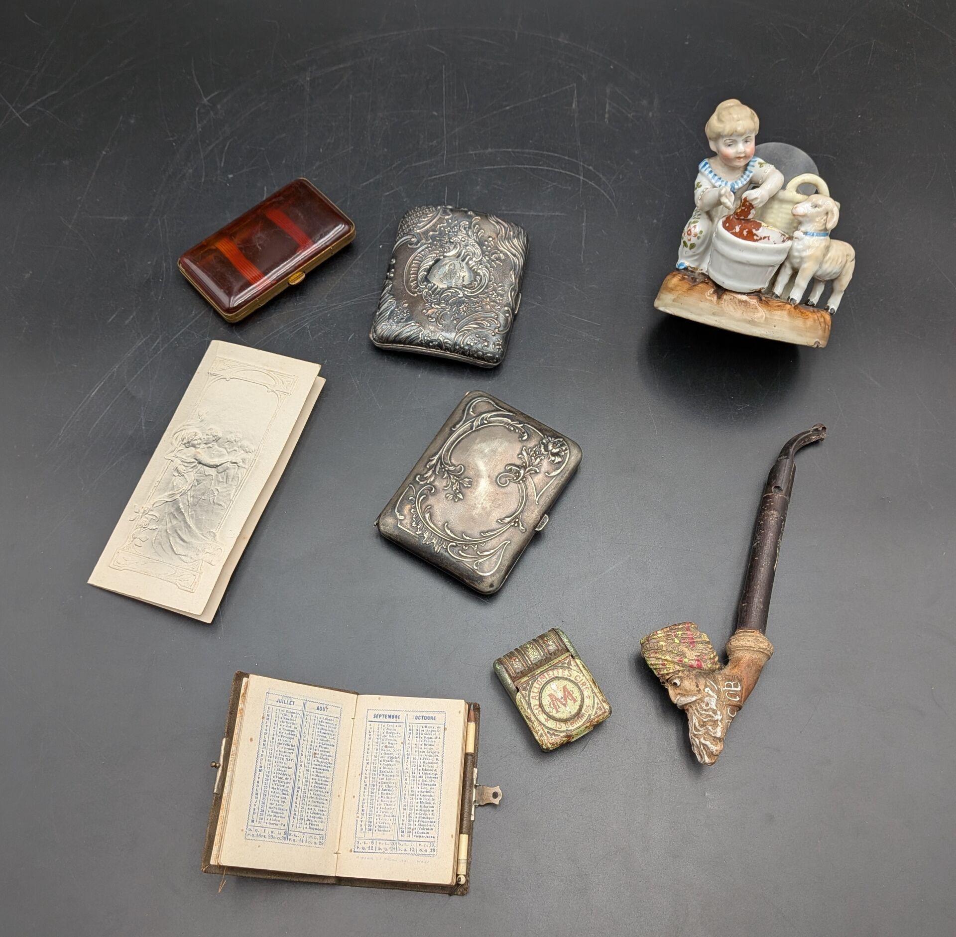 Lot: 3 cigarette cases, match holder, porcelain pyrogen "little girl with a lamb" (10 x 8 x 7 cm), tin box "50 wax matches", a ball book, a Jacob pipe (small accident) and a souvenir diary 1888.