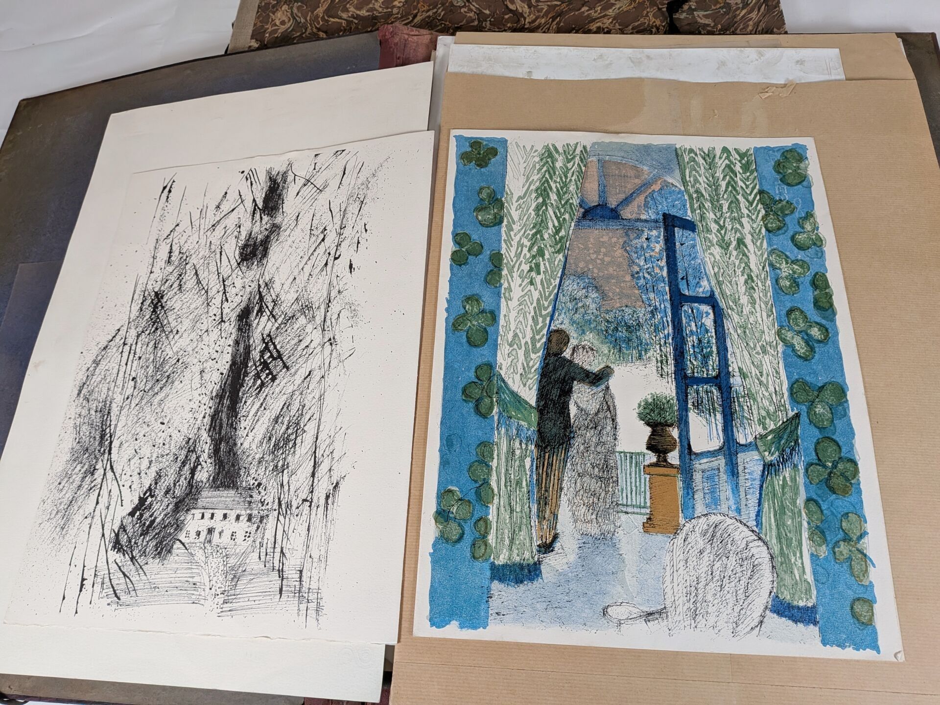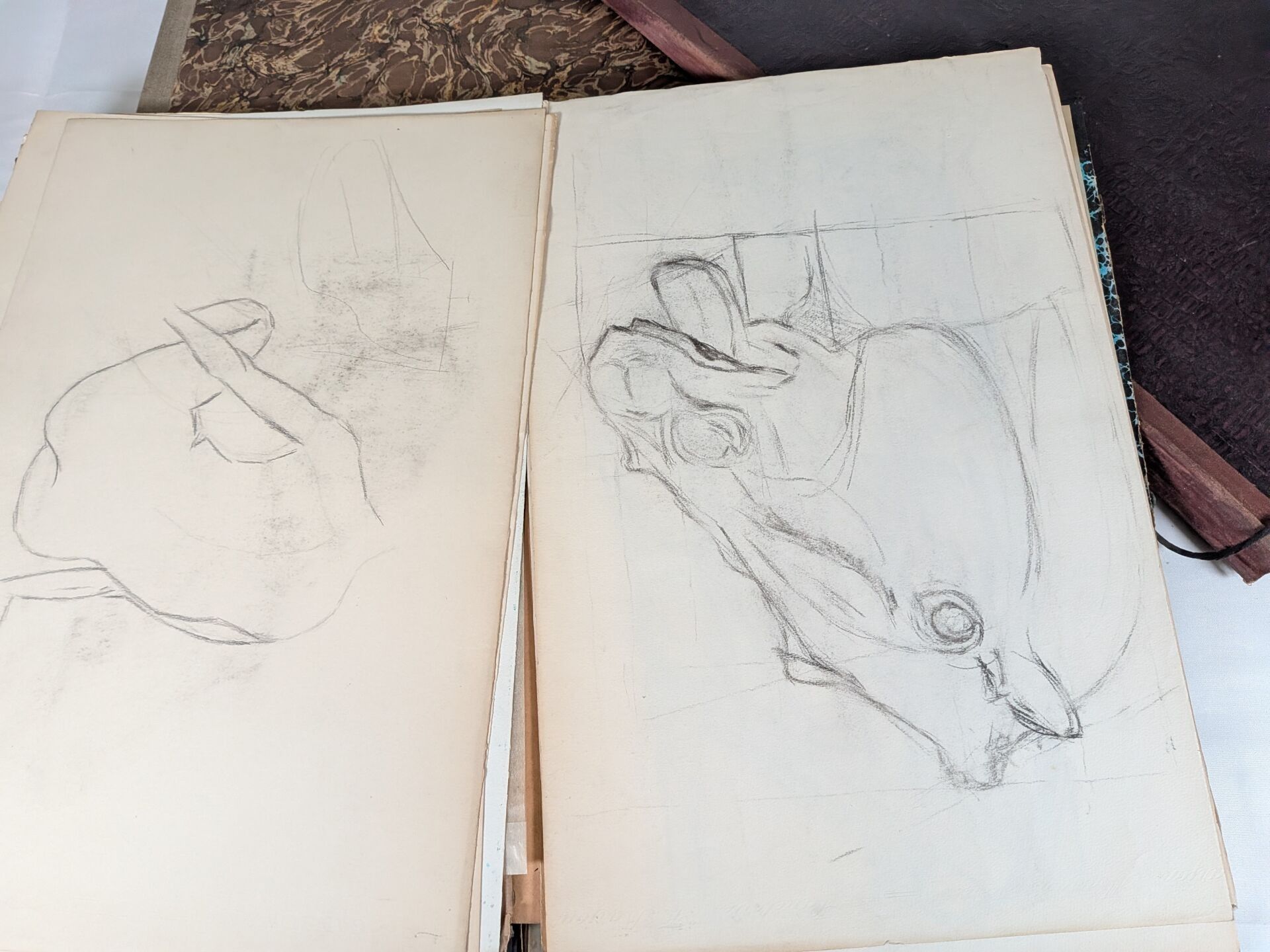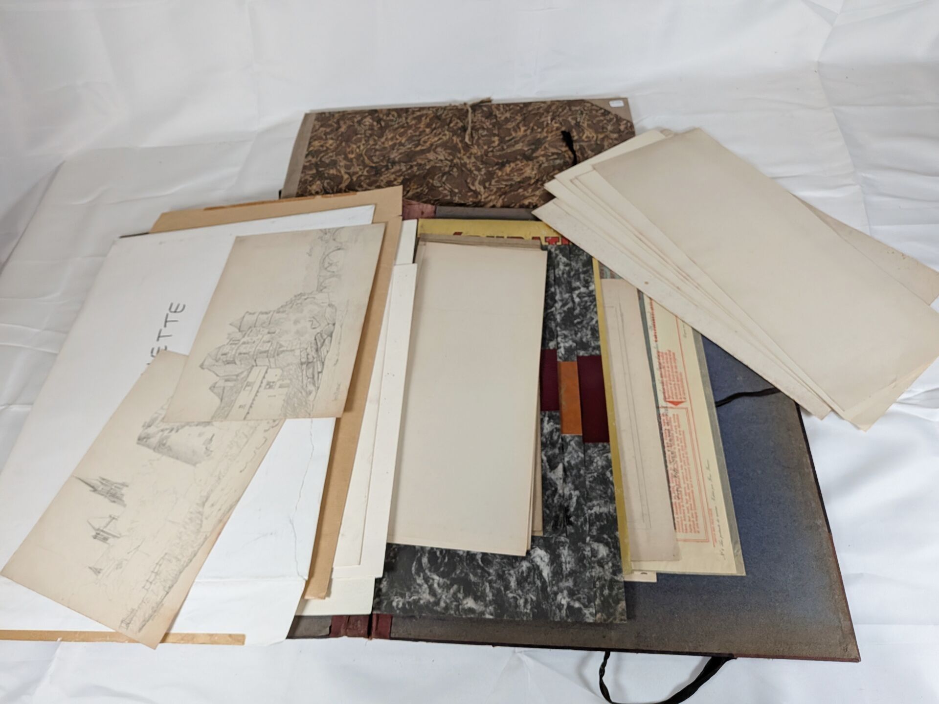 Set of 3 drawing boxes, containing a collection of charcoal drawings, engravings and miscellaneous items.