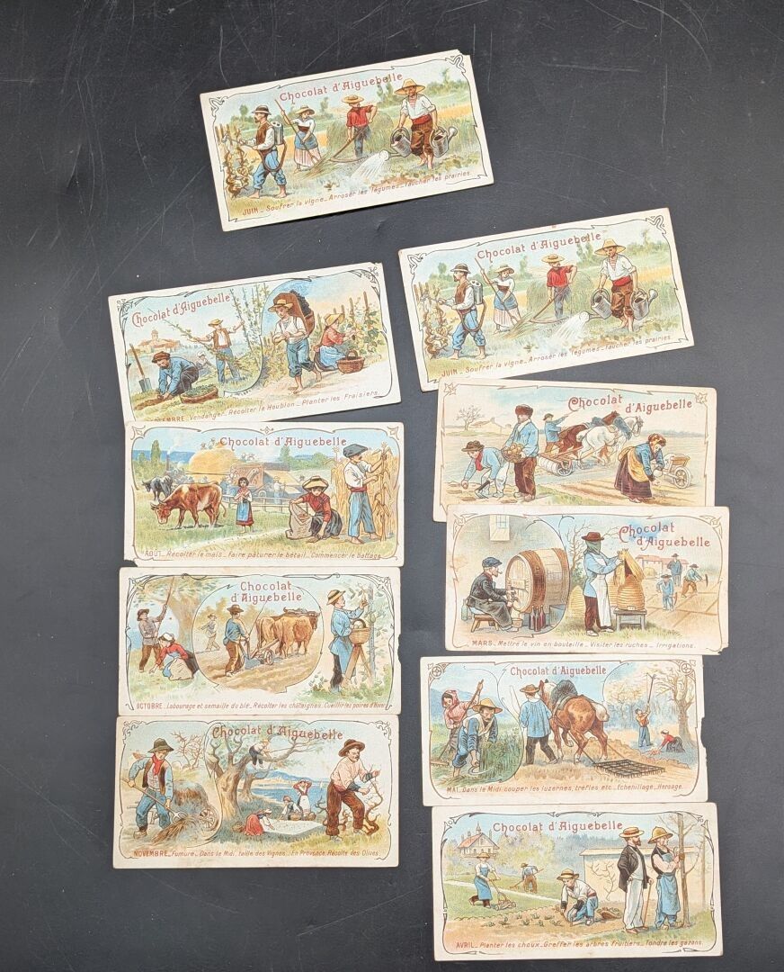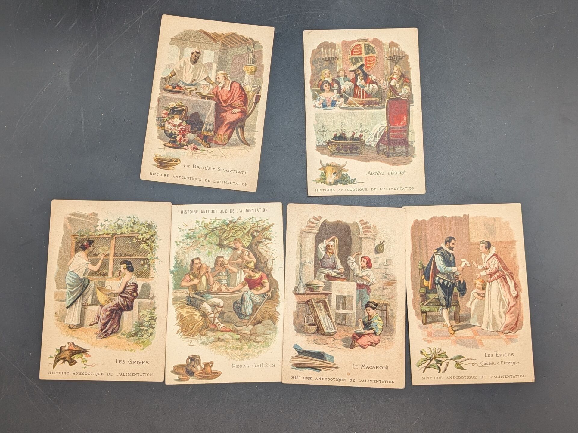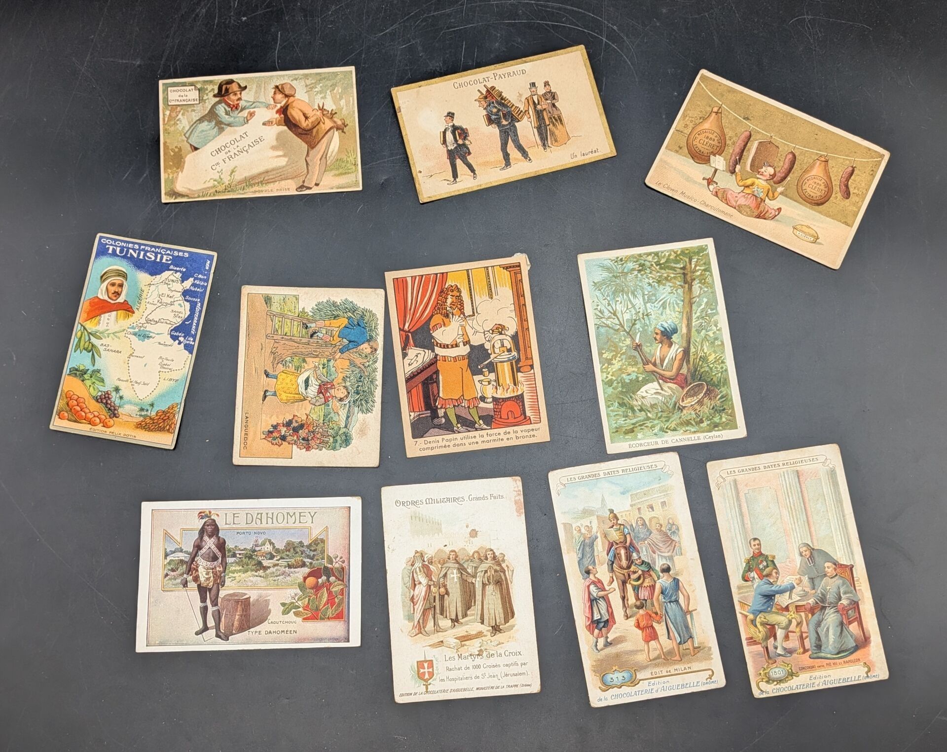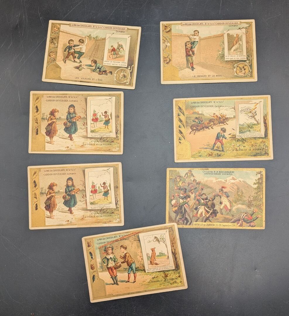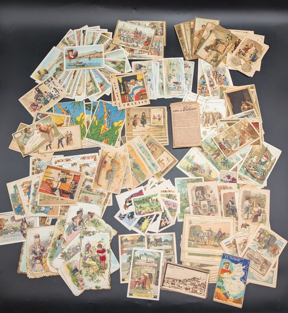 Large lot of CHROMOS: Cie Française chocolate, MENIER chocolate, FALLIERES phosphatine, LA BOULANGERE chicory, SUCHARD chocolate, FELIX POTIN, F CLERET PARIS charcuterie, PHOSCAO, PEYRAUD cocoa, A CARDON DUVERGER chocolate, POULAIN cocoa, AIGUEBELLE cocoa, PERES CELESTINS herbal tea, VALS grains, Frileuse wine games.