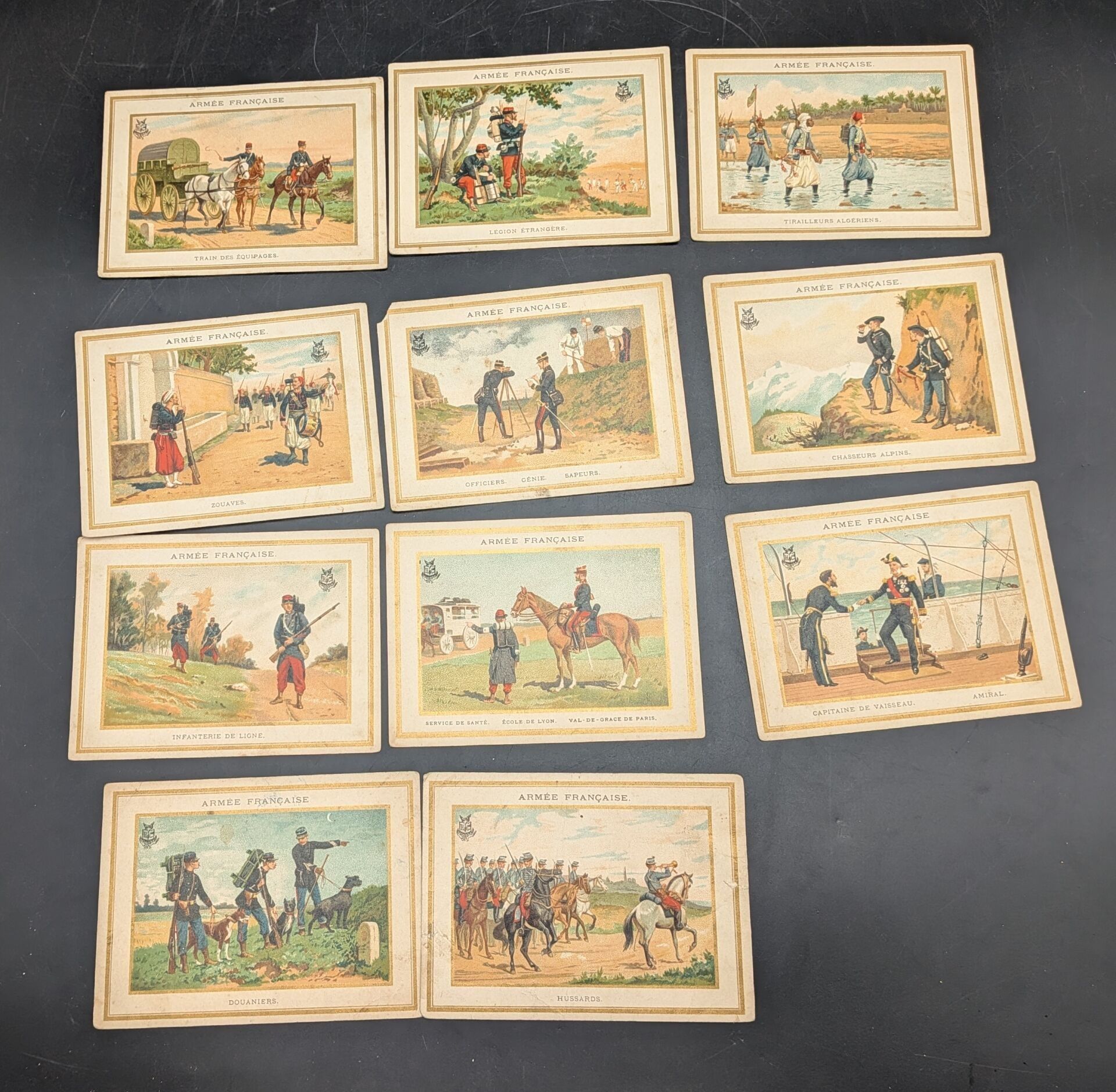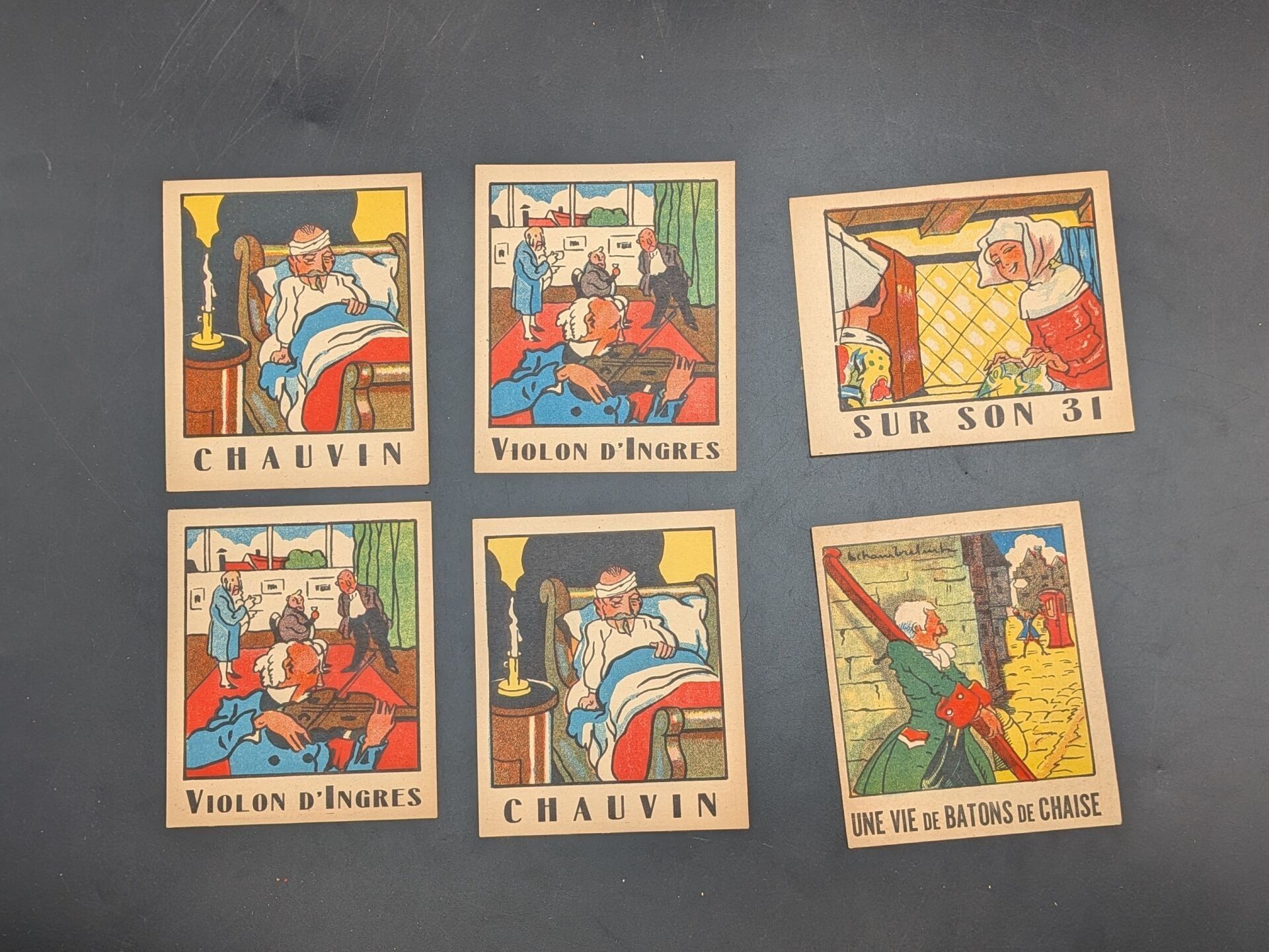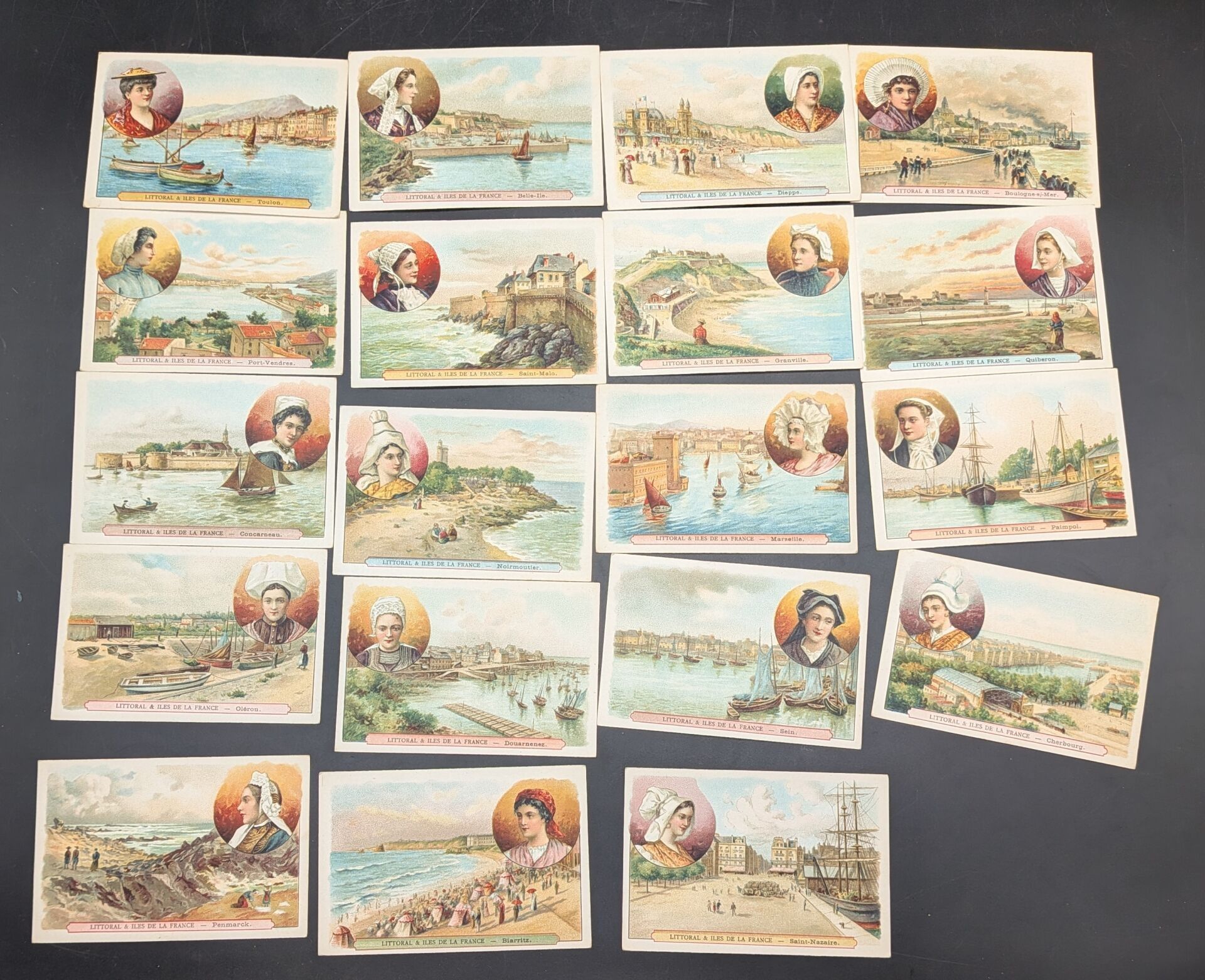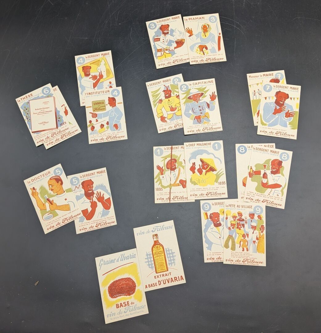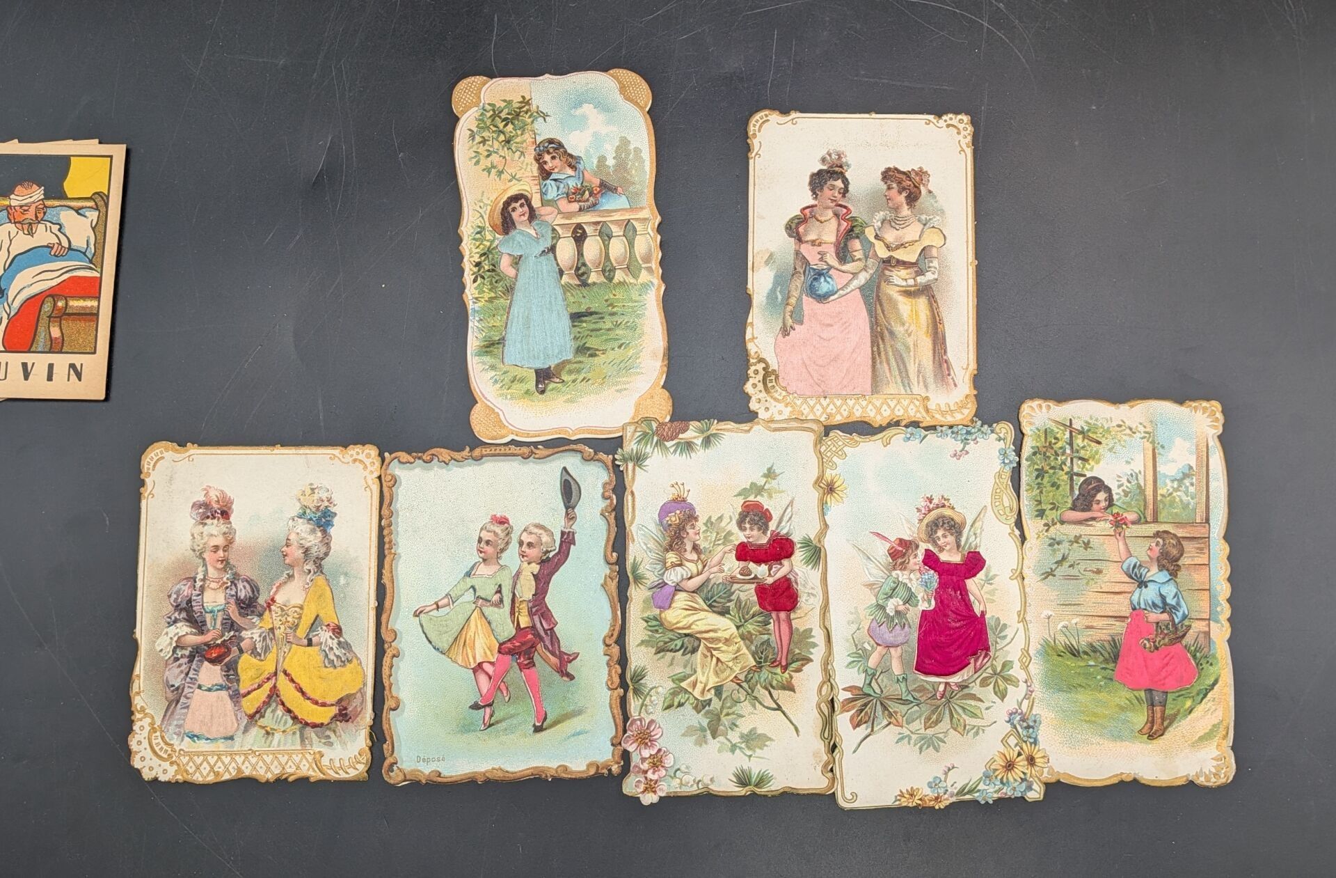 Large lot of CHROMOS: Cie Française chocolate, MENIER chocolate, FALLIERES phosphatine, LA BOULANGERE chicory, SUCHARD chocolate, FELIX POTIN, F CLERET PARIS charcuterie, PHOSCAO, PEYRAUD cocoa, A CARDON DUVERGER chocolate, POULAIN cocoa, AIGUEBELLE cocoa, PERES CELESTINS herbal tea, VALS grains, Frileuse wine games.