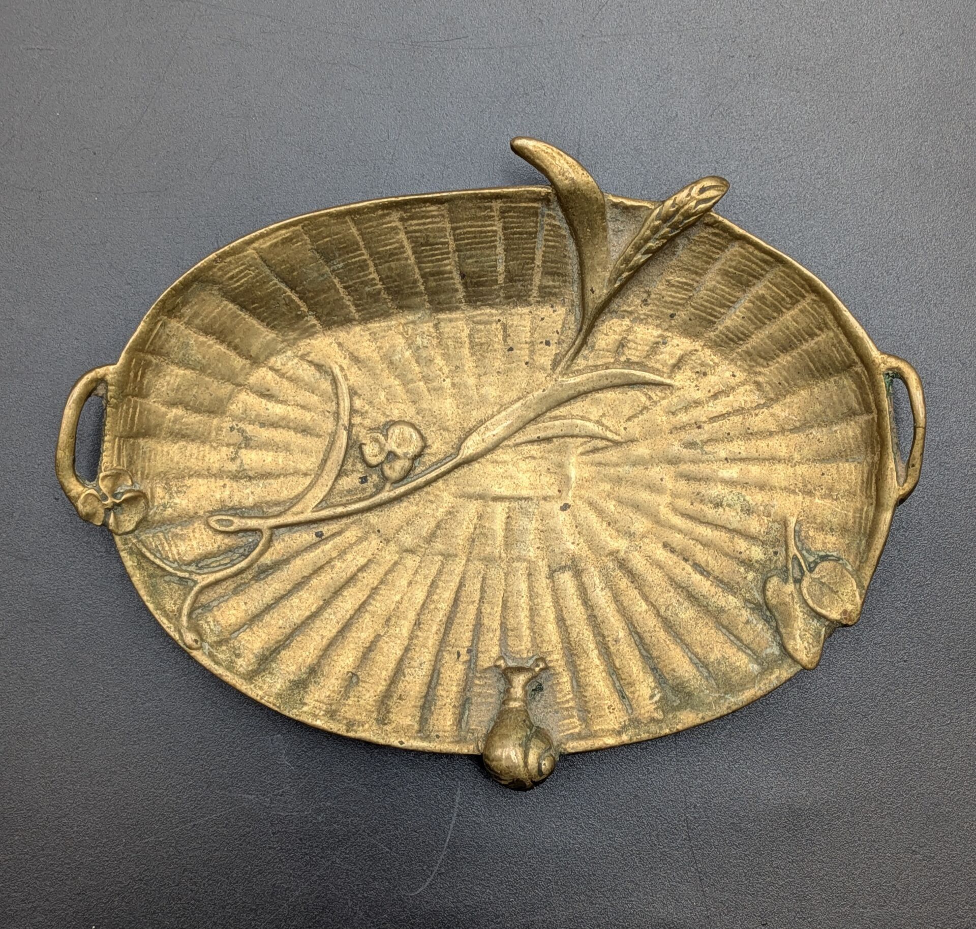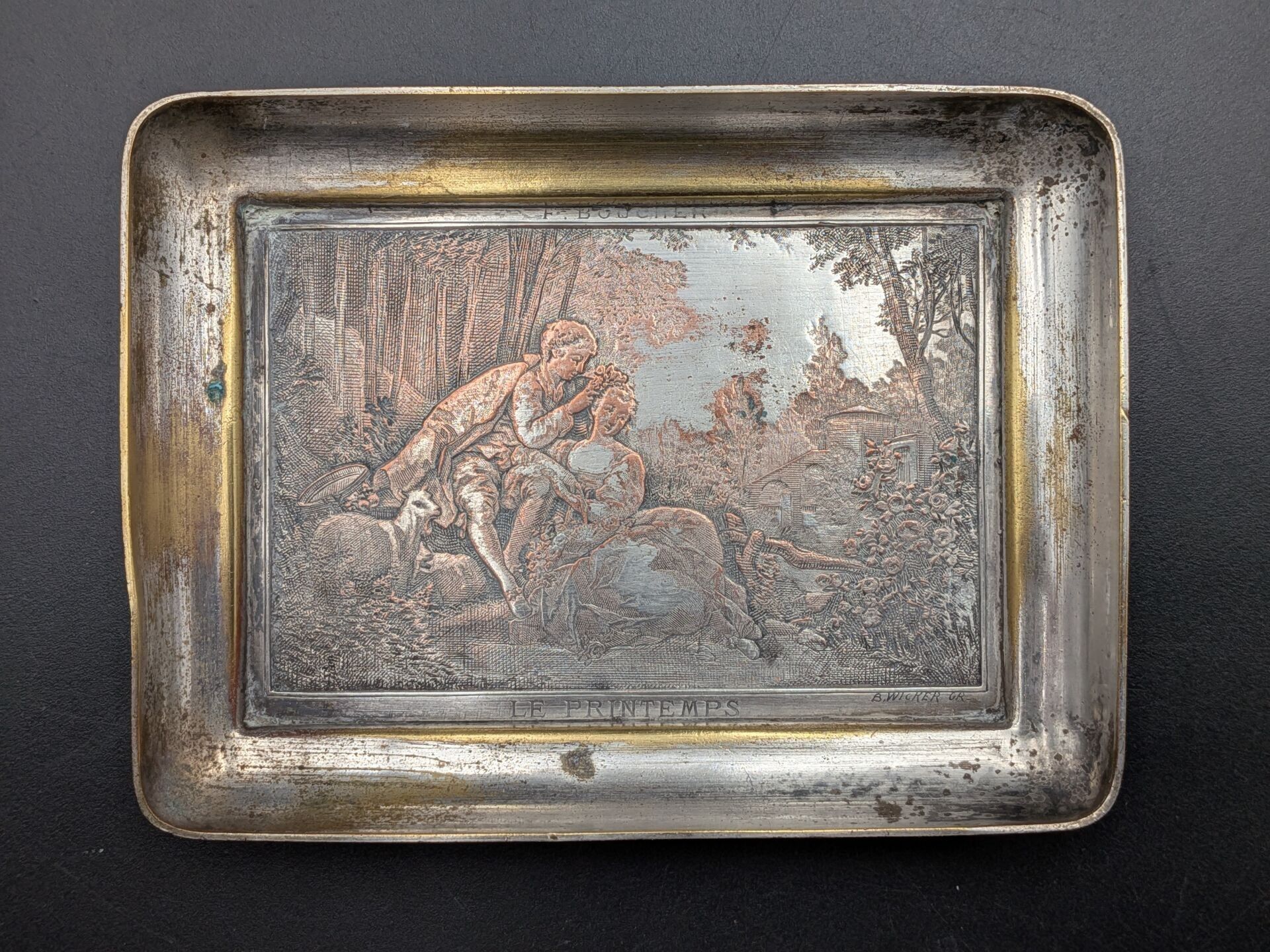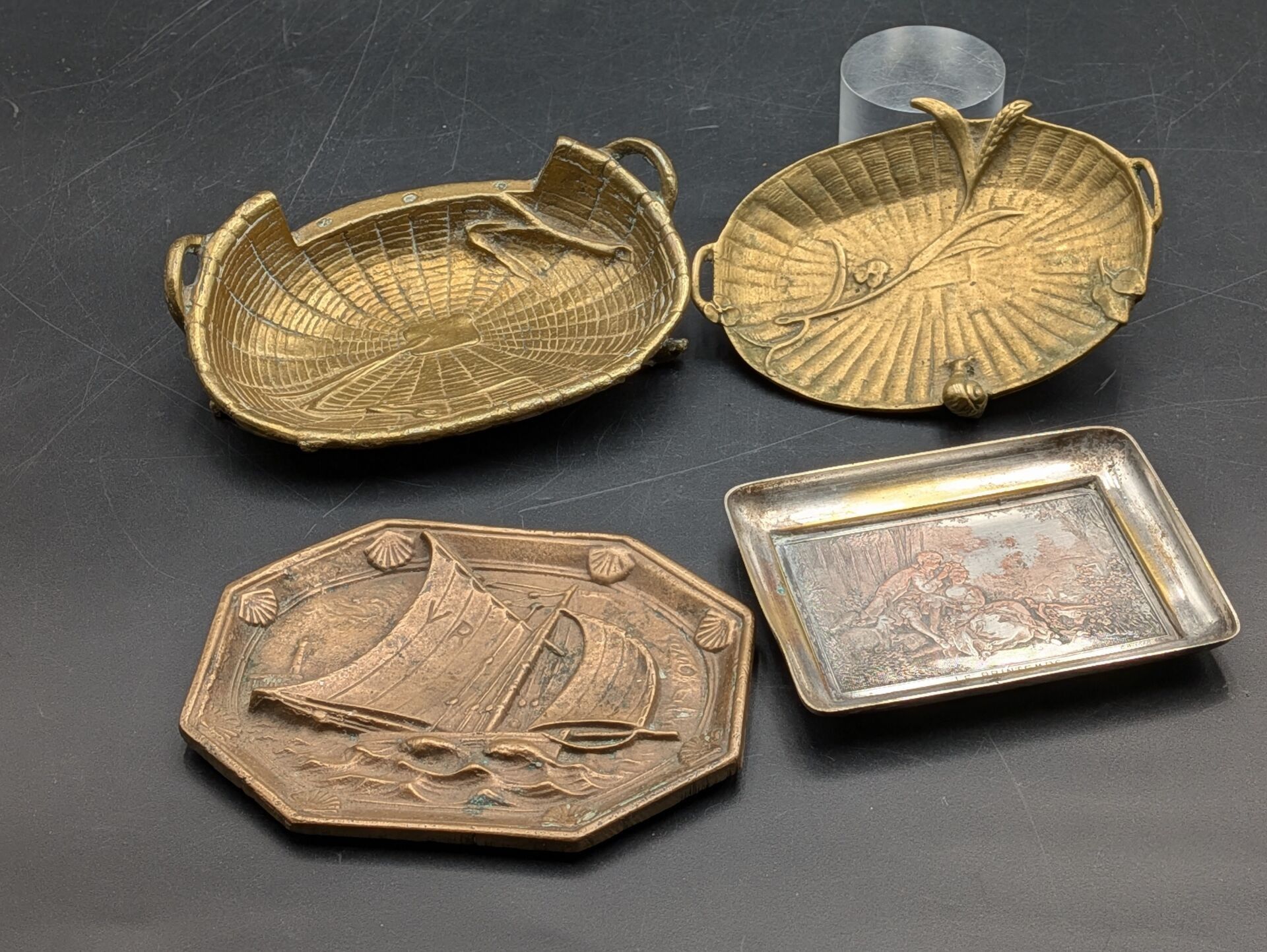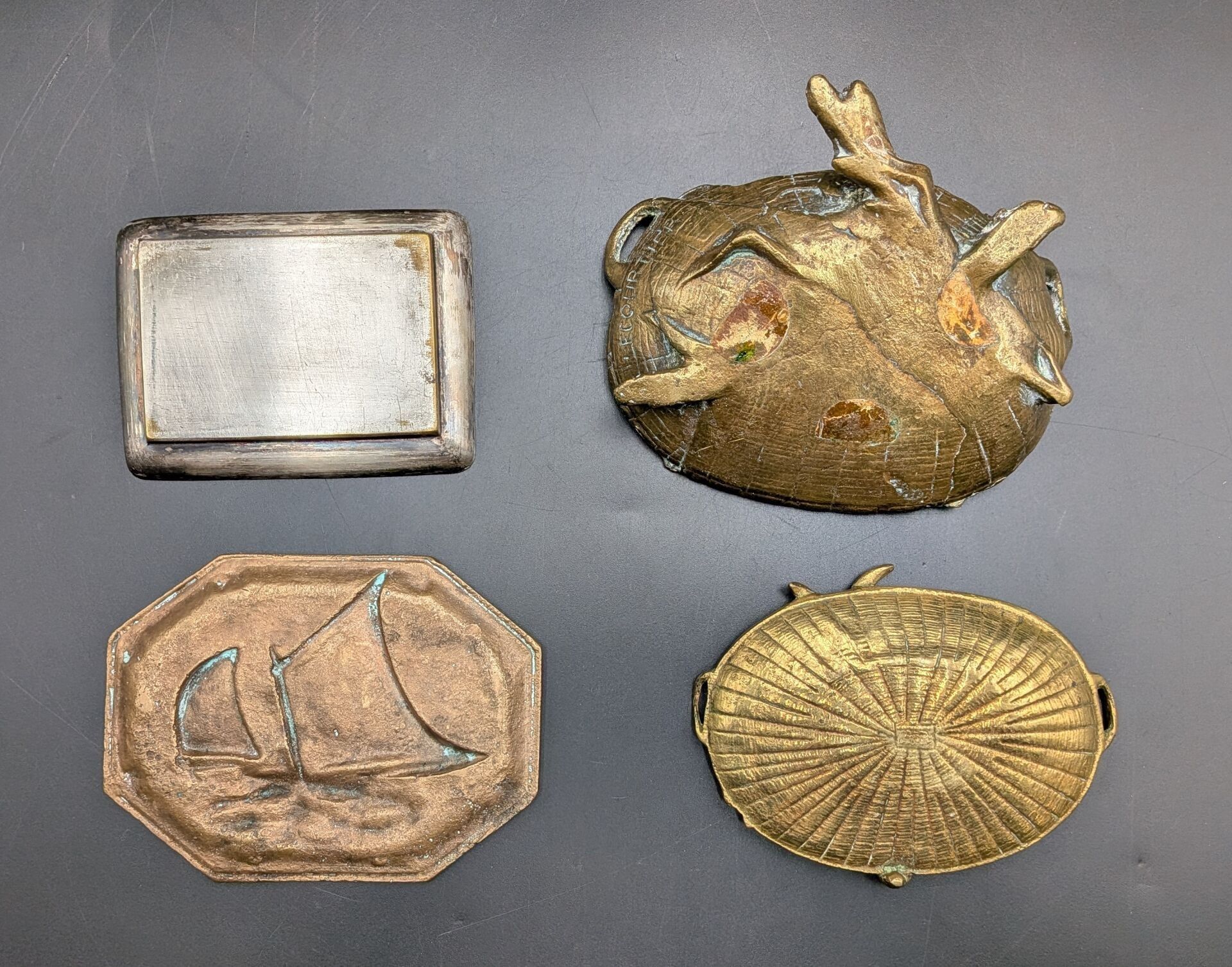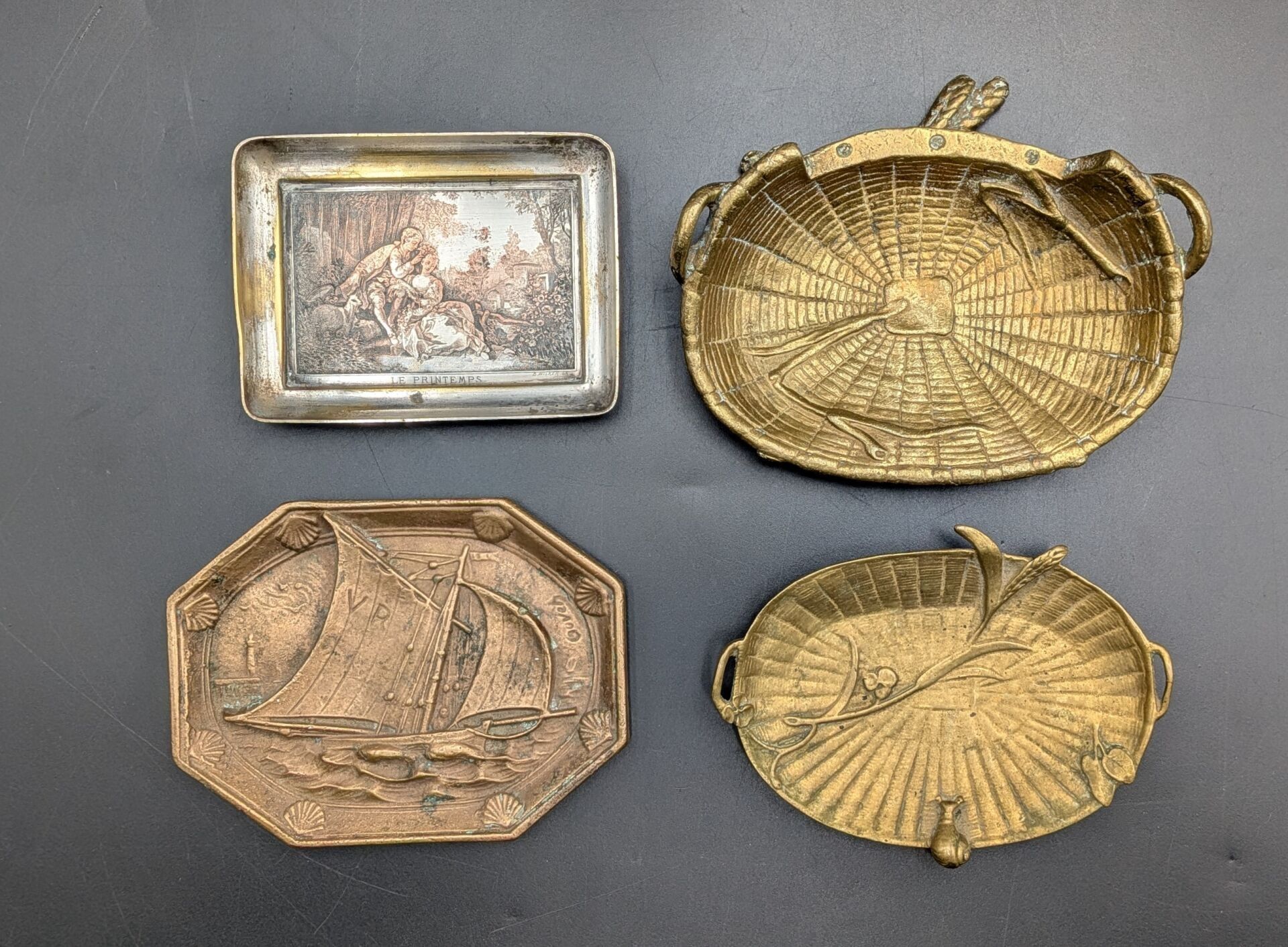 Set of 5 paper trays: one in bronze with a sailboat design (signed, 11 cm x 8.2 cm), one in bronze signed P LECOURTIER (11.5 cm x 8.5 cm), one with a snail design (11.5 cm x 7.5 cm), one in silver-plated LE PRINTEMPS signed B WICKER (9.2 cm x 6.9 cm) and one Cafés CARVALHO (LEVALLOIS PERRET factory) in boiled cardboard (10 cm x 7.4 cm).