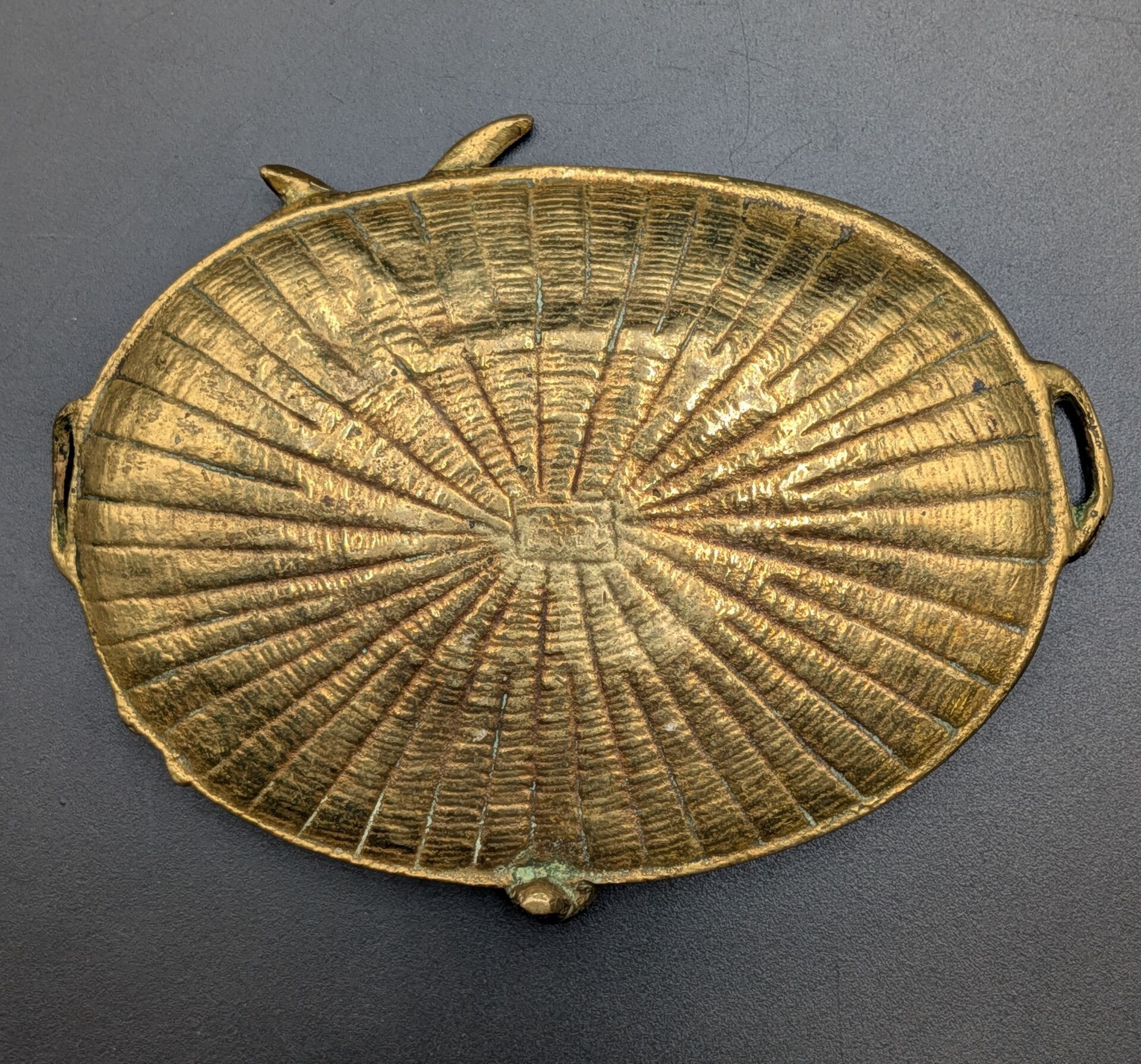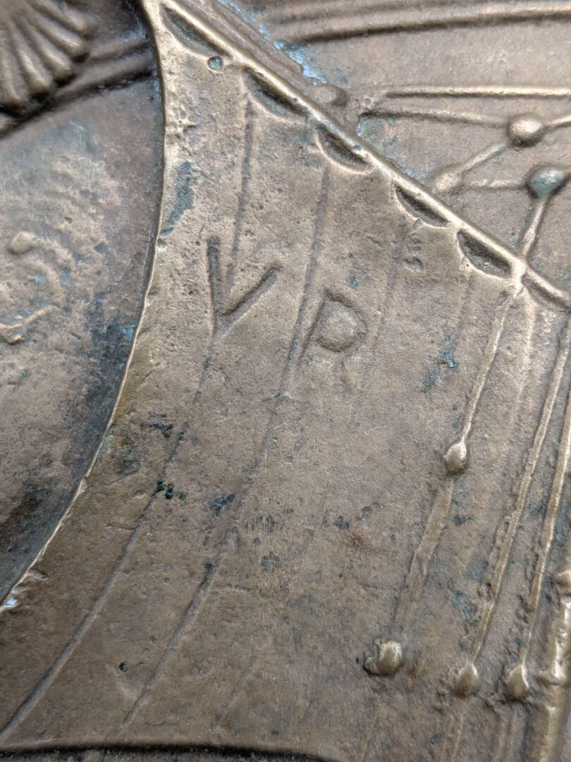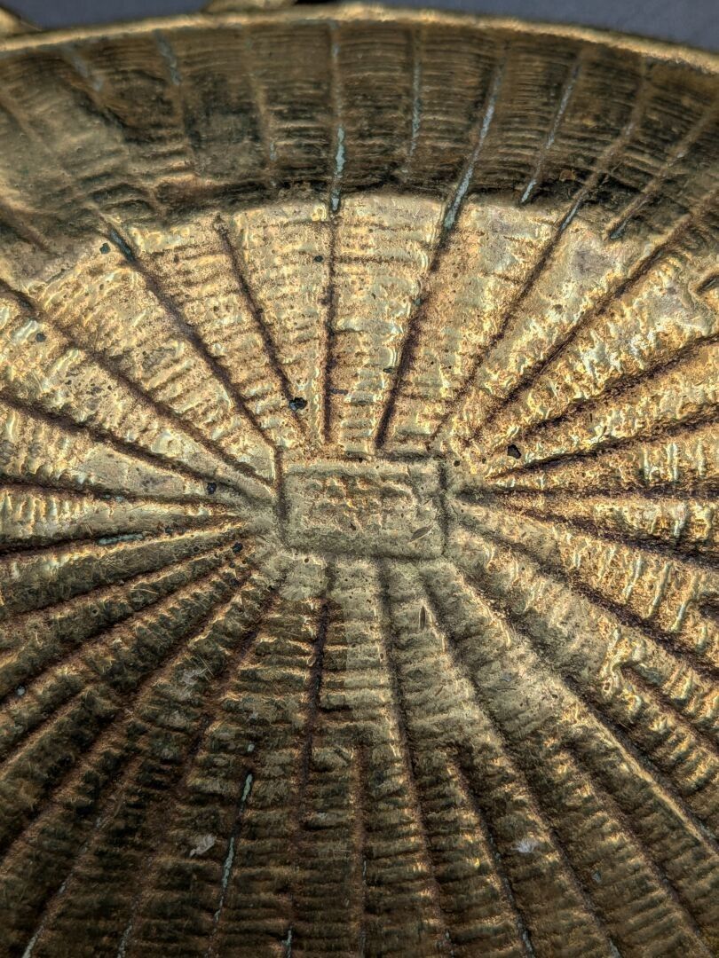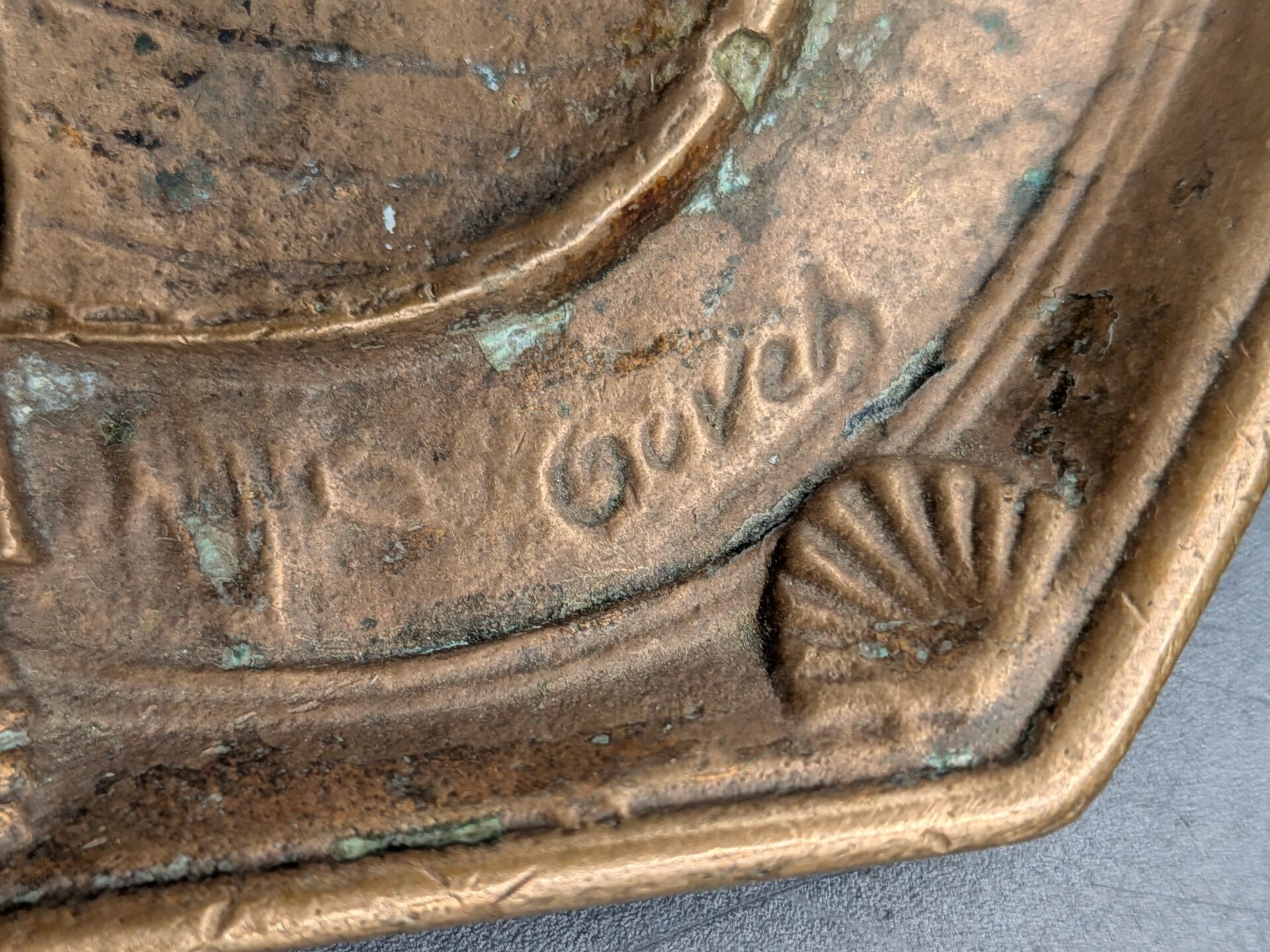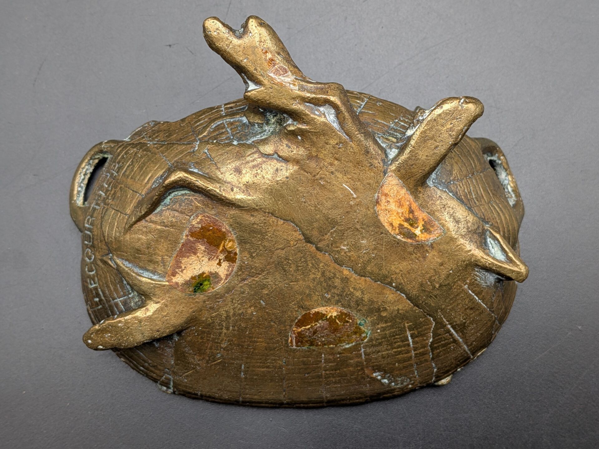 Set of 5 paper trays: one in bronze with a sailboat design (signed, 11 cm x 8.2 cm), one in bronze signed P LECOURTIER (11.5 cm x 8.5 cm), one with a snail design (11.5 cm x 7.5 cm), one in silver-plated LE PRINTEMPS signed B WICKER (9.2 cm x 6.9 cm) and one Cafés CARVALHO (LEVALLOIS PERRET factory) in boiled cardboard (10 cm x 7.4 cm).