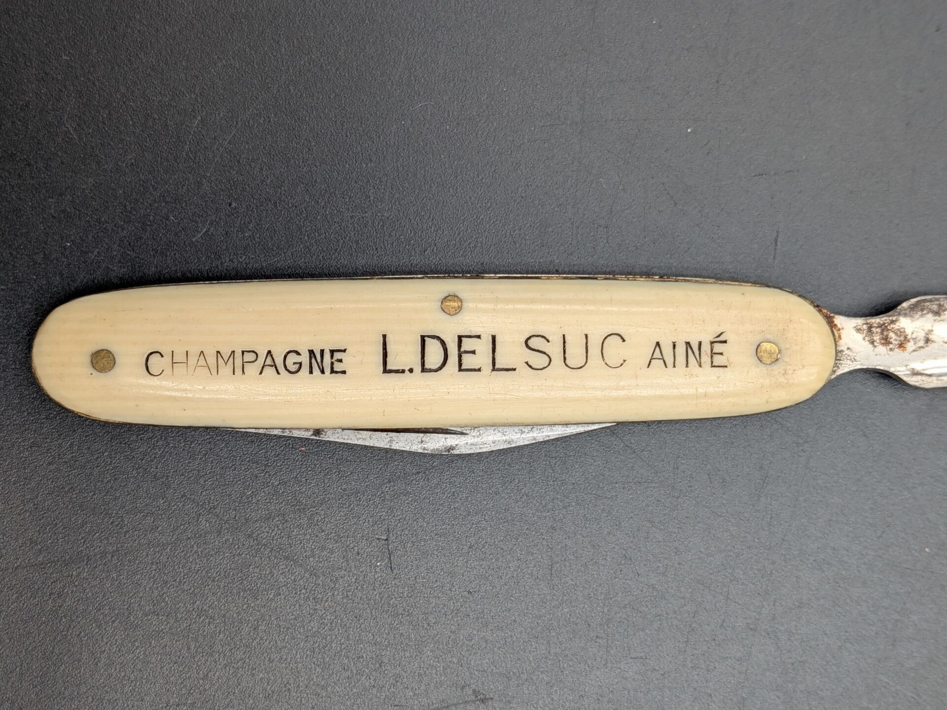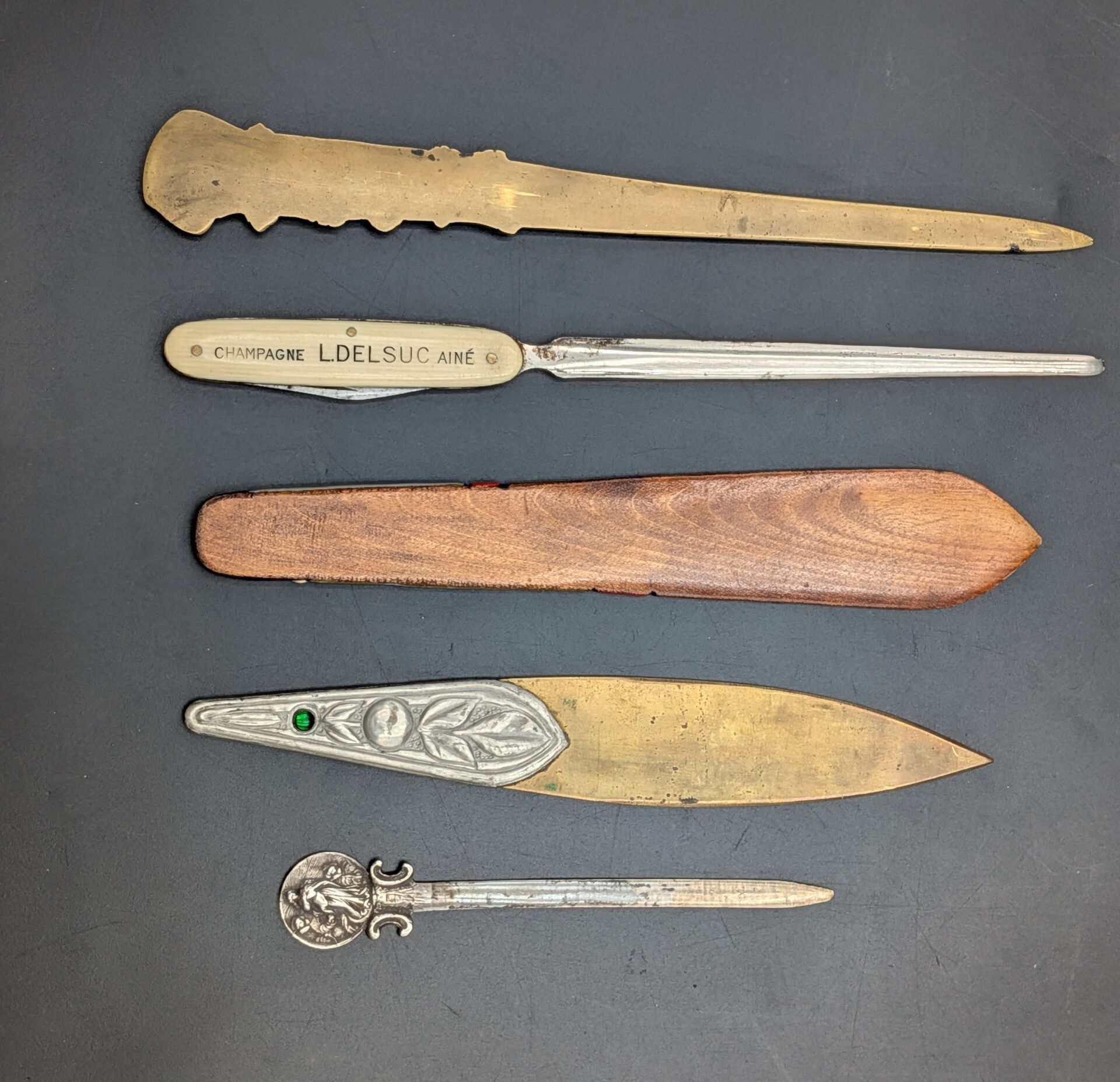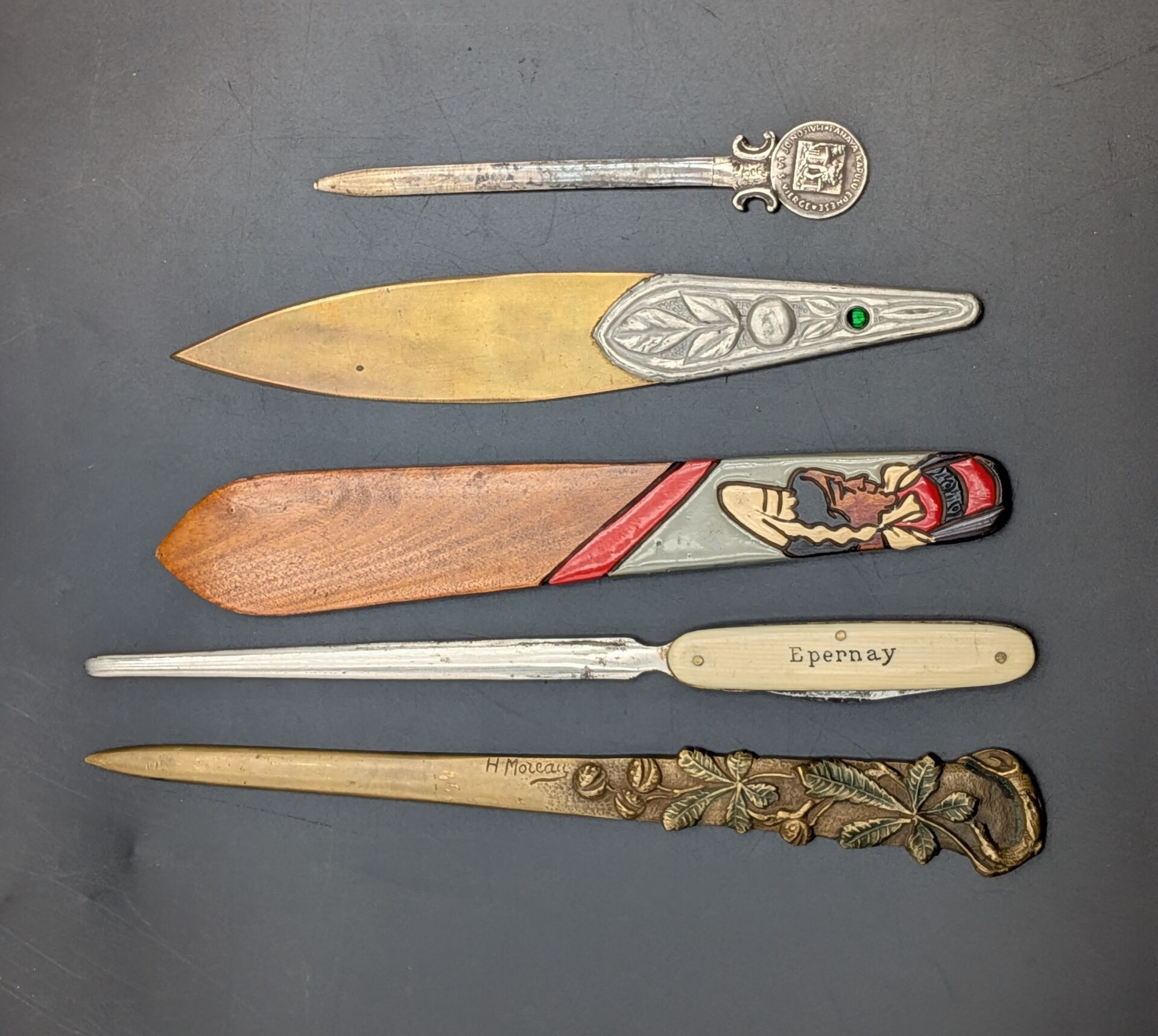 Batch of 5 paper-cutters: one in Art Nouveau bronze signed H MOREAU (L 23.4 cm), one in silver bearing the effigy of the house of the Virgin Mary TURQUIE (L 13.4 cm), one Art Deco (L 19.8 cm), one advertising champagne L DELSUC AINE in EPERNAY (L 23.2 cm) and one in wood decorated with a Breton woman (L 21 cm).