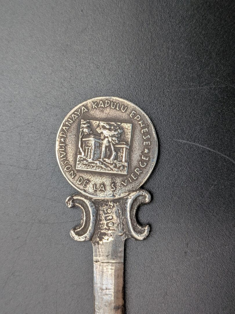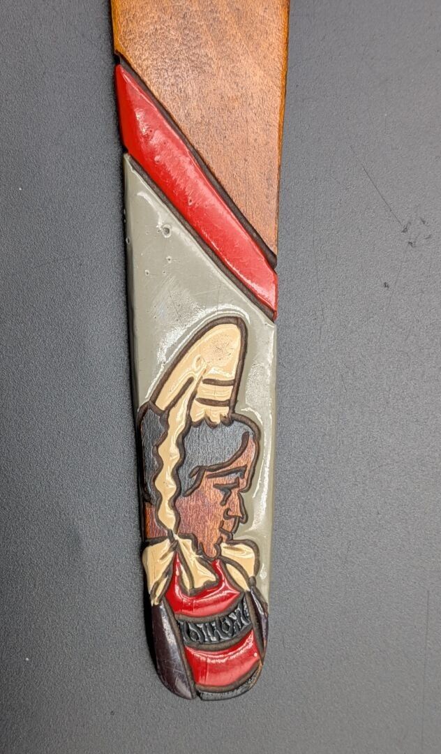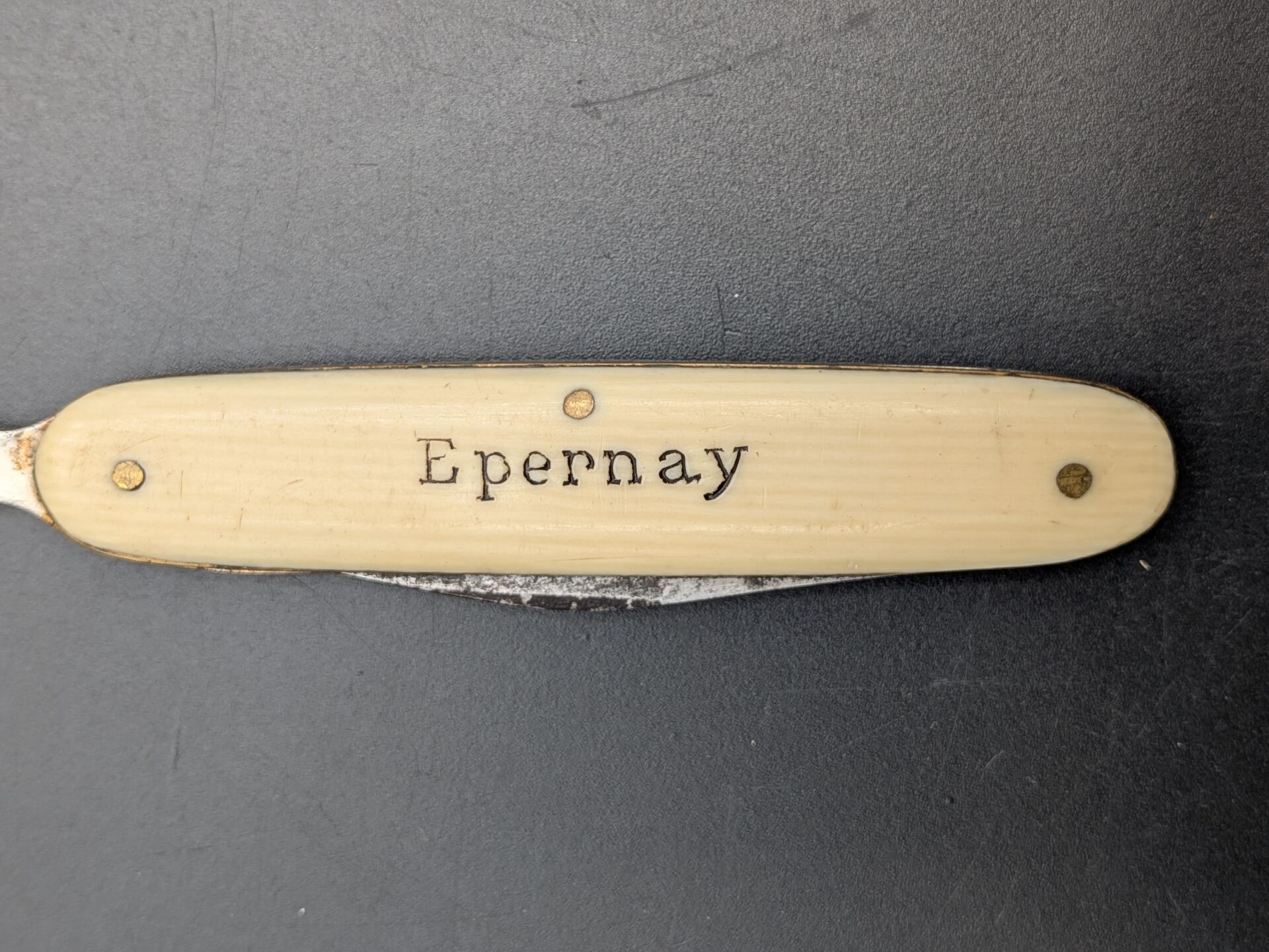 Batch of 5 paper-cutters: one in Art Nouveau bronze signed H MOREAU (L 23.4 cm), one in silver bearing the effigy of the house of the Virgin Mary TURQUIE (L 13.4 cm), one Art Deco (L 19.8 cm), one advertising champagne L DELSUC AINE in EPERNAY (L 23.2 cm) and one in wood decorated with a Breton woman (L 21 cm).